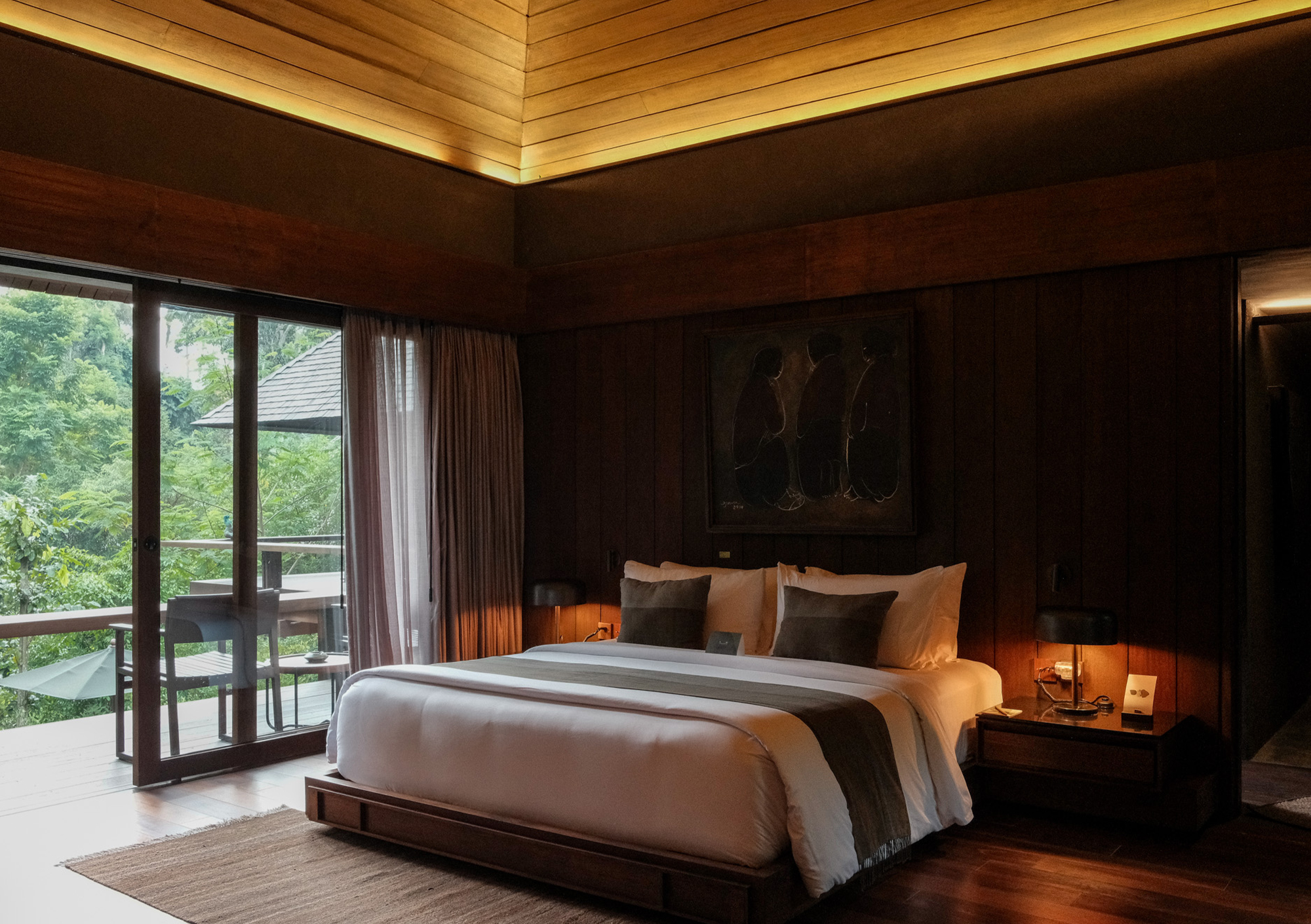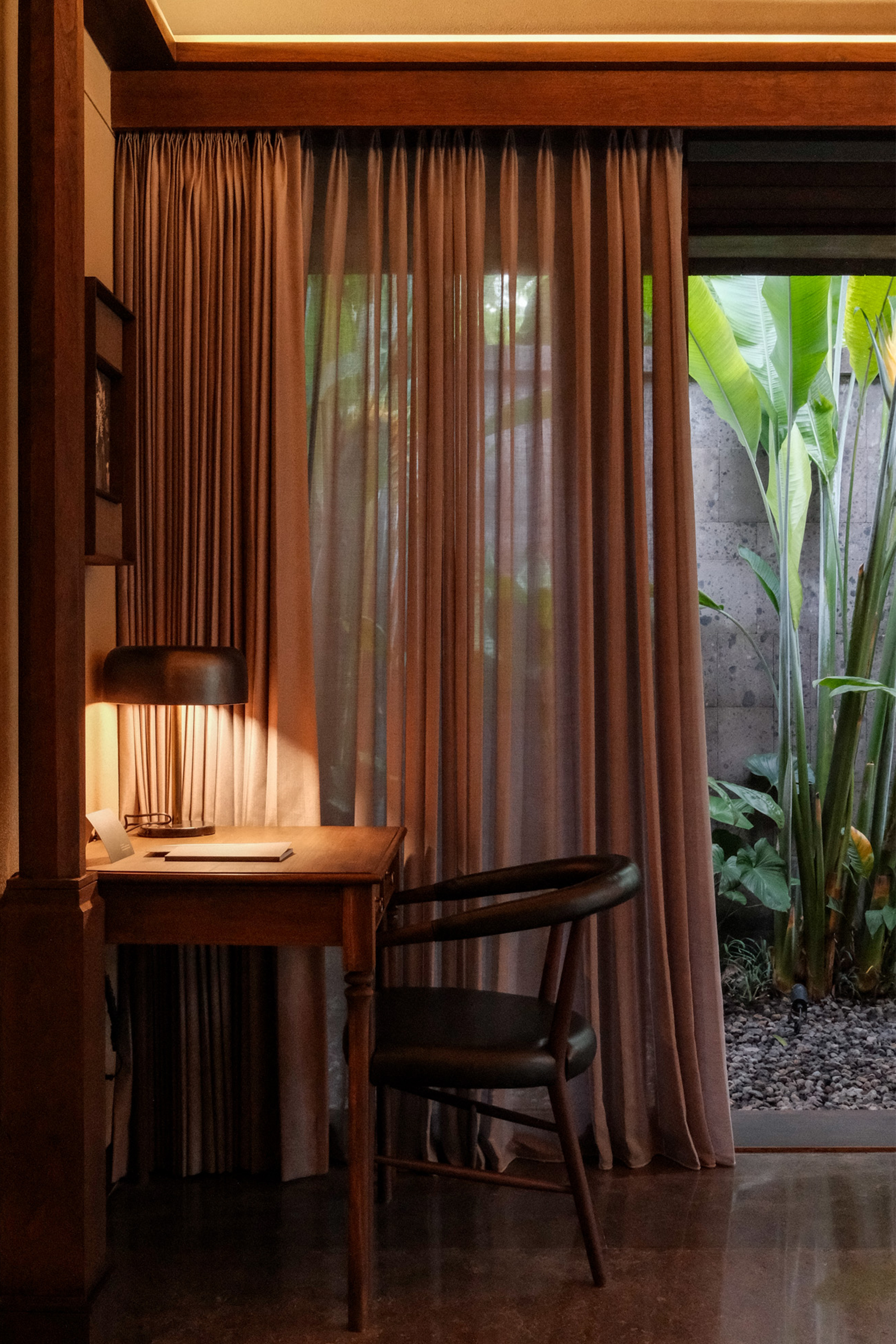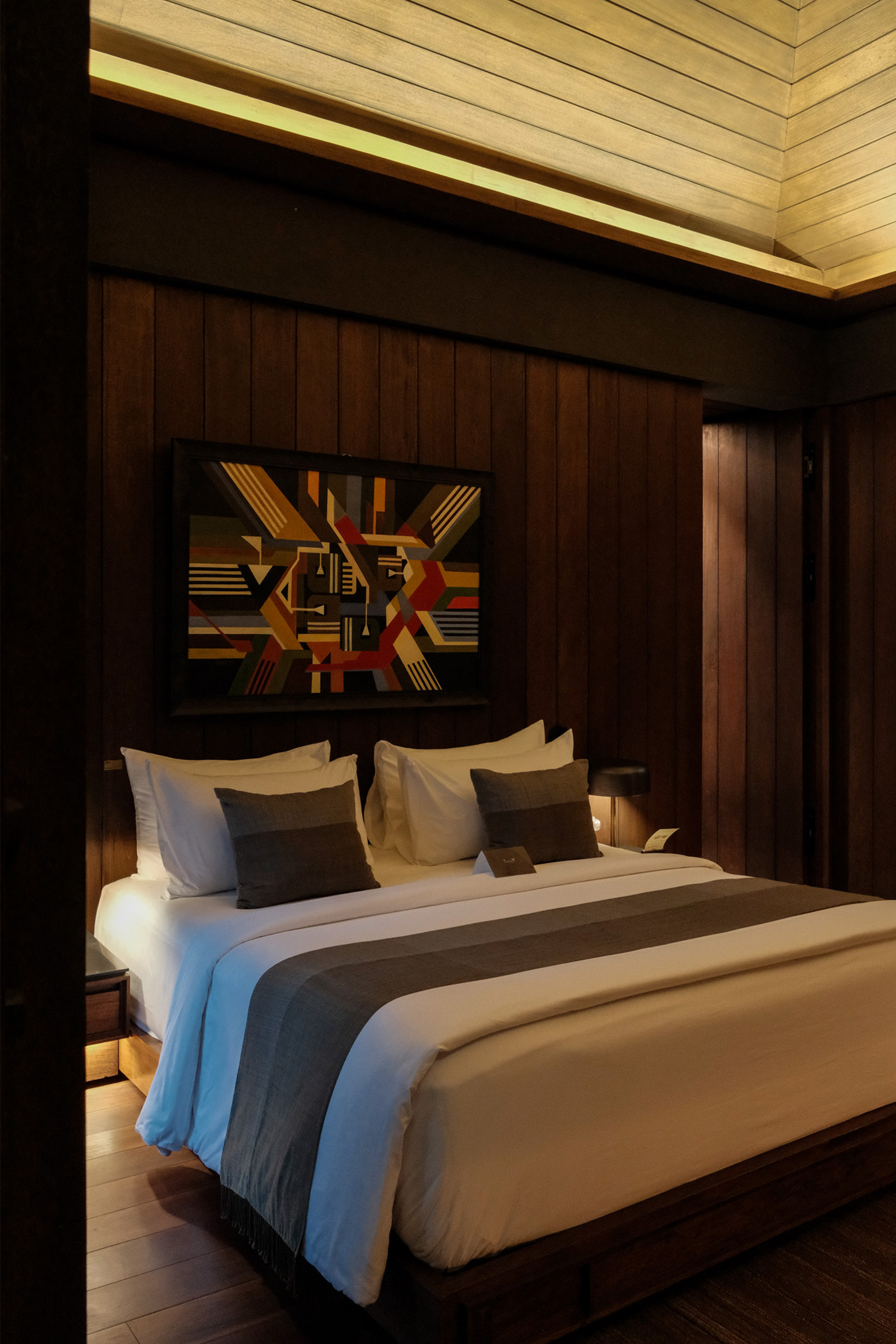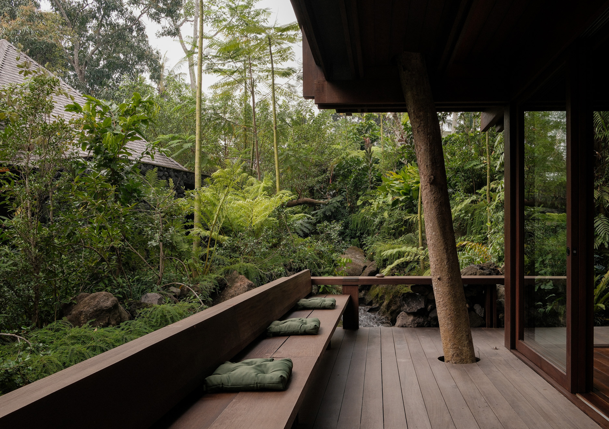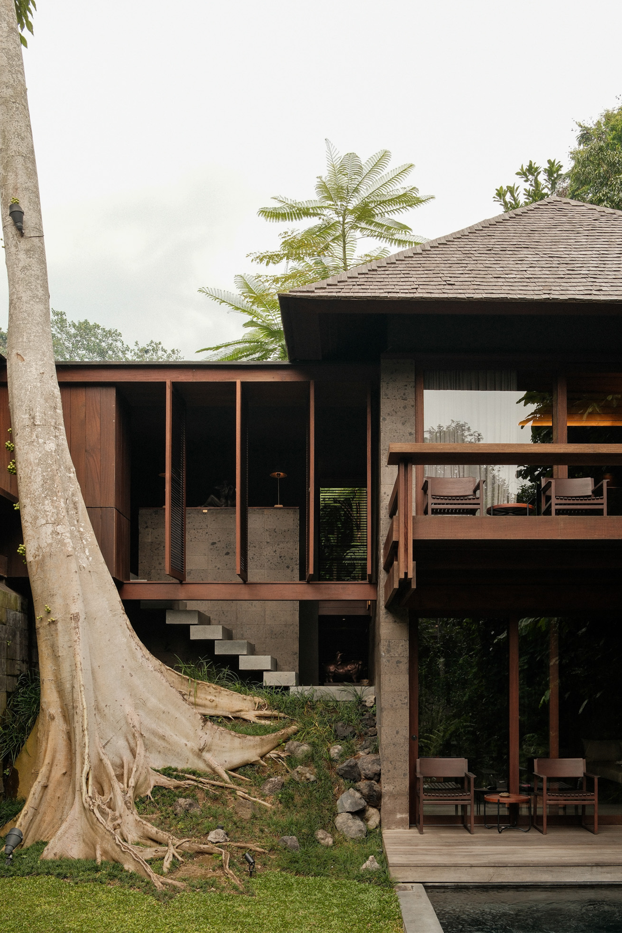Designed by Nataneka Architect in 2022 (opening December 2024), the site is bisected by a natural creek. On the high ground, the owner’s residence overlooks vistas; across the water, four villas and communal areas nestle on gentle slopes. A wooden bridge connects both worlds, while a horizontally grown tree at eye level screens the private quarters. "We added this tree deliberately," the owner states by the window. "Guests crossing the bridge now only glimpse riverlight through leaves. Amid Canggu’s architectural clamor, true challenge lies in becoming one with the environment."