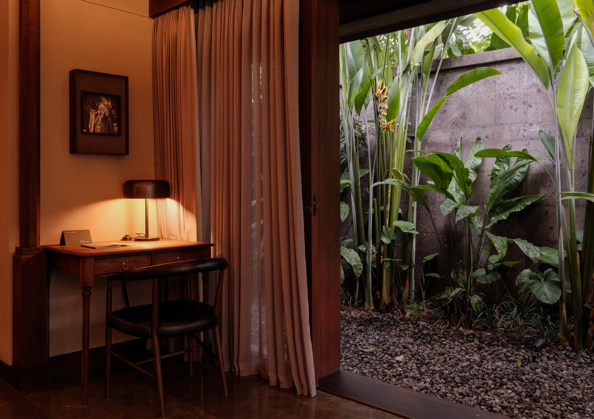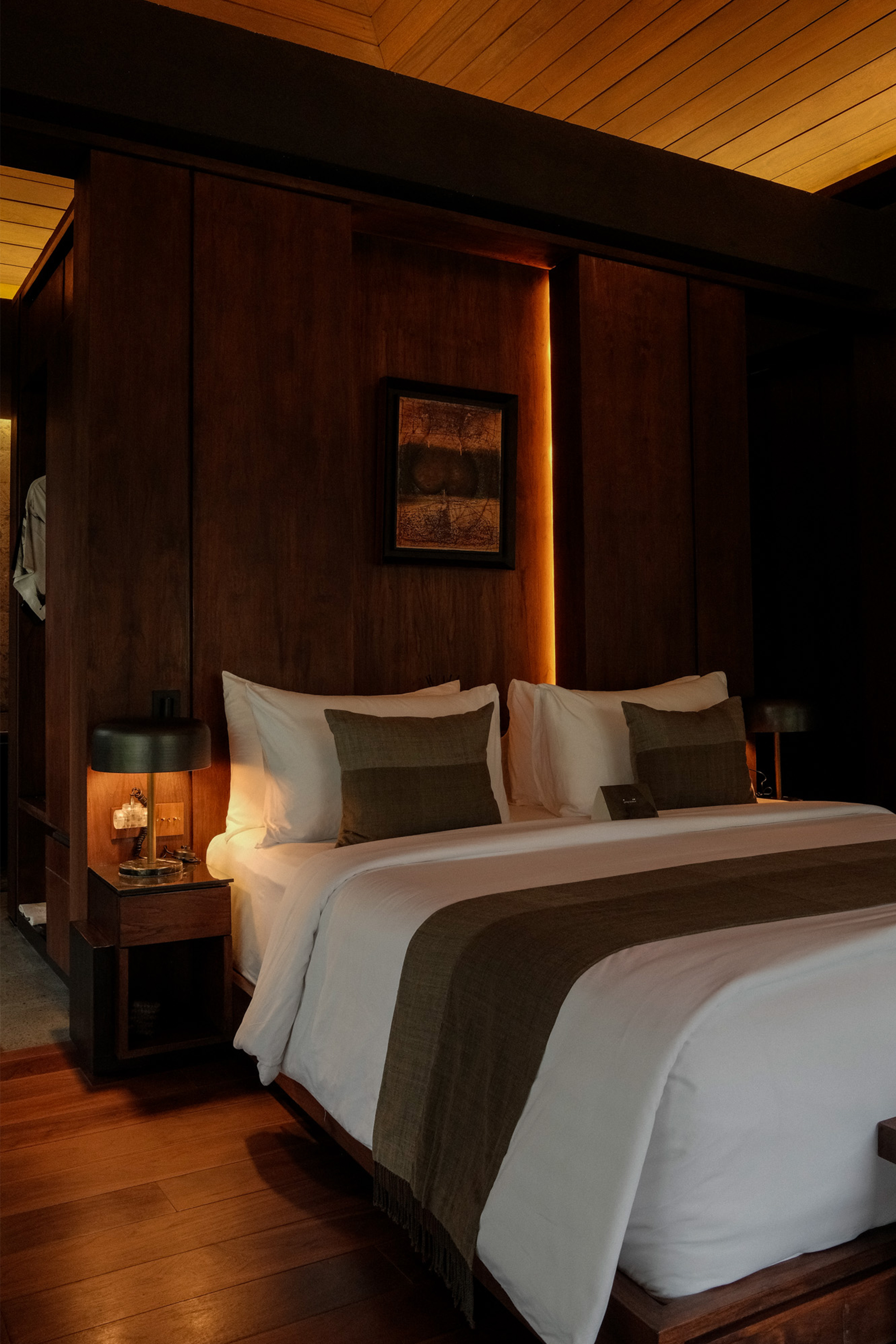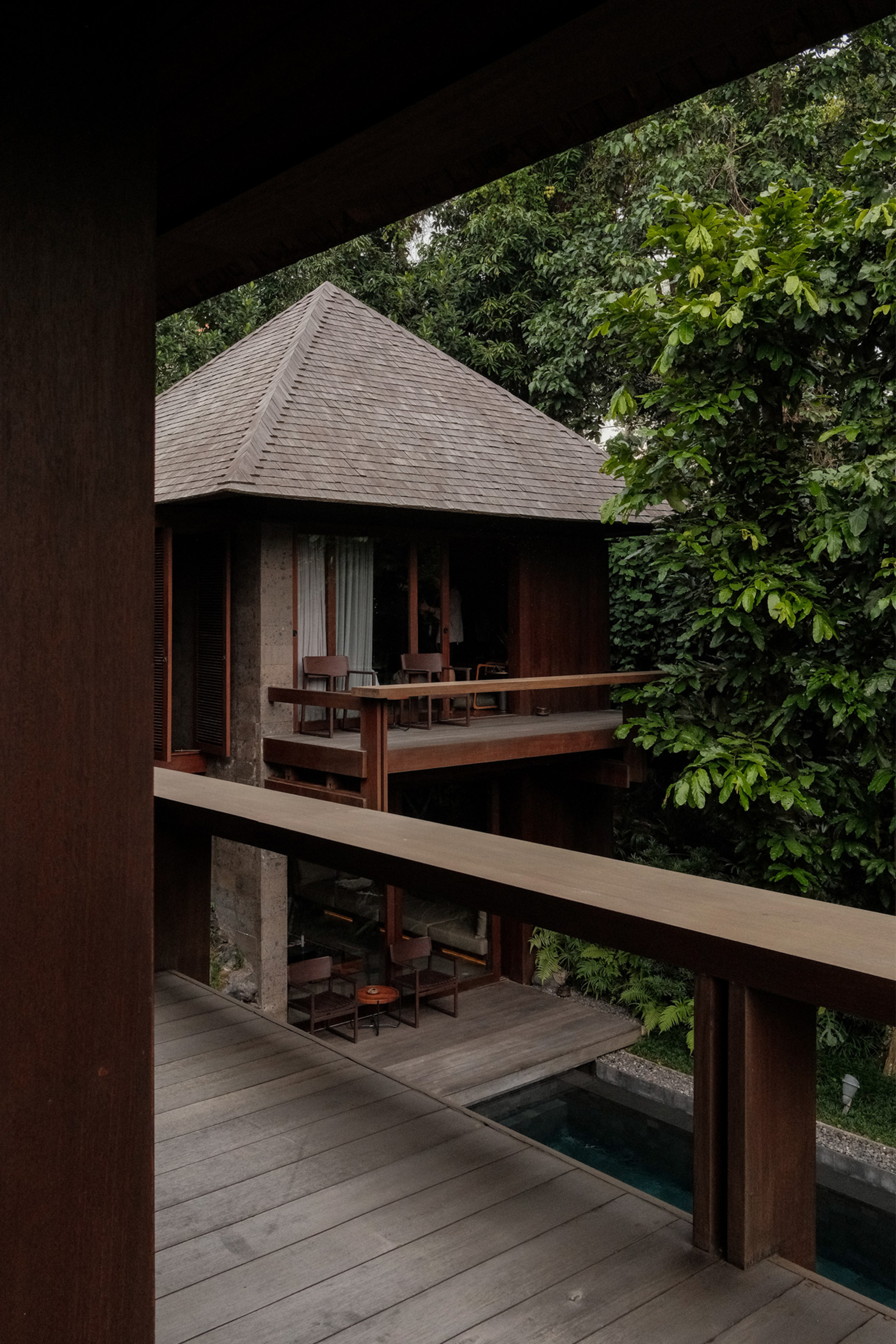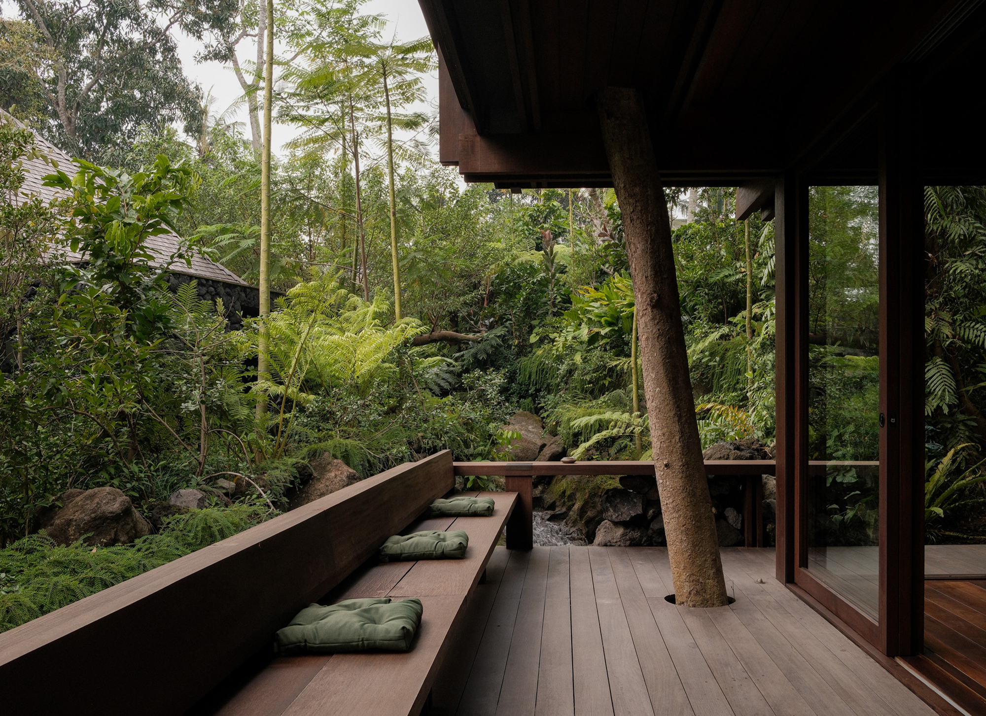 Designed by Nataneka Architect in 2022 (opening December 2024), the site is bisected by a natural creek. On the high ground, the owner’s residence overlooks vistas; across the water, four villas and communal areas nestle on gentle slopes. A wooden bridge connects both worlds, while a horizontally grown tree at eye level screens the private quarters. "We added this tree deliberately," the owner states by the window. "Guests crossing the bridge now only glimpse riverlight through leaves. Amid Canggu’s architectural clamor, true challenge lies in becoming one with the environment."