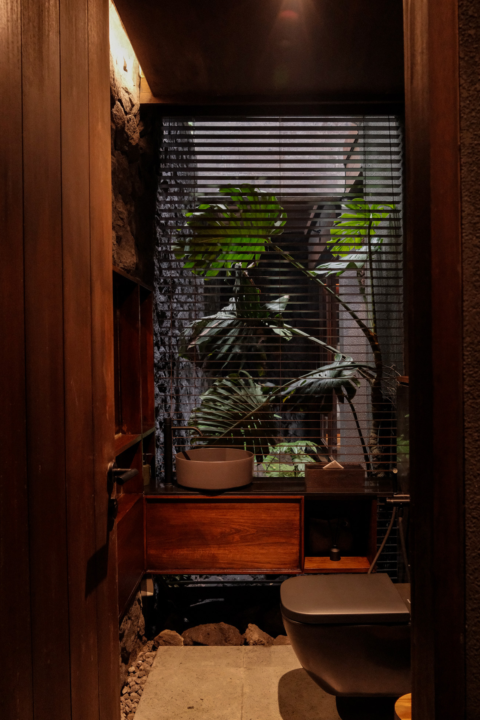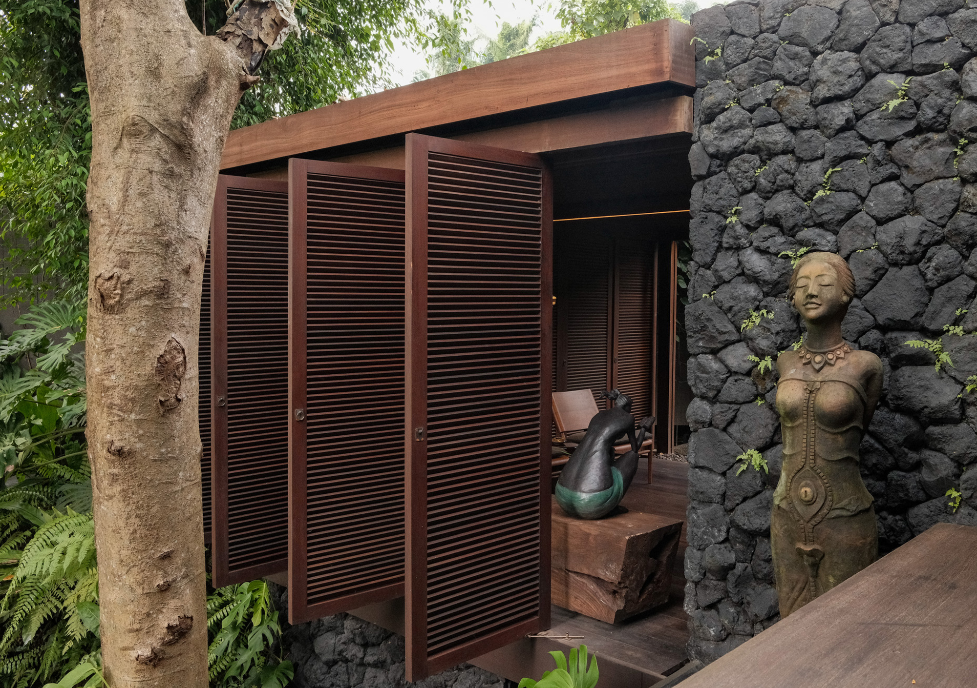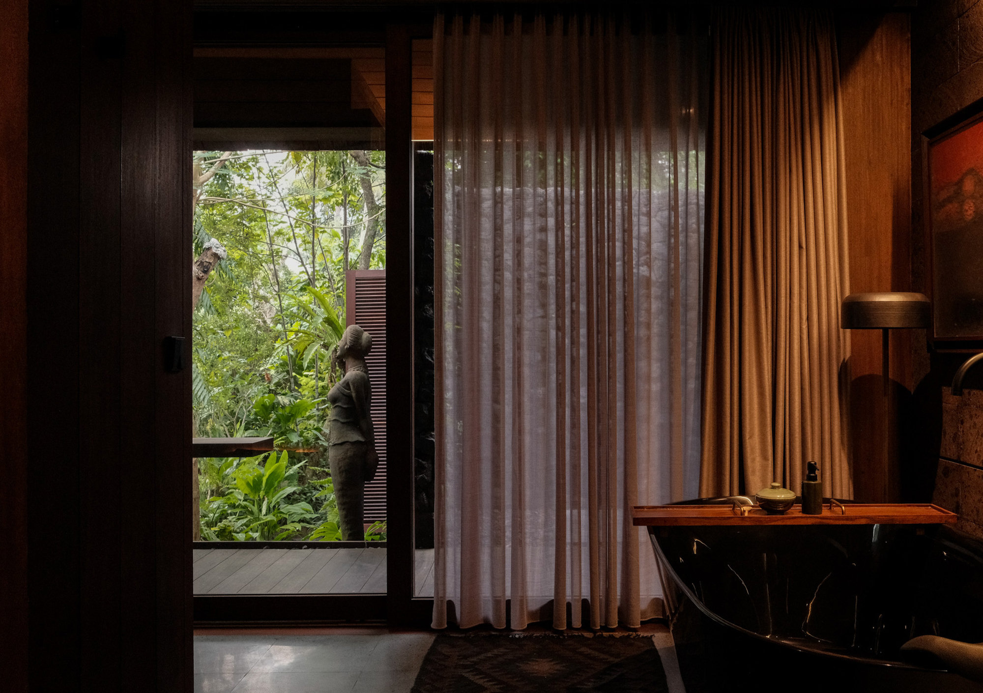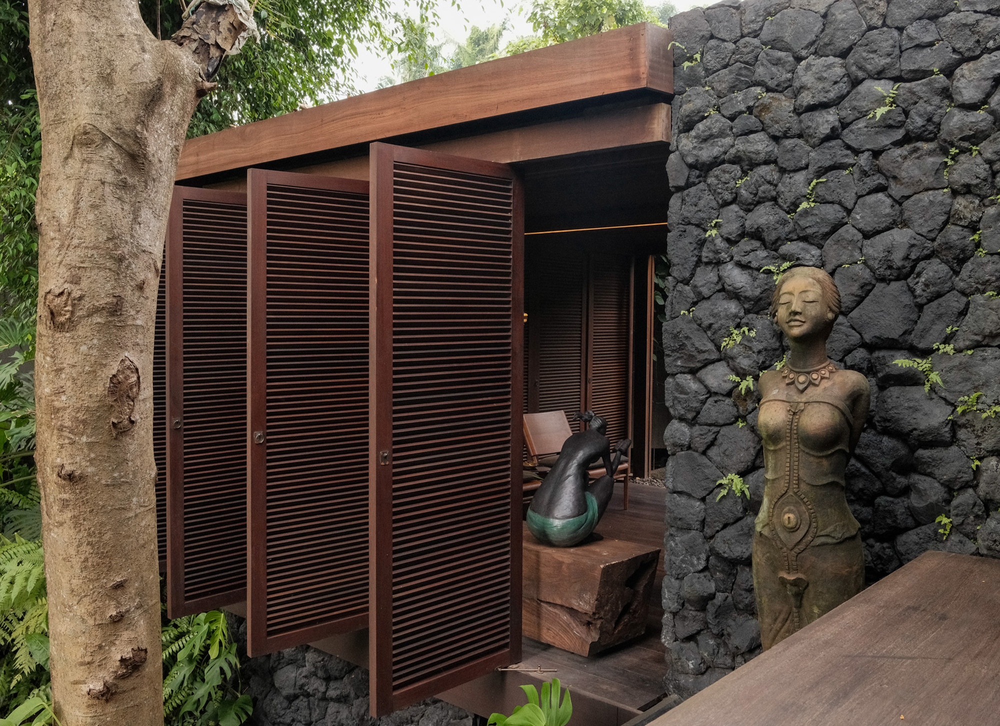 Ascending stone steps, Kiputih roots coil beyond wooden screens. Step-embedded lanterns—repurposed door handles—filter light into starry speckles. On the master terrace, the tree’s trunk rises through a dedicated opening. Morning light fractures through leaves, casting dancing patterns on linen sheets—all while its gnarkled bark sits within hand’s reach, inviting touch. Moving through spaces, art and nature whisper everywhere. Windows frame jungle into living paintings, bronze figures quietly oxidize at stairway corners, a stone goddess bathes in light at the terrace edge. These metal-and-stone beings breathe with vines on volcanic walls, witnesses to the jungle’s timeless yet fleeting beauty.