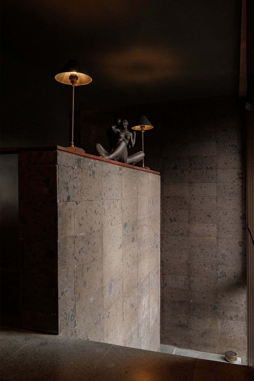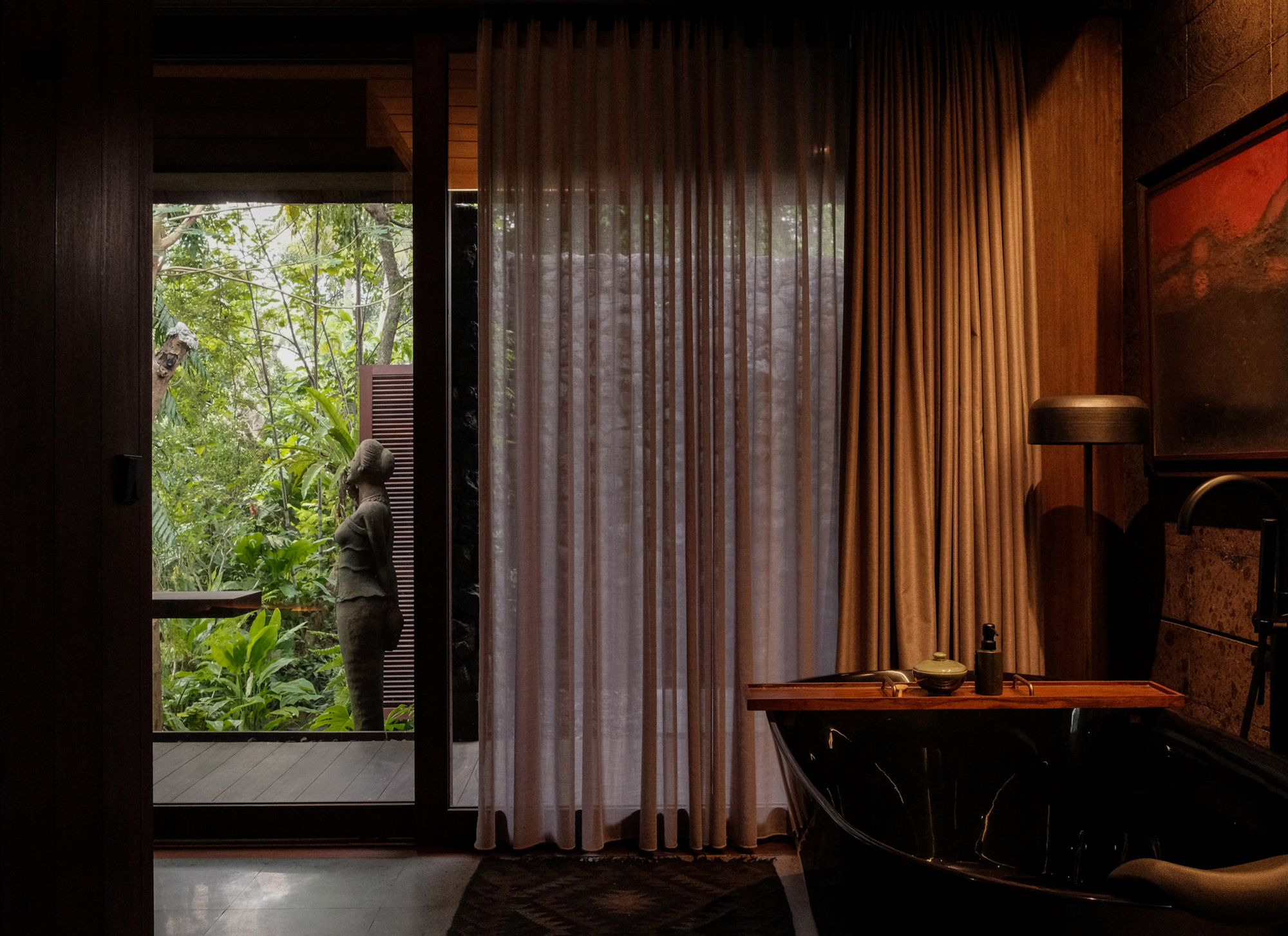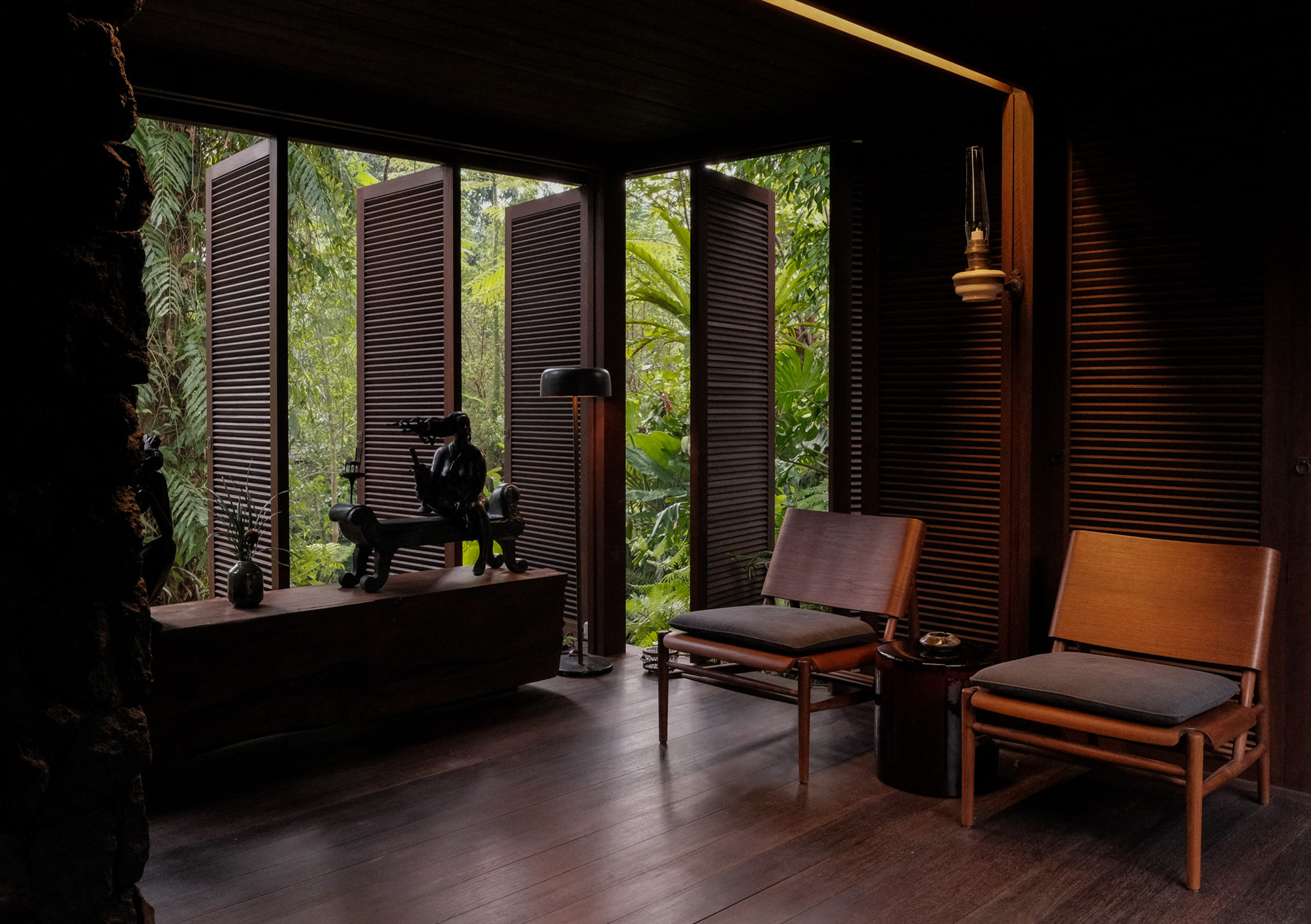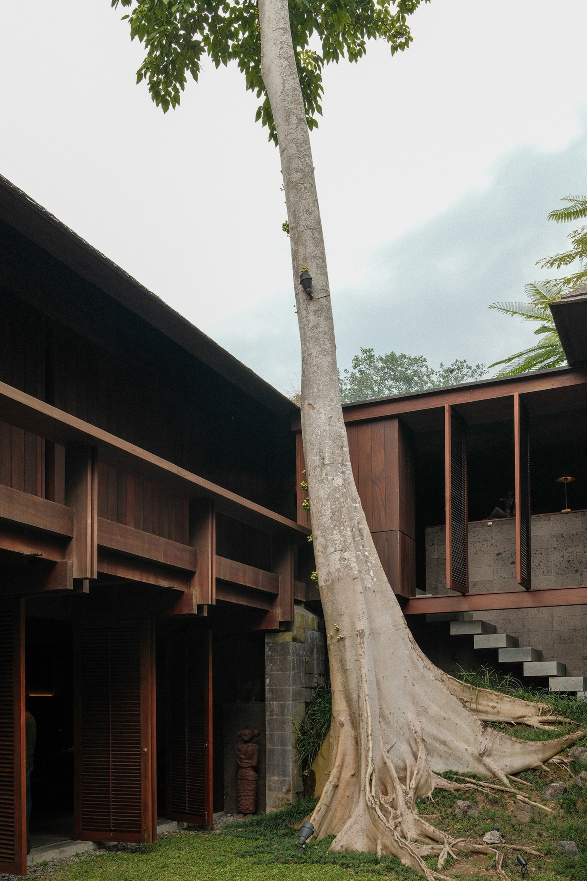 Ascending stone steps, Kiputih roots coil beyond wooden screens. Step-embedded lanterns—repurposed door handles—filter light into starry speckles. On the master terrace, the tree’s trunk rises through a dedicated opening. Morning light fractures through leaves, casting dancing patterns on linen sheets—all while its gnarkled bark sits within hand’s reach, inviting touch. Moving through spaces, art and nature whisper everywhere. Windows frame jungle into living paintings, bronze figures quietly oxidize at stairway corners, a stone goddess bathes in light at the terrace edge. These metal-and-stone beings breathe with vines on volcanic walls, witnesses to the jungle’s timeless yet fleeting beauty.