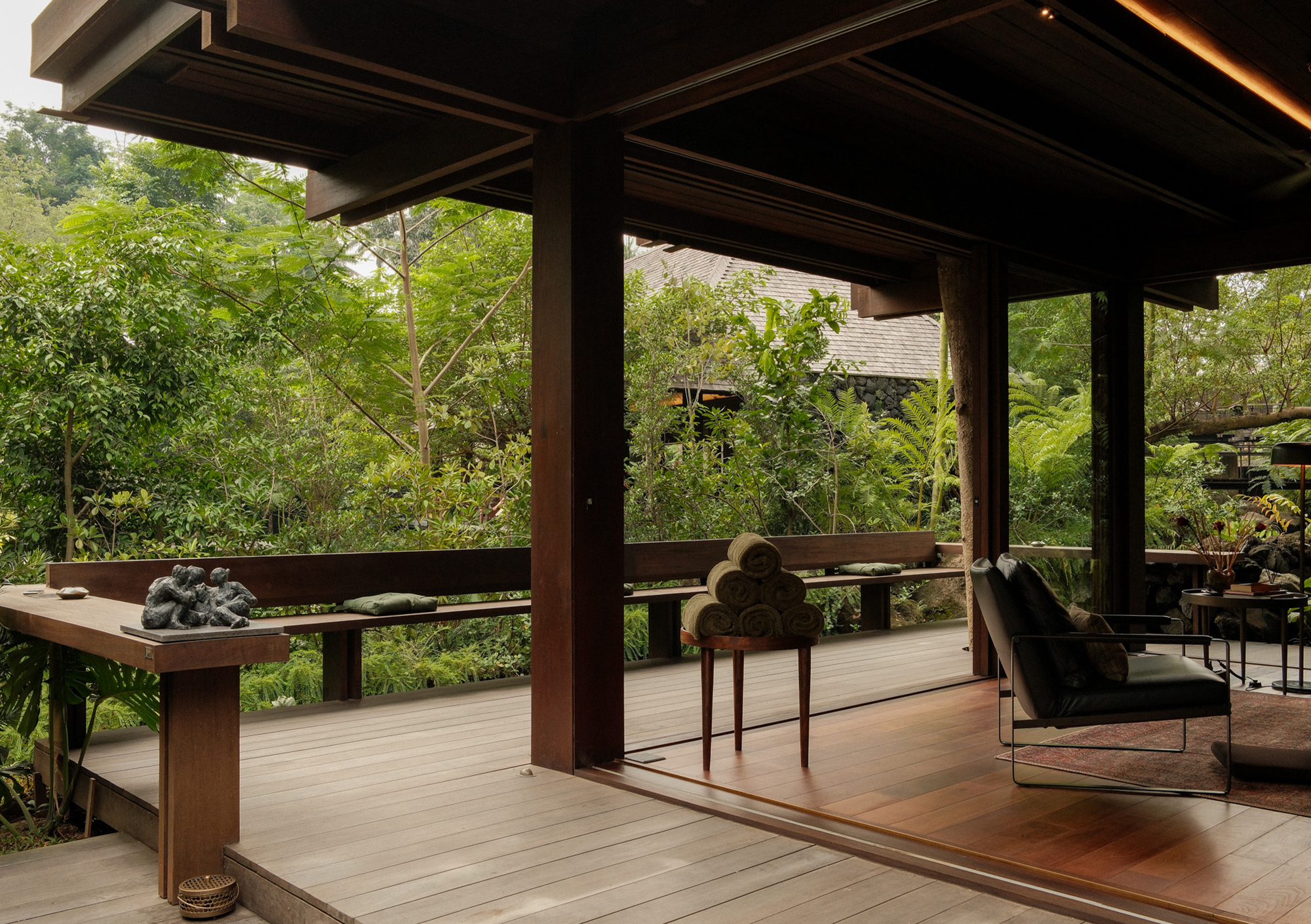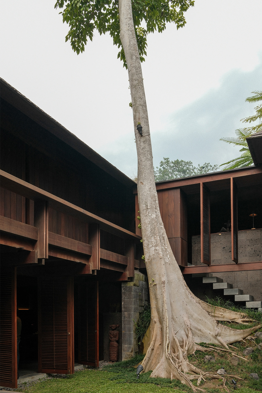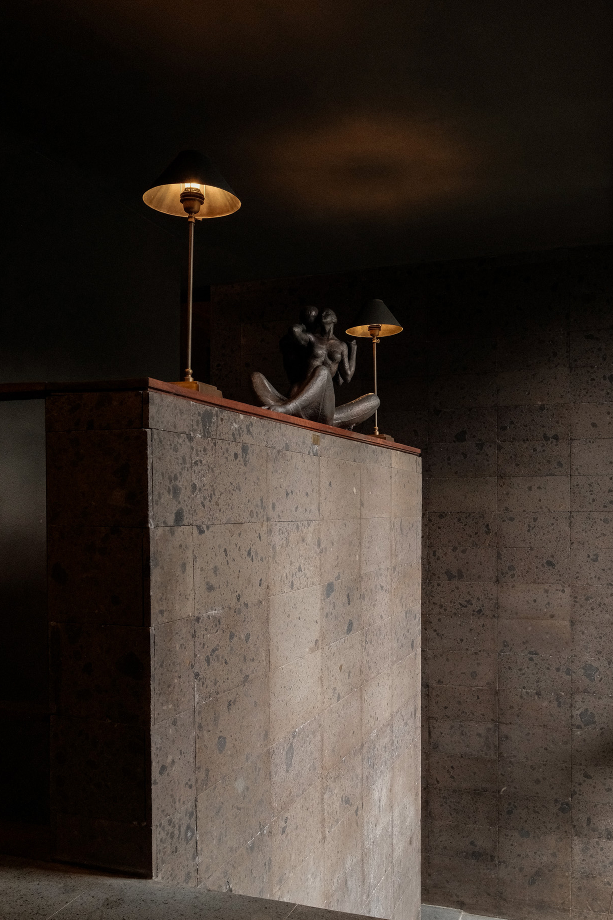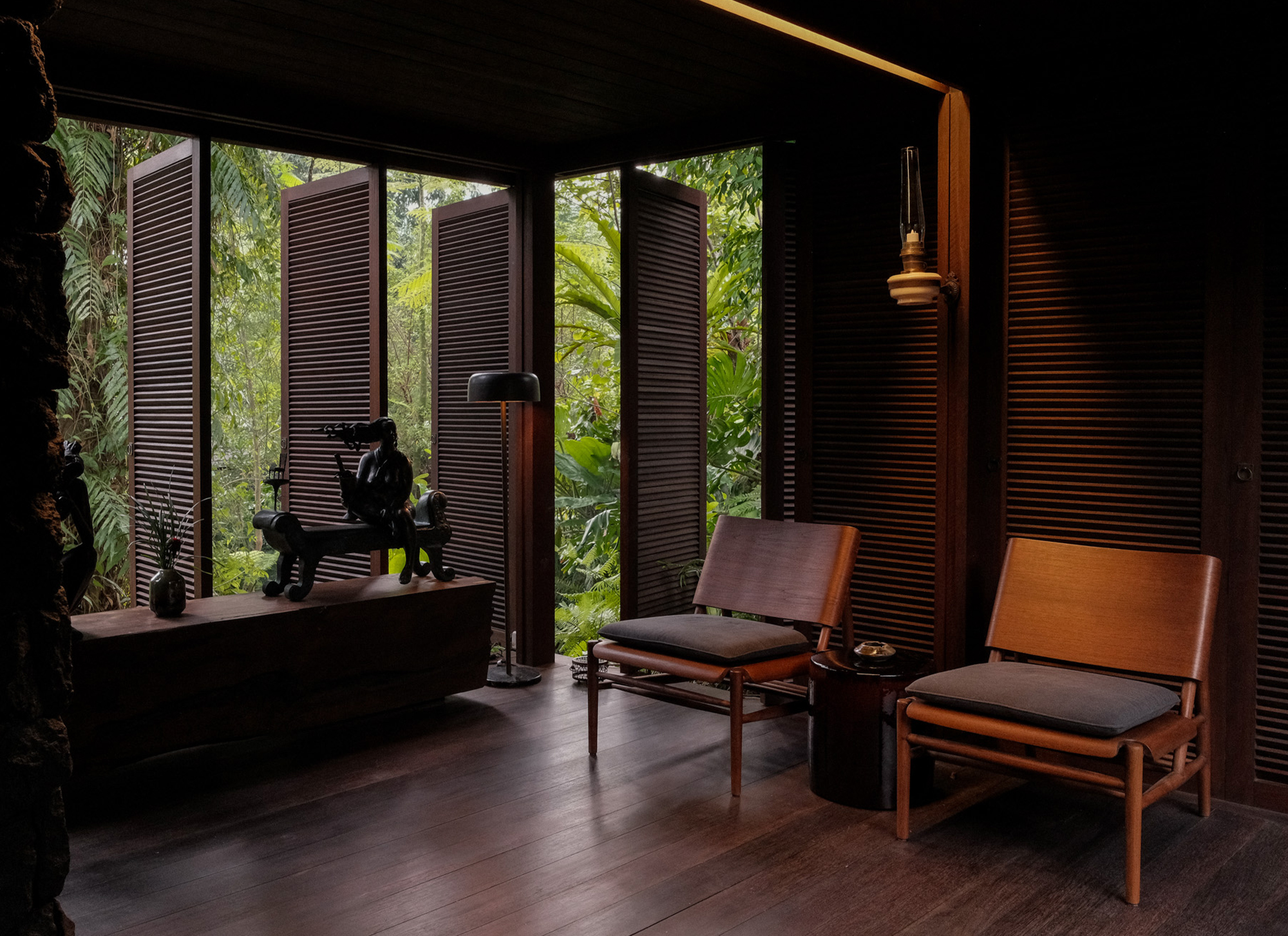 Ascending stone steps, Kiputih roots coil beyond wooden screens. Step-embedded lanterns—repurposed door handles—filter light into starry speckles. On the master terrace, the tree’s trunk rises through a dedicated opening. Morning light fractures through leaves, casting dancing patterns on linen sheets—all while its gnarkled bark sits within hand’s reach, inviting touch. Moving through spaces, art and nature whisper everywhere. Windows frame jungle into living paintings, bronze figures quietly oxidize at stairway corners, a stone goddess bathes in light at the terrace edge. These metal-and-stone beings breathe with vines on volcanic walls, witnesses to the jungle’s timeless yet fleeting beauty.