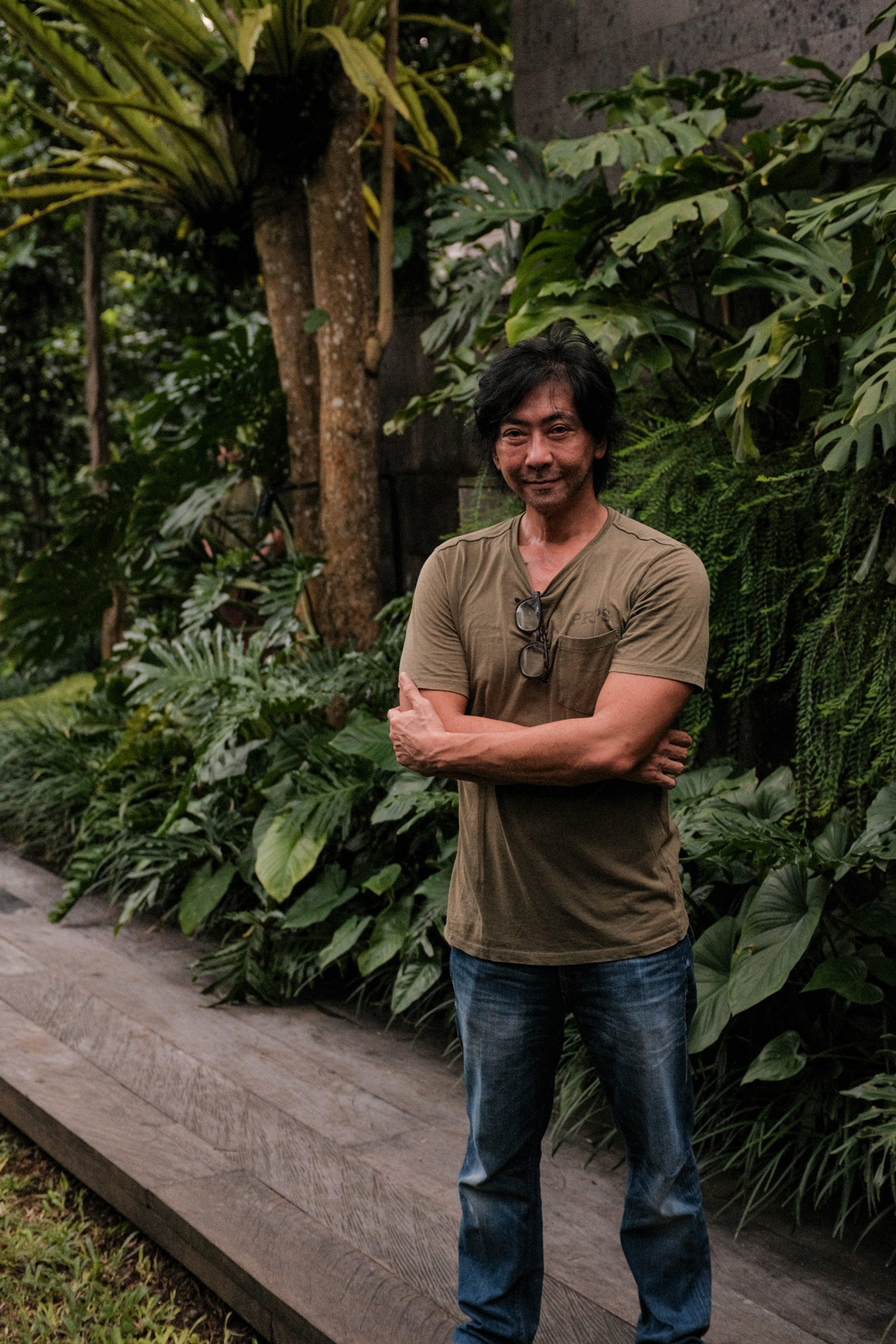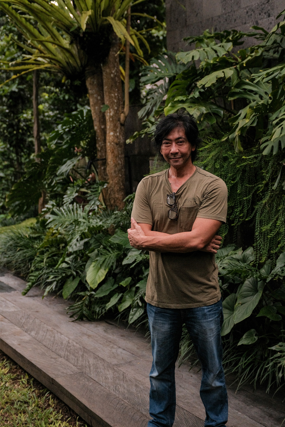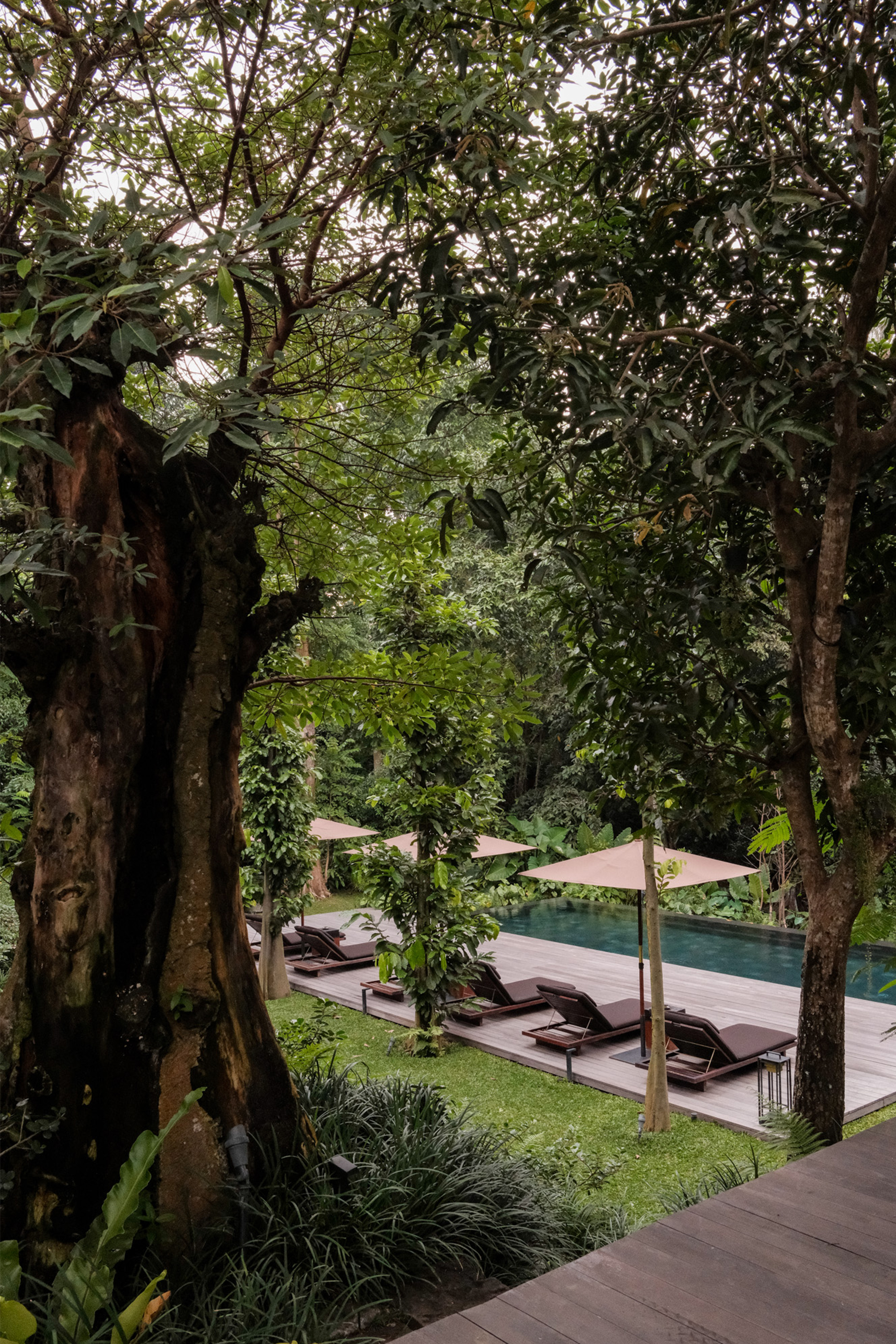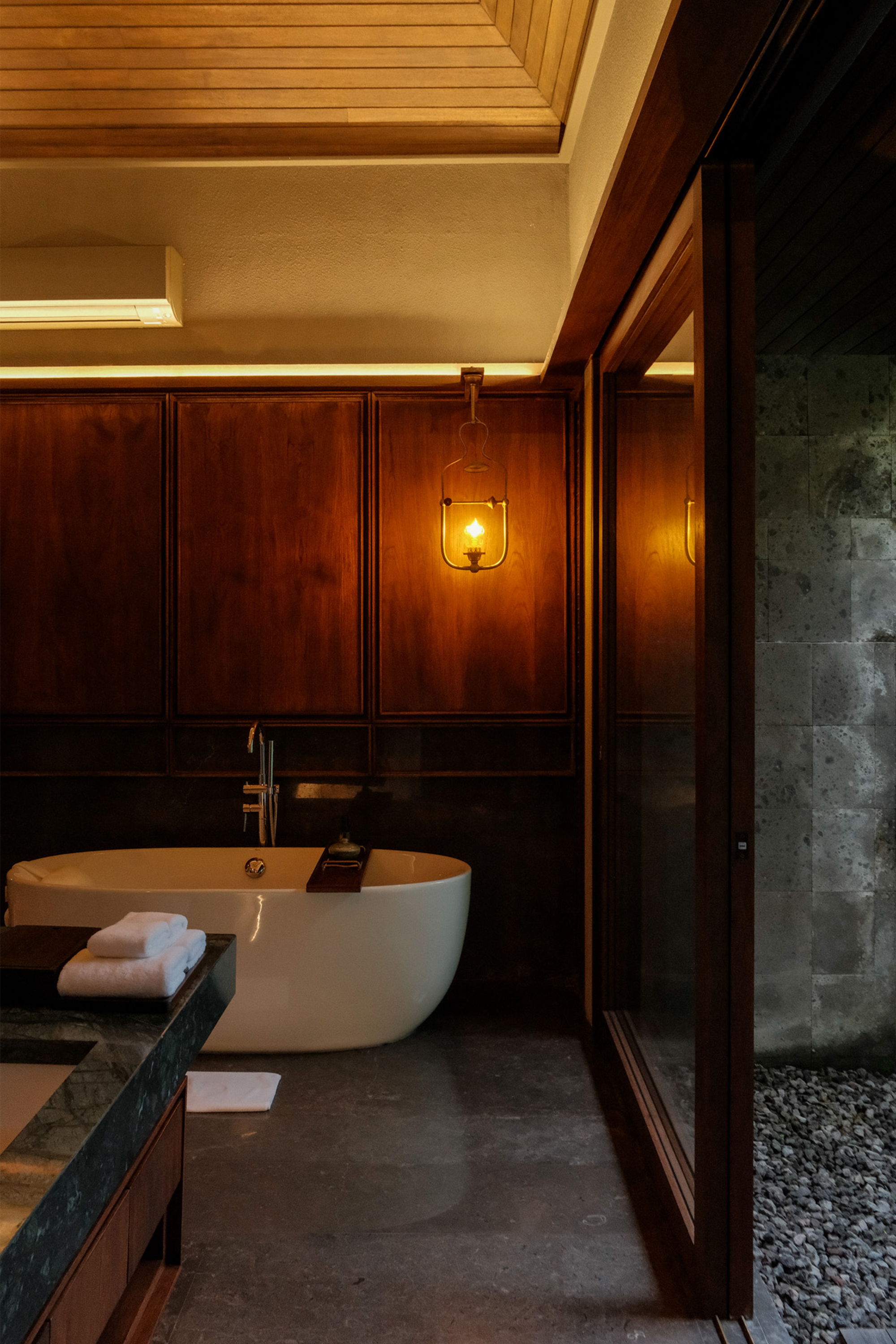 Ascending stone steps, Kiputih roots coil beyond wooden screens. Step-embedded lanterns—repurposed door handles—filter light into starry speckles. On the master terrace, the tree’s trunk rises through a dedicated opening. Morning light fractures through leaves, casting dancing patterns on linen sheets—all while its gnarkled bark sits within hand’s reach, inviting touch. Moving through spaces, art and nature whisper everywhere. Windows frame jungle into living paintings, bronze figures quietly oxidize at stairway corners, a stone goddess bathes in light at the terrace edge. These metal-and-stone beings breathe with vines on volcanic walls, witnesses to the jungle’s timeless yet fleeting beauty.