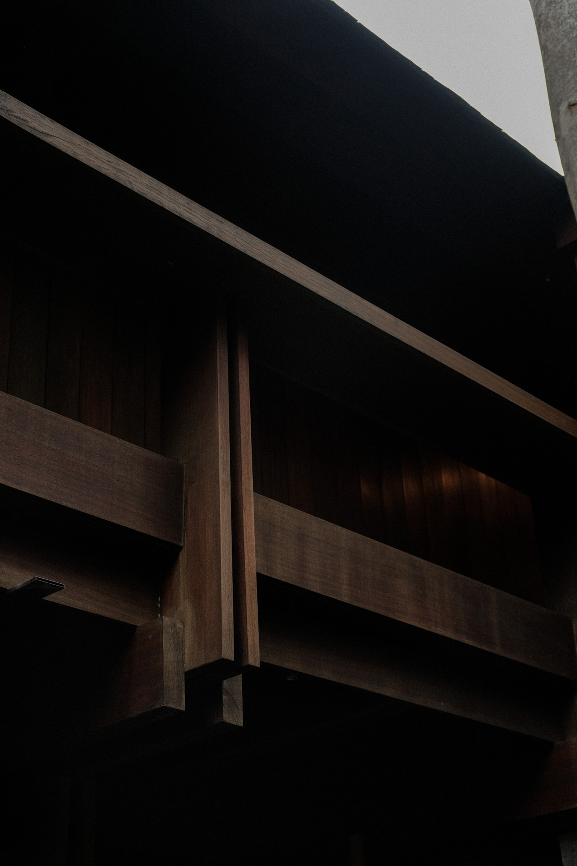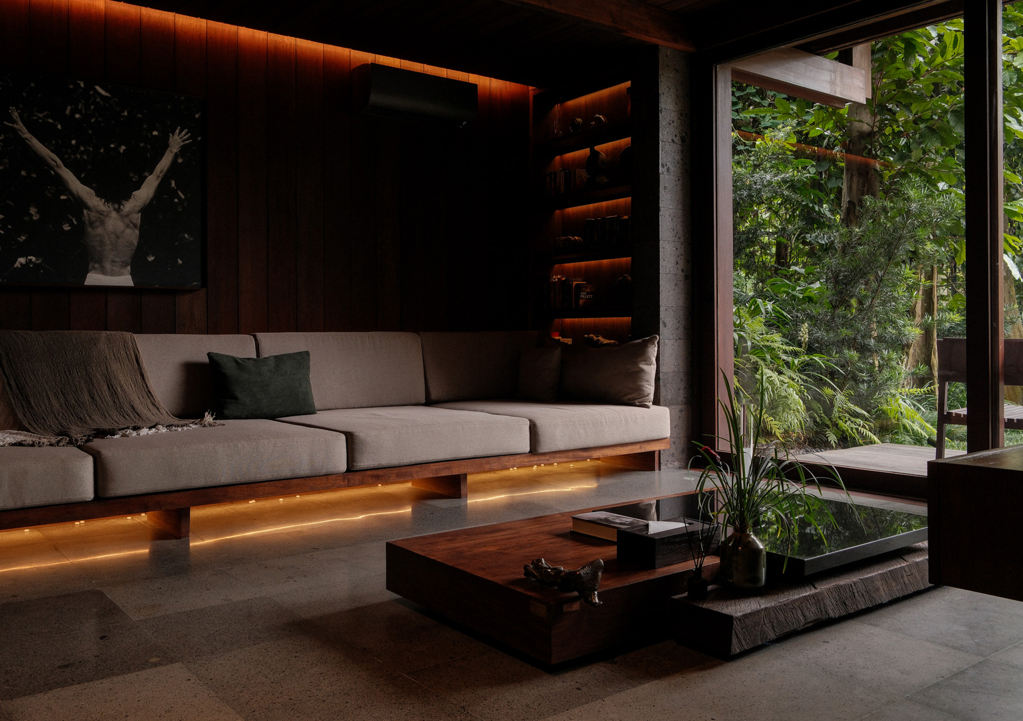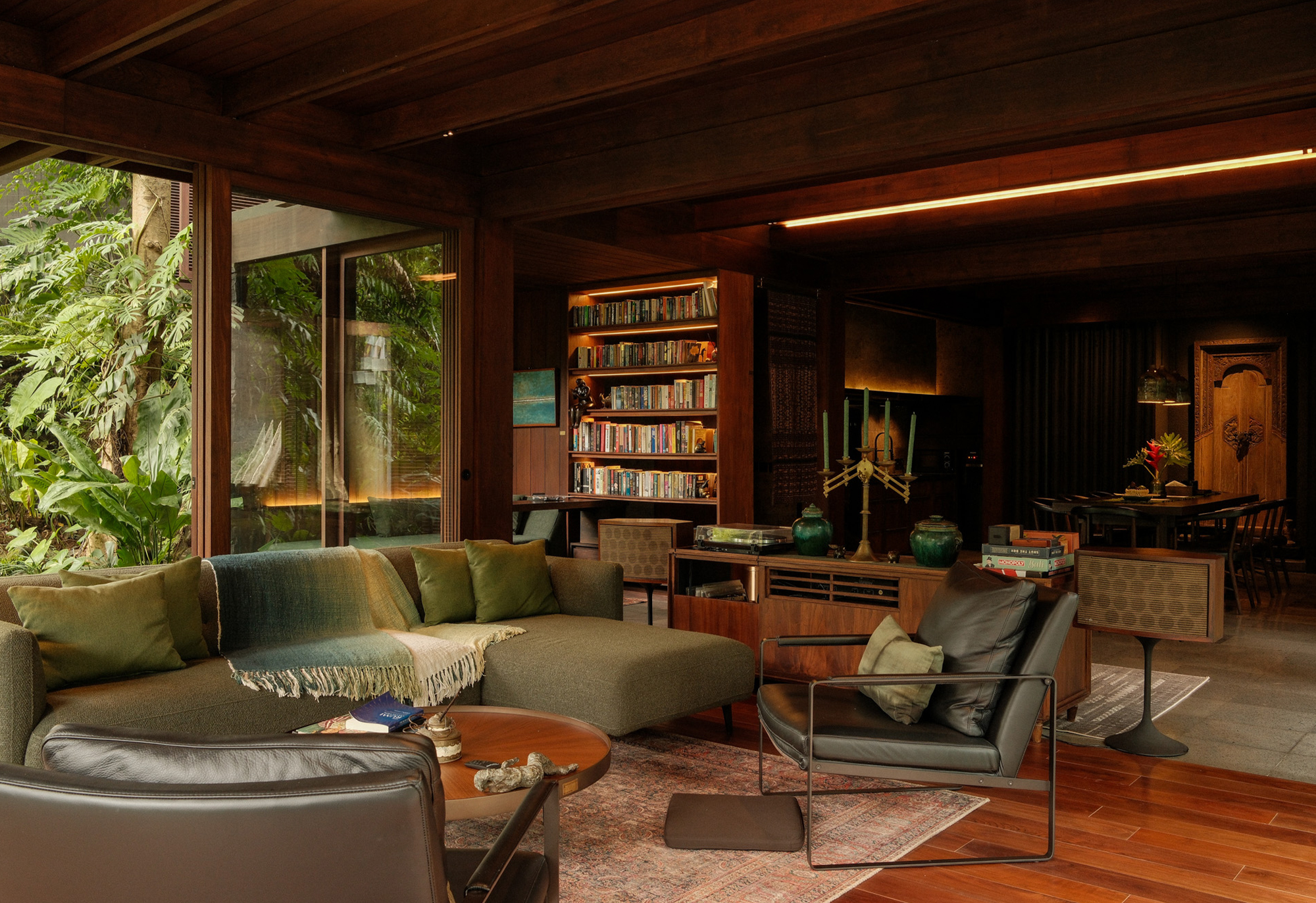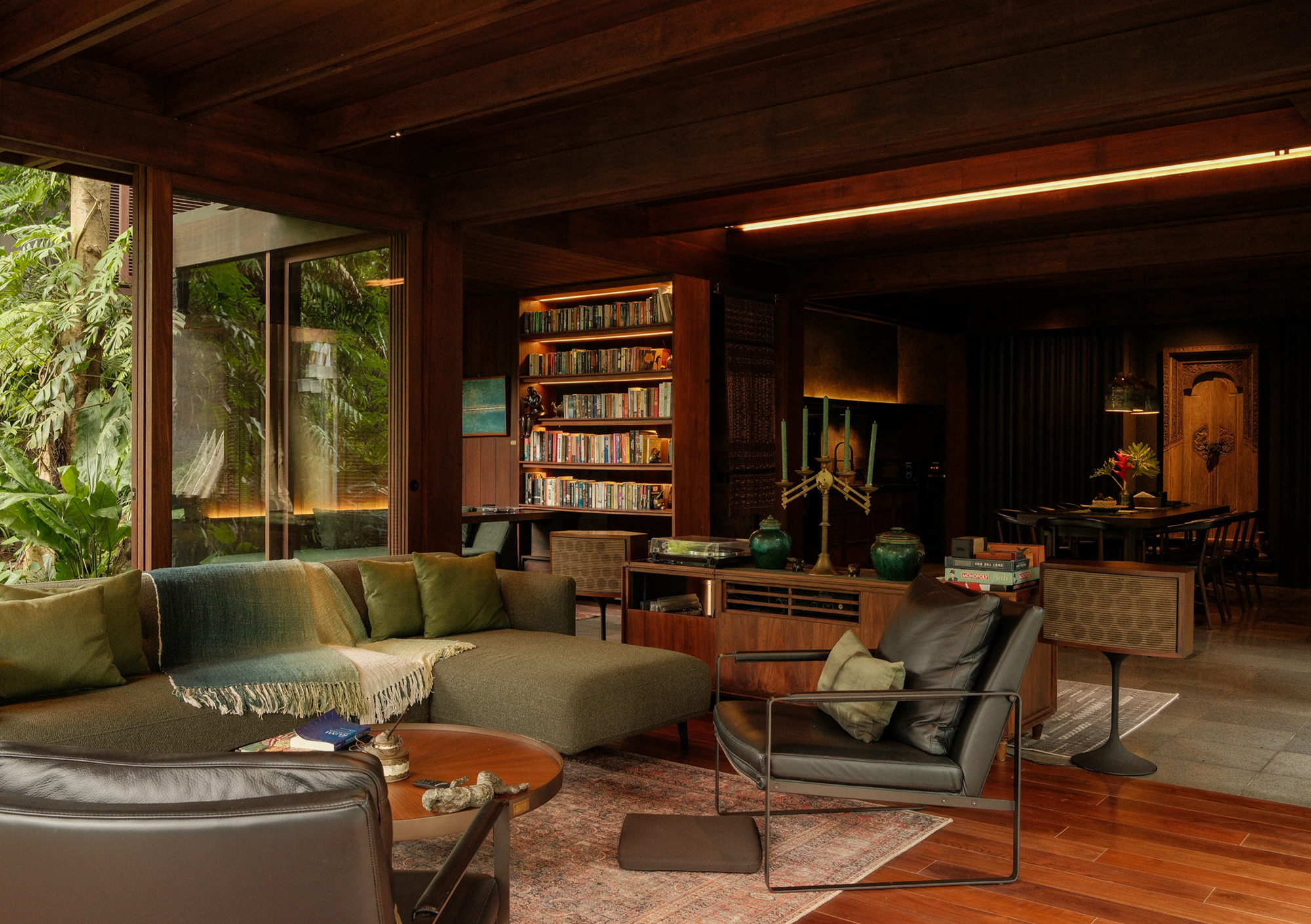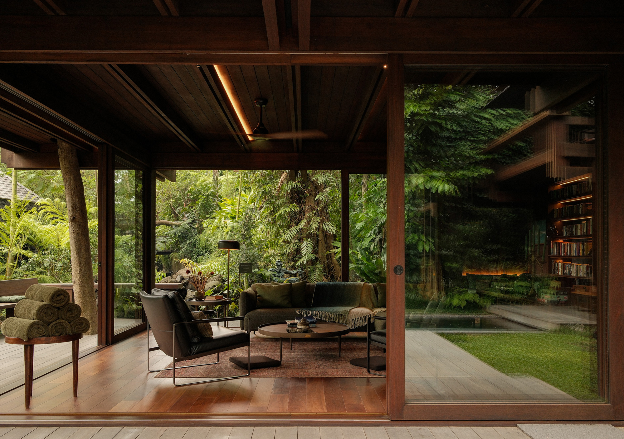 Entering the living room, dark timber pitched roof echoes 1980s Balinese tradition. Steel frames converse with volcanic stone walls in shifting light. Above, cantilevered structures beneath the terrace form sculptural ceilings—rainwater channels embedded in beams guide monsoon downpours into the courtyard, merging function and aesthetics.
