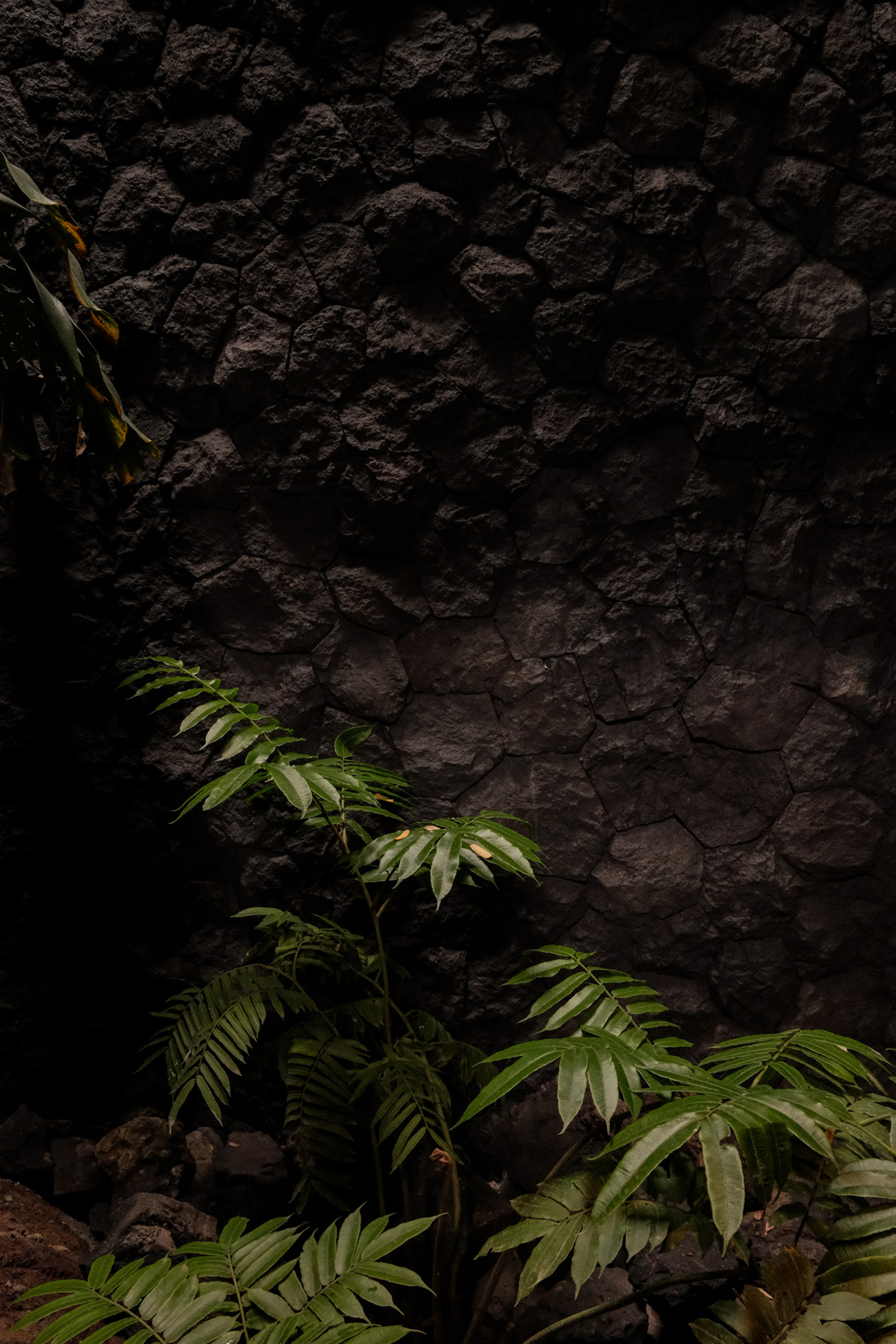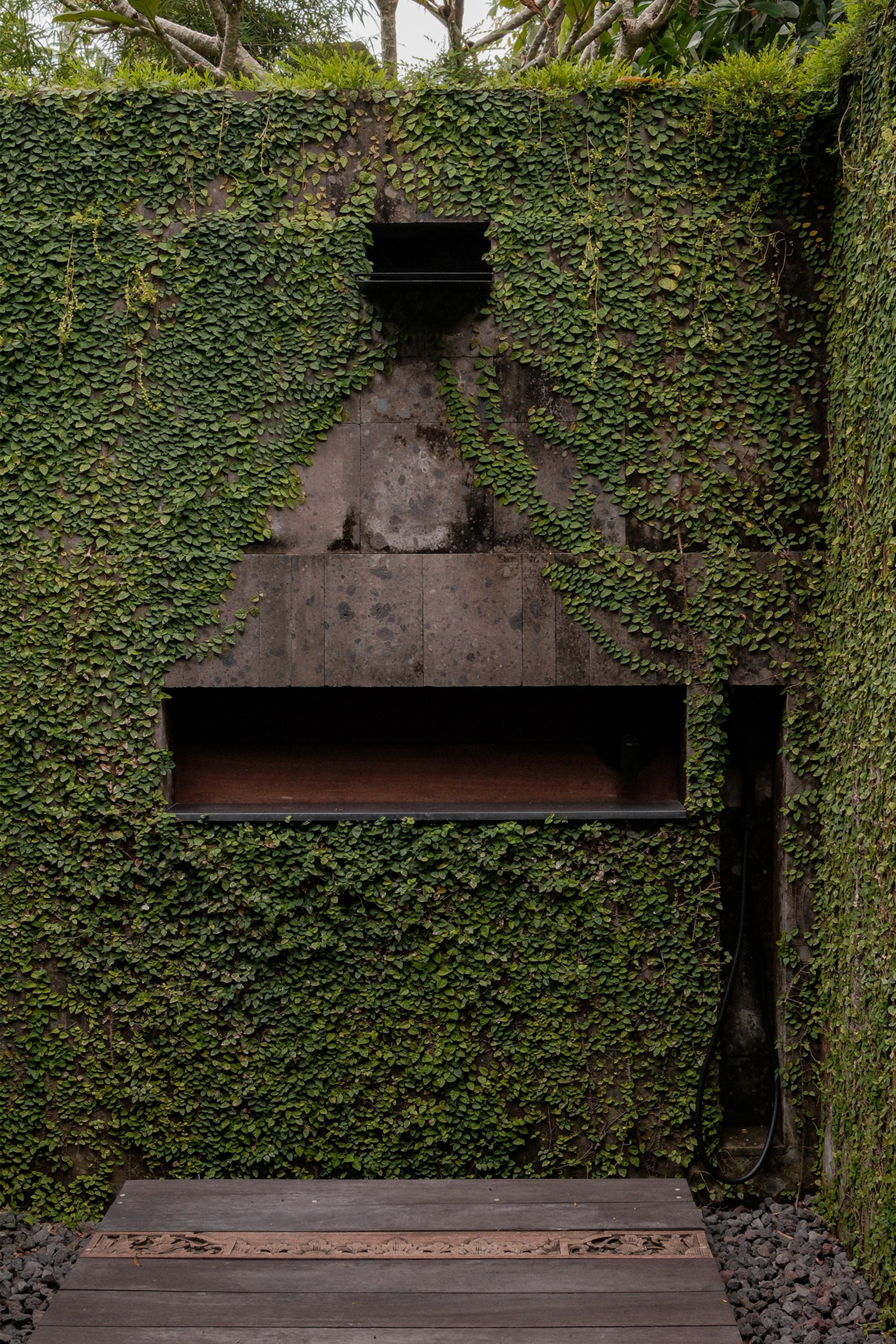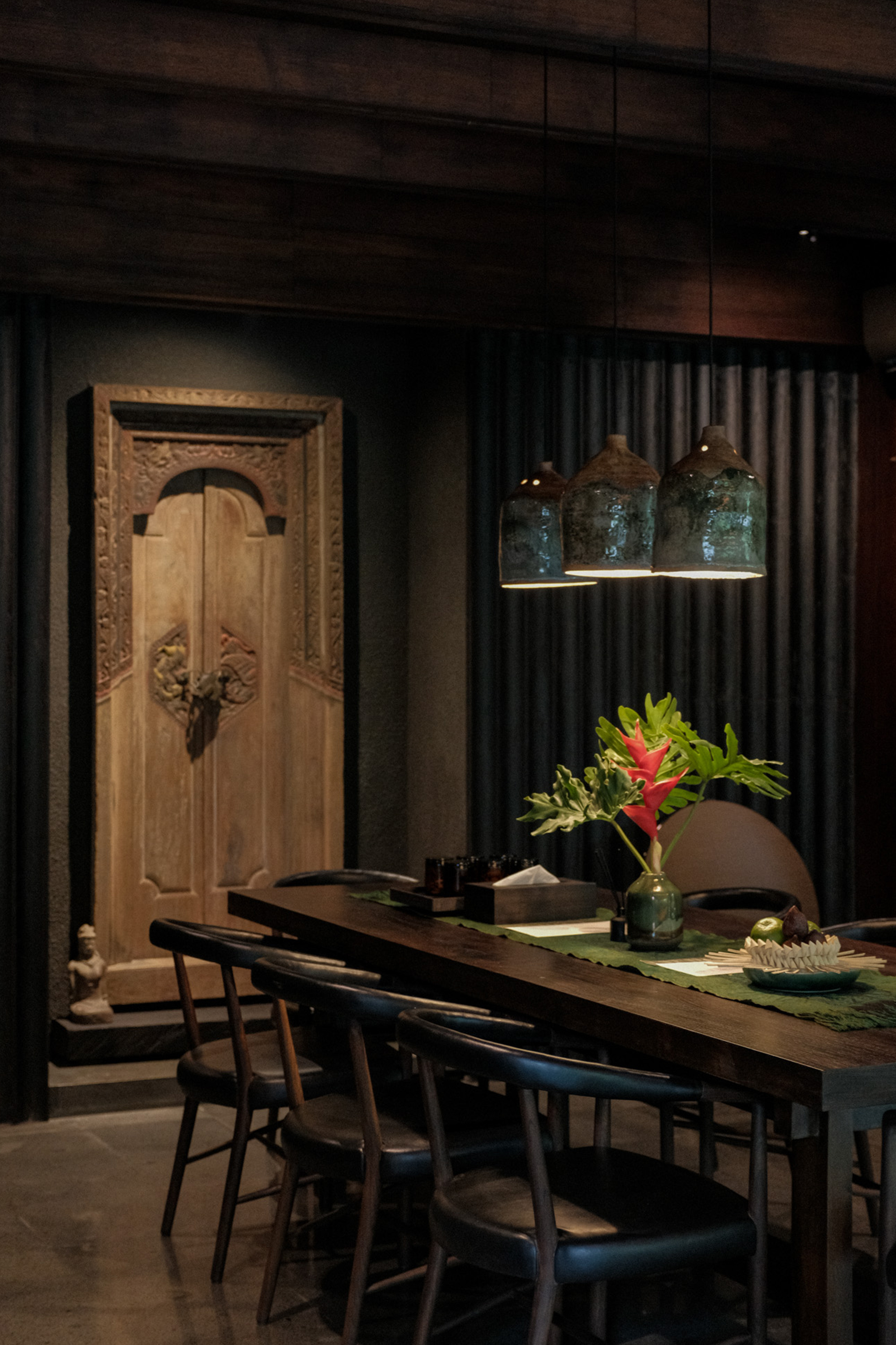 An emerald fabric sofa faces black leather loungers. On the teak sideboard, an antique metal candlestick holds moss-green candles, dark ceramic vases companion a vinyl player glowing warmly. When noon sun ignites waves of foliage outside, the interior’s shadowed serenity becomes a canvas showcasing nature’s vitality. In the dining room, a carved antique Balinese door enshrines the central axis. "More than art," the owner turns its handle, revealing a storage space behind. Each opening bridges ritual and daily life. Along volcanic stone walls, a stone goddess stands sentinel. Moss climbs her shoulders like a living emerald shawl.