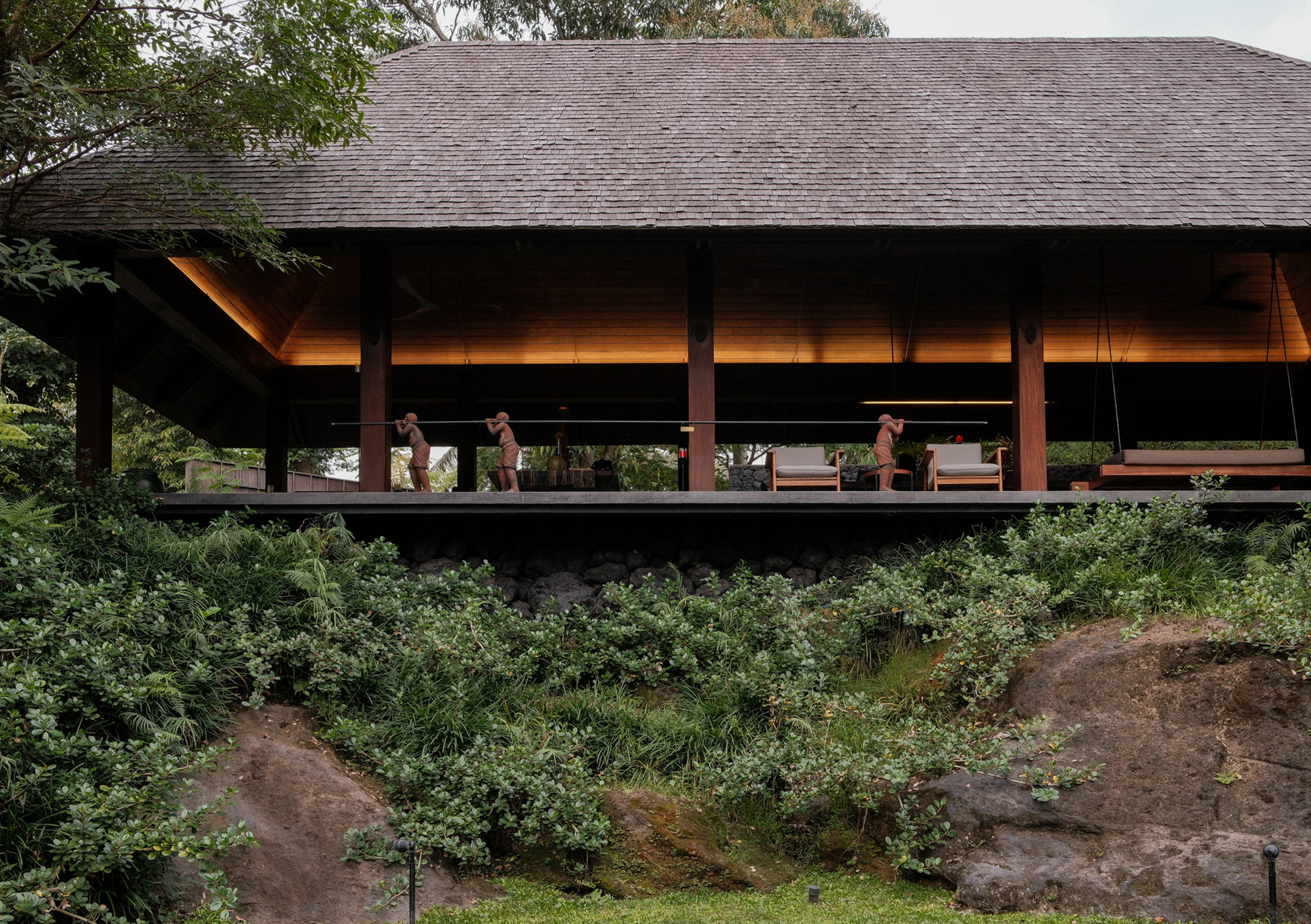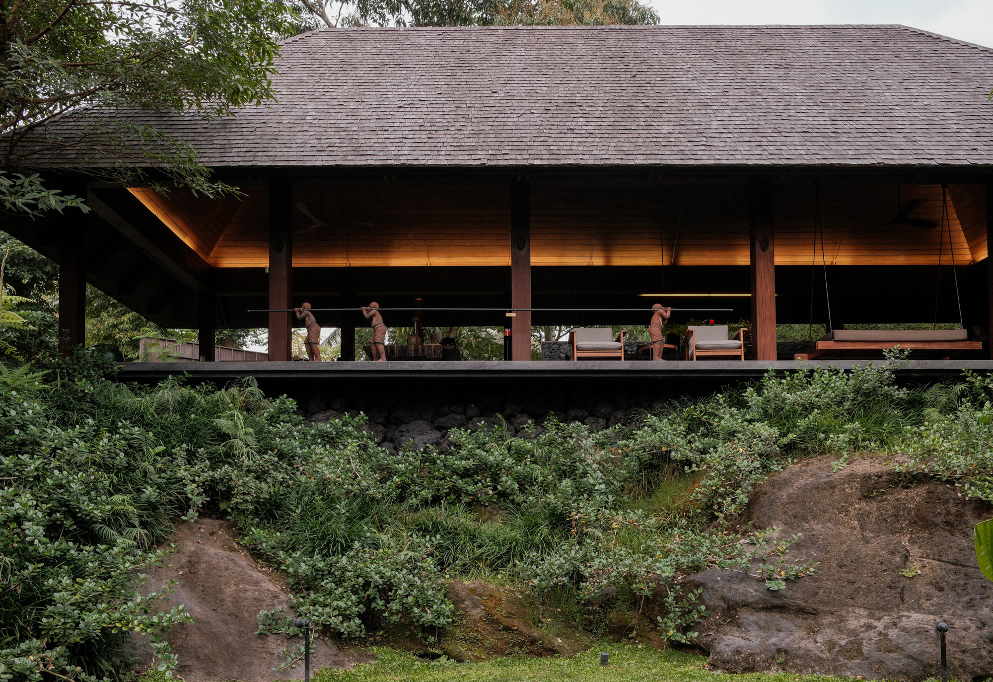 Crossing the creek bridge, the resort unfolds. Under the communal pavilion’s vast pitched roof, swing beds hover beside a long table, lounge chairs overlook the pool and gardens. Along teak deck edges, three bronze porters shoulder copper-wire "burdens"—a poetic boundary against the steep slope. The gym hides deep within layered gardens. On the narrow approach path, leaves brush arms as we sidestep encroaching branches.
