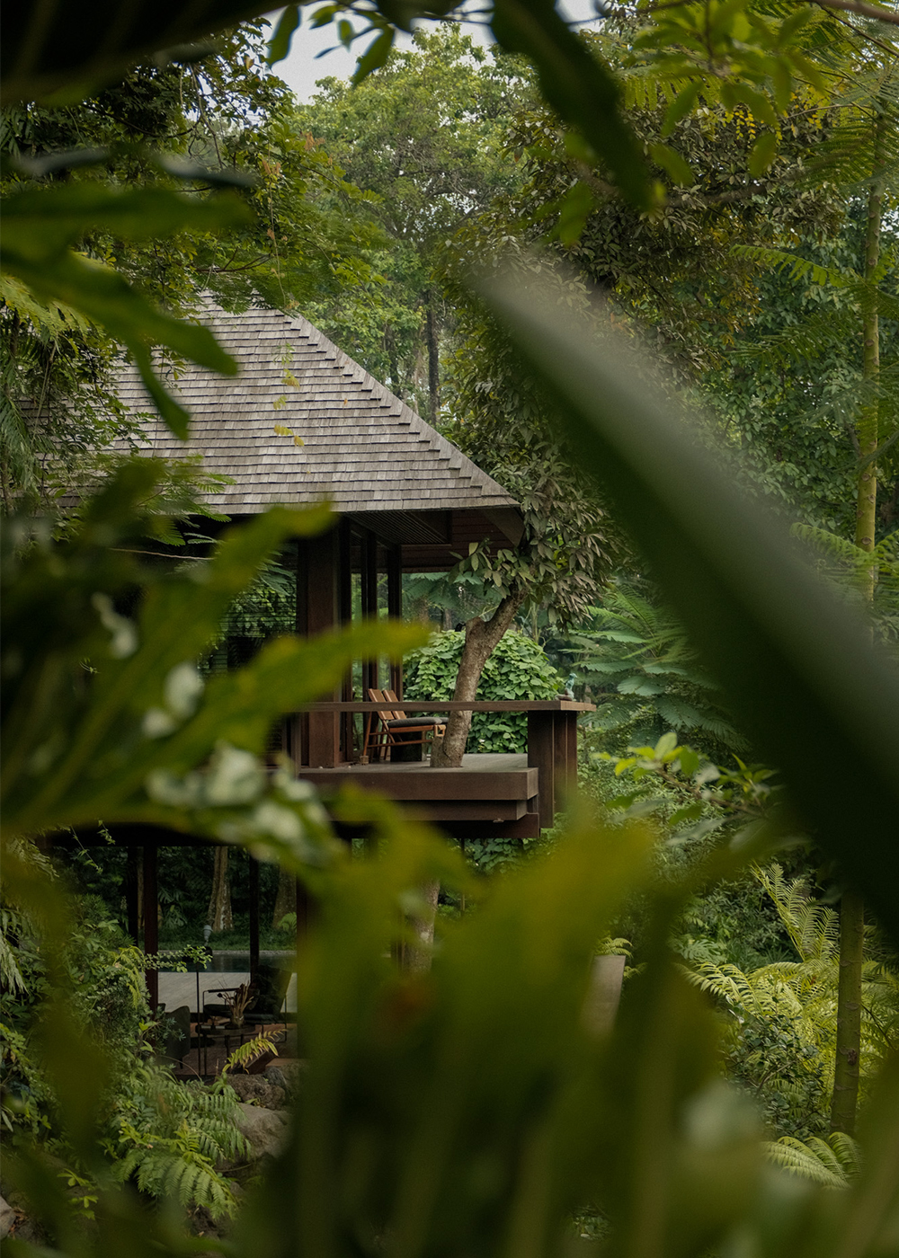 Four villas scatter through the jungle, each with private pools and outdoor showers. Creepers devour shower walls, leaving only dark tiles beneath waterfall-like spouts. The architect gestures toward the shower floor: "Notice this long stone tile within the timber planks." Moss edges the sediment-filled channel. "Guests can scrub rainforest mud from their feet while showering." Practicality and wildness intertwine here.
