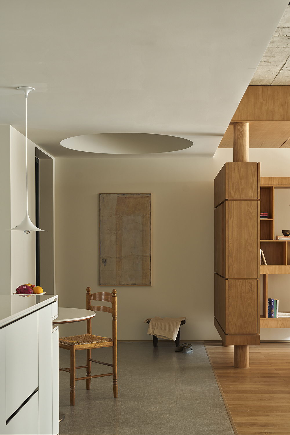 "The sky is like a dome, which covers all the fields." The geometric beauty of the circle forms the magnificence of the celestial circle in the entrance. Small mustard, can be reconciled; The width of the home is also between the square inches of the design. The splicing of the ground texture is a natural transition, and the division of space finds a balance between order and freedom. The wooden screen is half fan, which leads the vision to a more open field. The suspended design releases force in the longitudinal space. Like a half-open door, like a towering tree, the "space" expands in the mind.