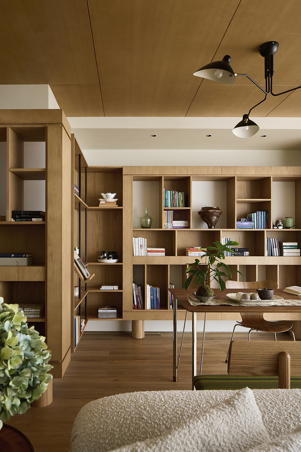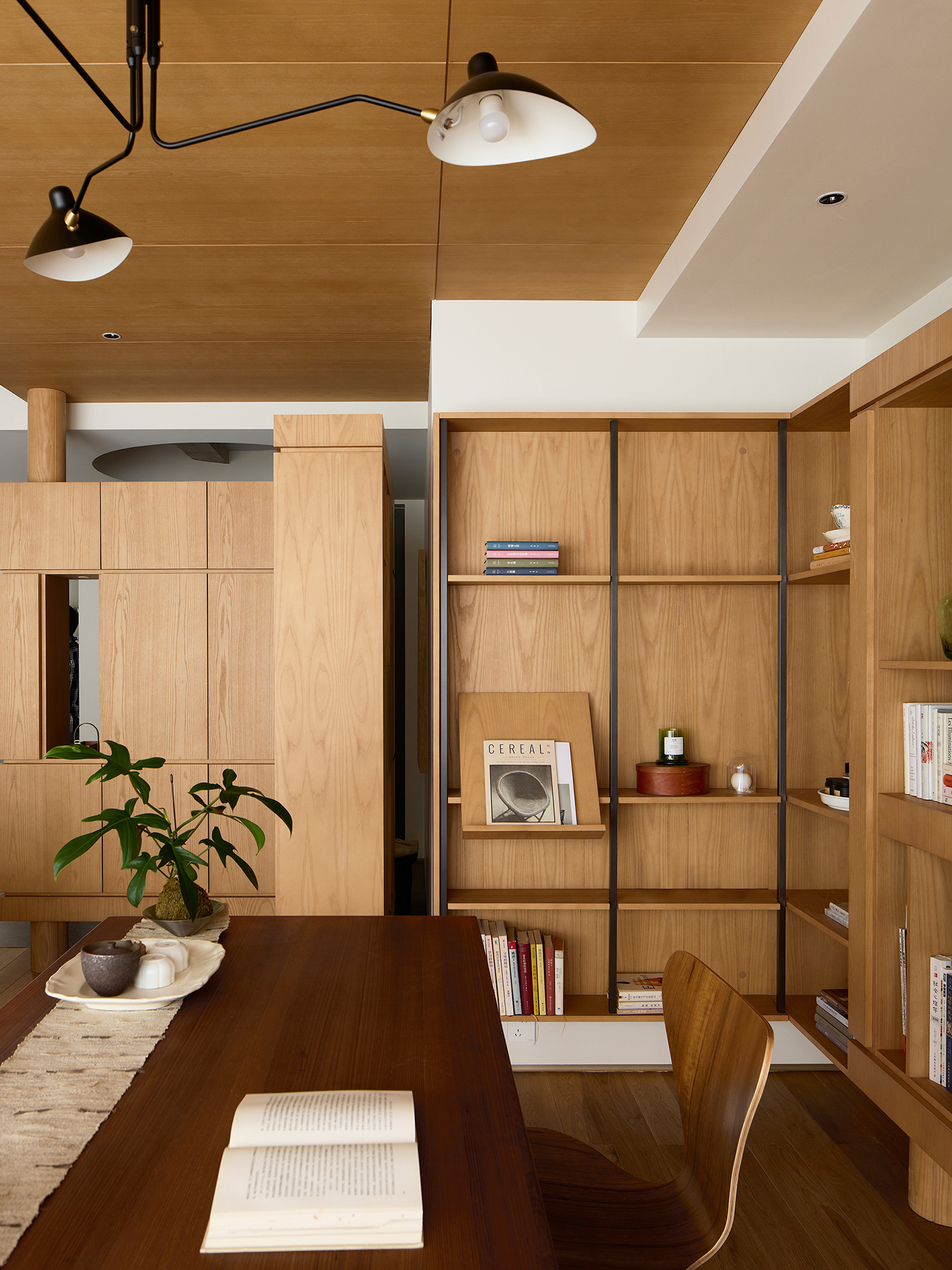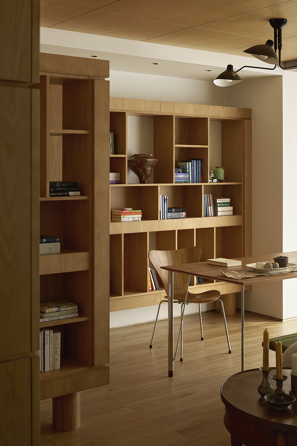To design a study room, books and space are not the protagonist, the talent who reads and thinks is the core. With the owner's favorite wood art to create color, texture unified home, simple and straightforward, is not overwhelming the beauty. Furniture and cabinets are designed with simple lines and light and slender volumes, creating a blank space for readers to guide their inspiration. Because the inner core is full enough and the surface is "empty" enough, the possibilities are infinite.