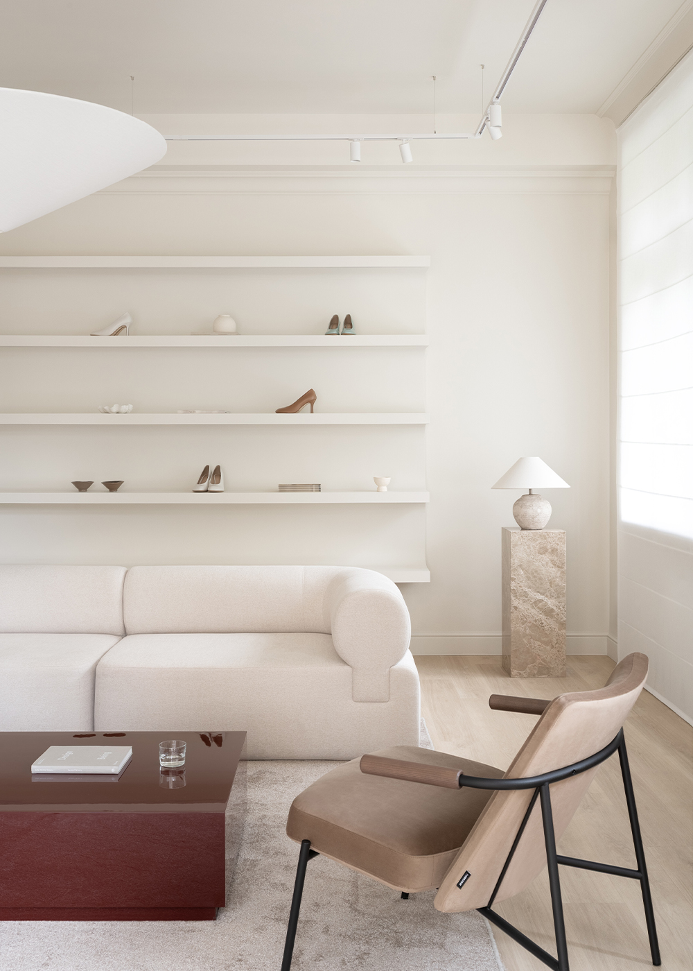 Material choices balance tactility and elegance: matte wood and textiles bring warmth, while polished marble and the glossy statement coffee table inject sophistication and dynamism. The latter, produced after several rounds of lacquering and sanding to achieve a flawless finish, became so central that its deep hue was later adopted into the brand’s visual identity.