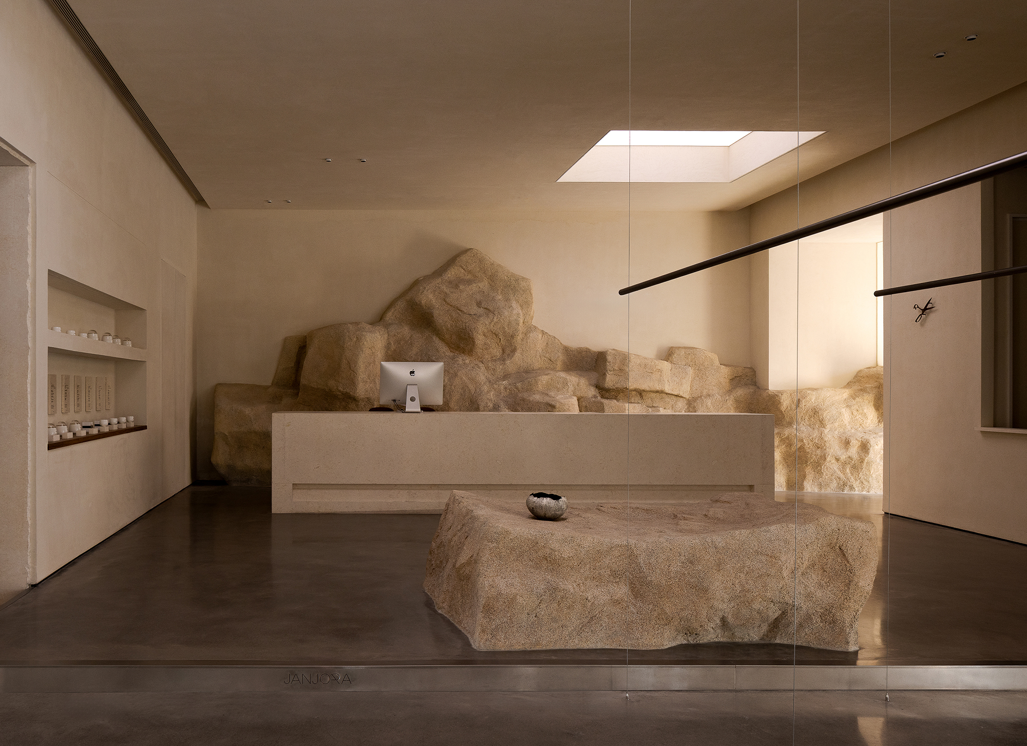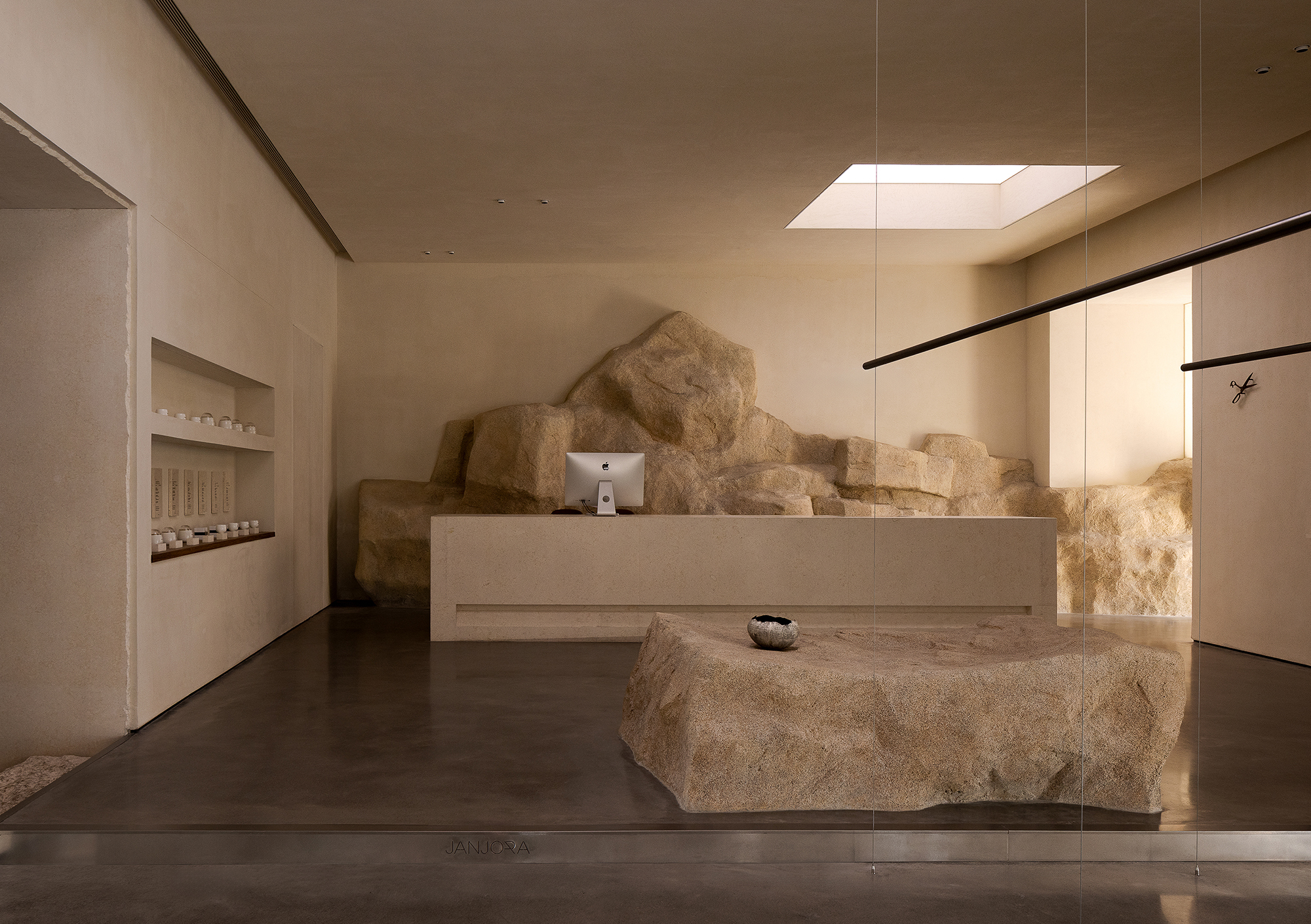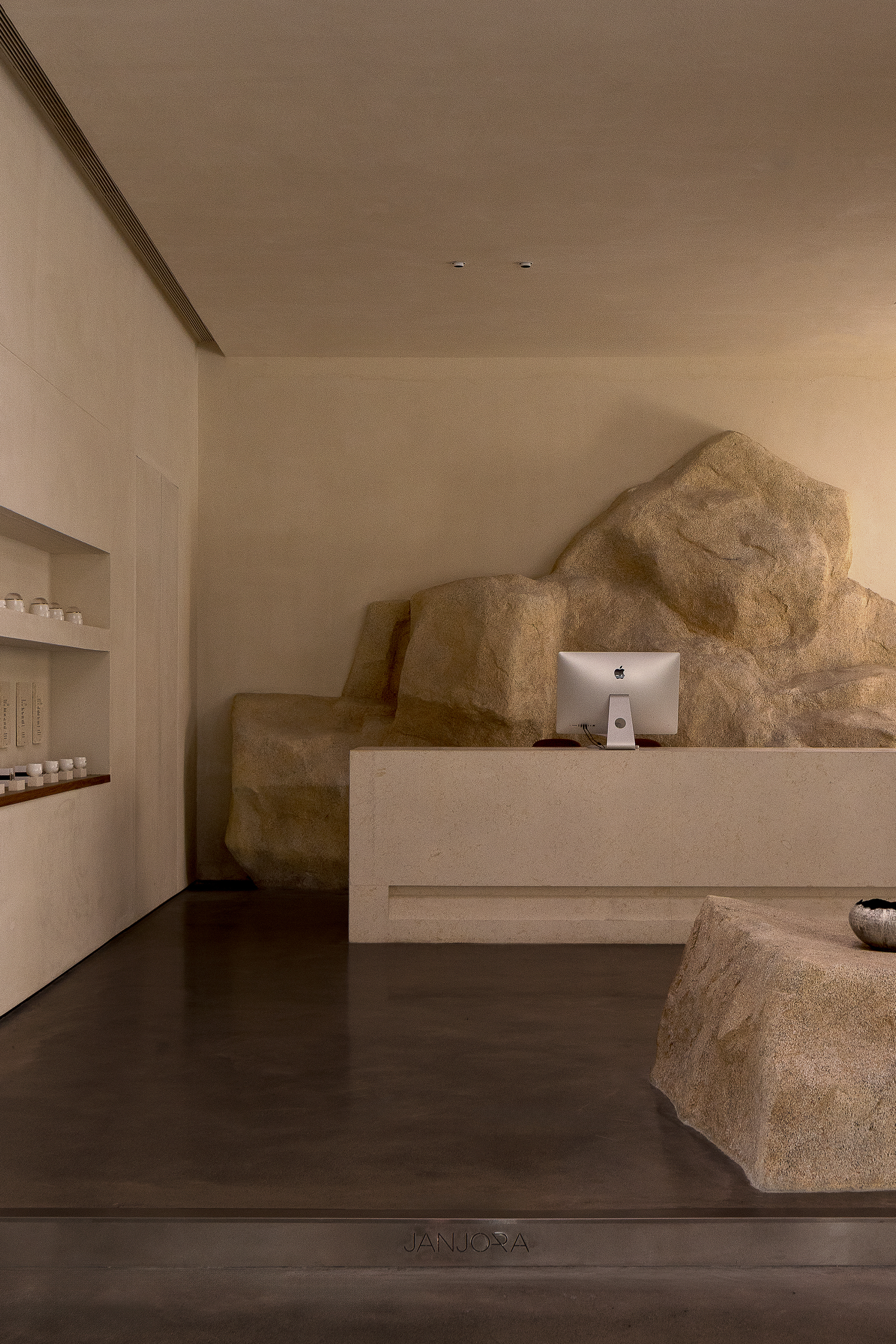 In the fast-paced rhythm of contemporary life, "tranquility" has long become a rare luxurious experience. It is a precious gift from JANJORA Aesthetic Space to contemporary urbanites. With "isolating urban hustle and bustle and returning to inner tranquility" as the core, the designers have created a sunken independent area in the entrance space. This design forms a natural barrier between the external roads and the interior, guiding people to naturally settle their thoughts and sort out their moods while walking slowly, breaking free from the shackles of tedious life and immersively experiencing the edification of spatial aesthetics. At the same time, stone benches are carefully placed along the circulation route, which not only provide pedestrians with a comfortable corner to rest and stop, but also allow people to observe the indoor dynamics in tranquility, realizing the ingenious integration of movement and stillness.
