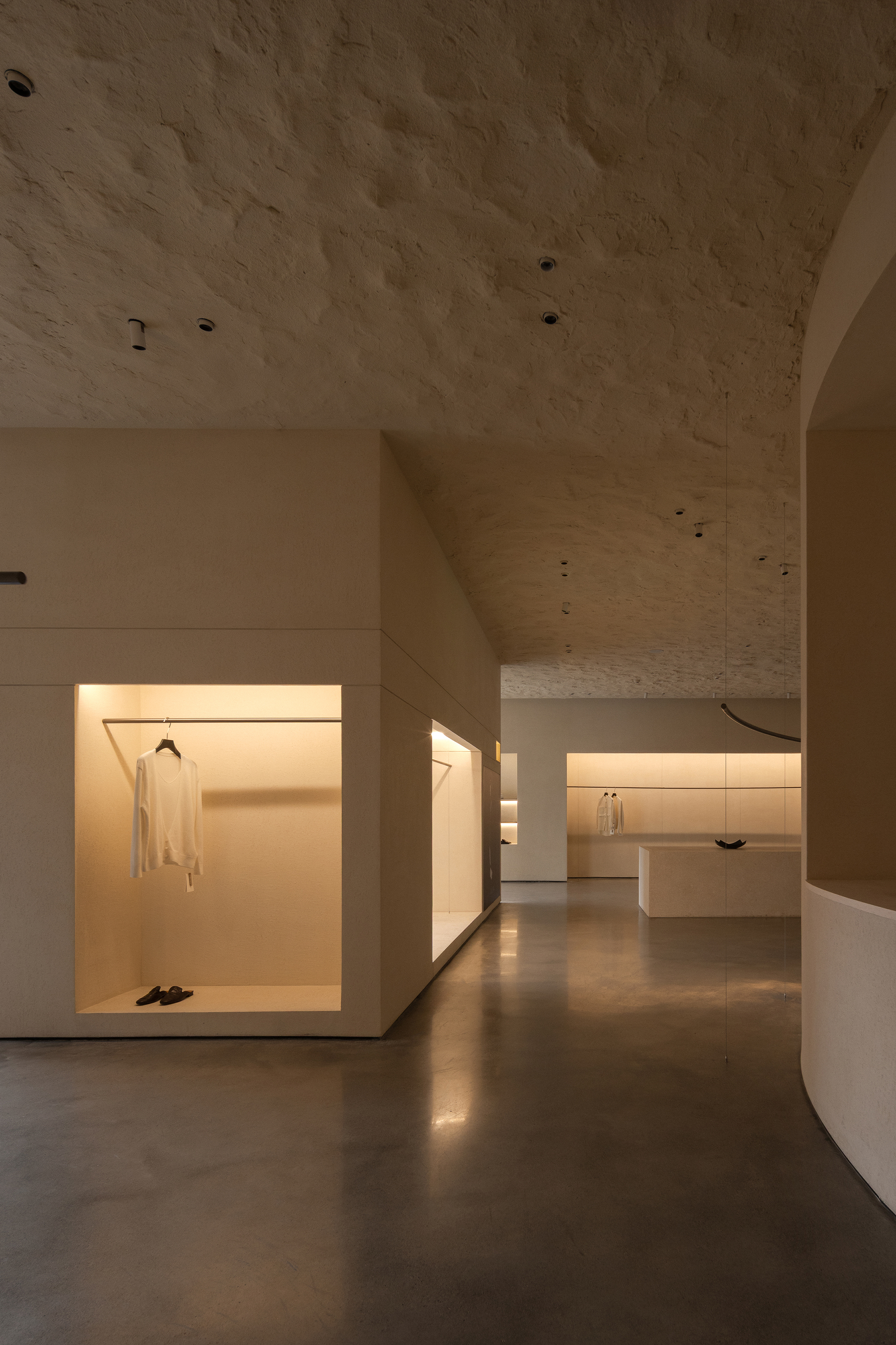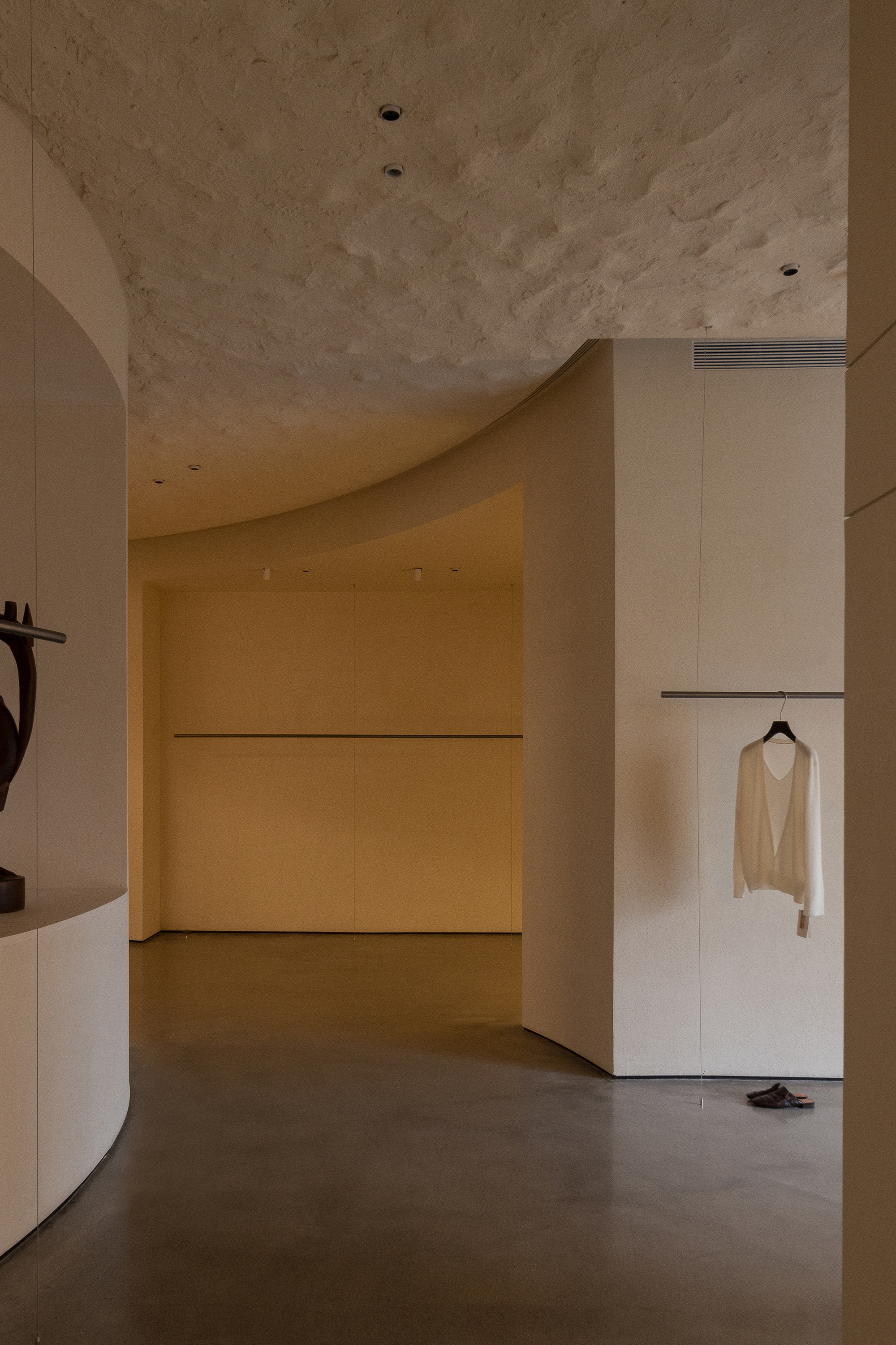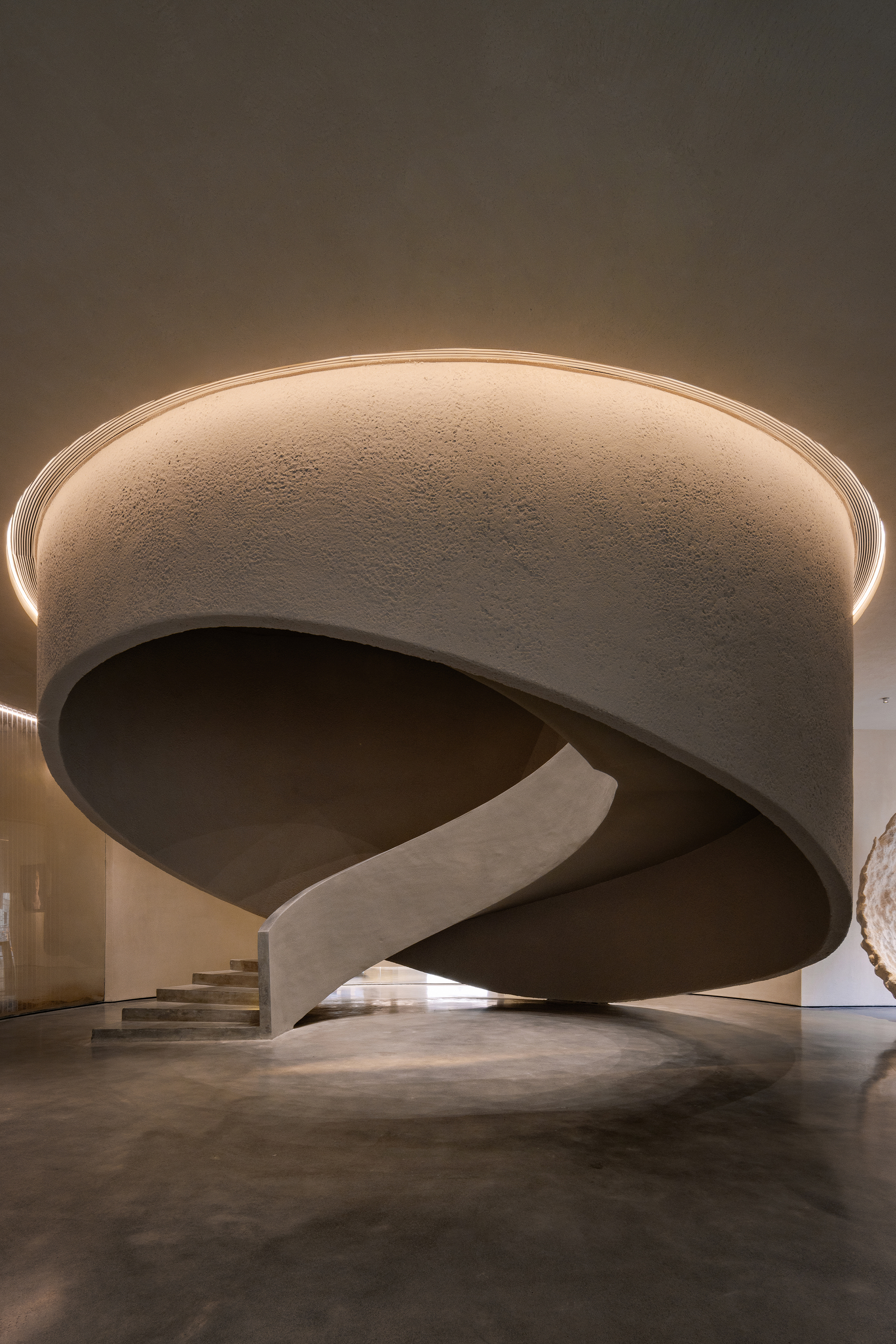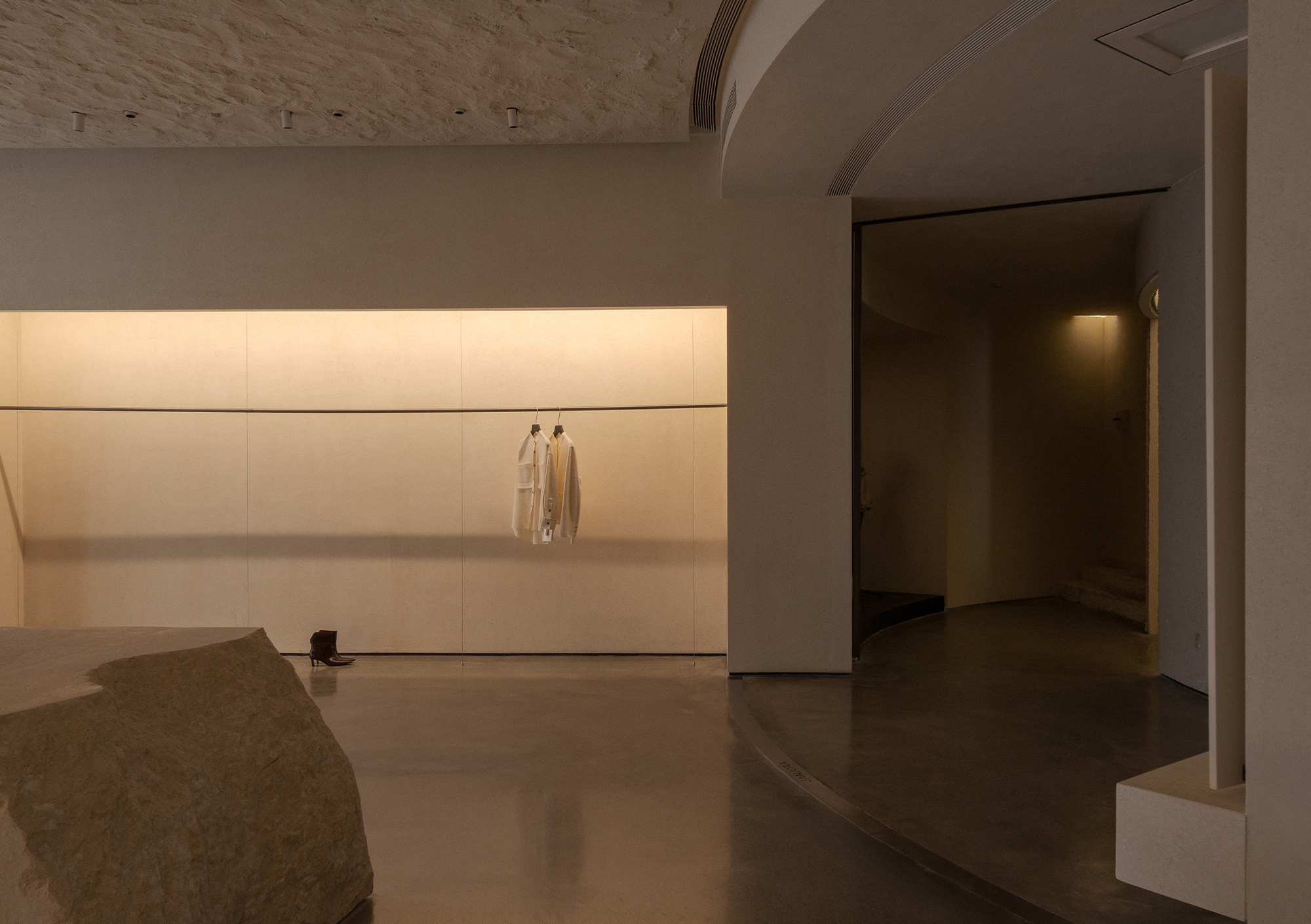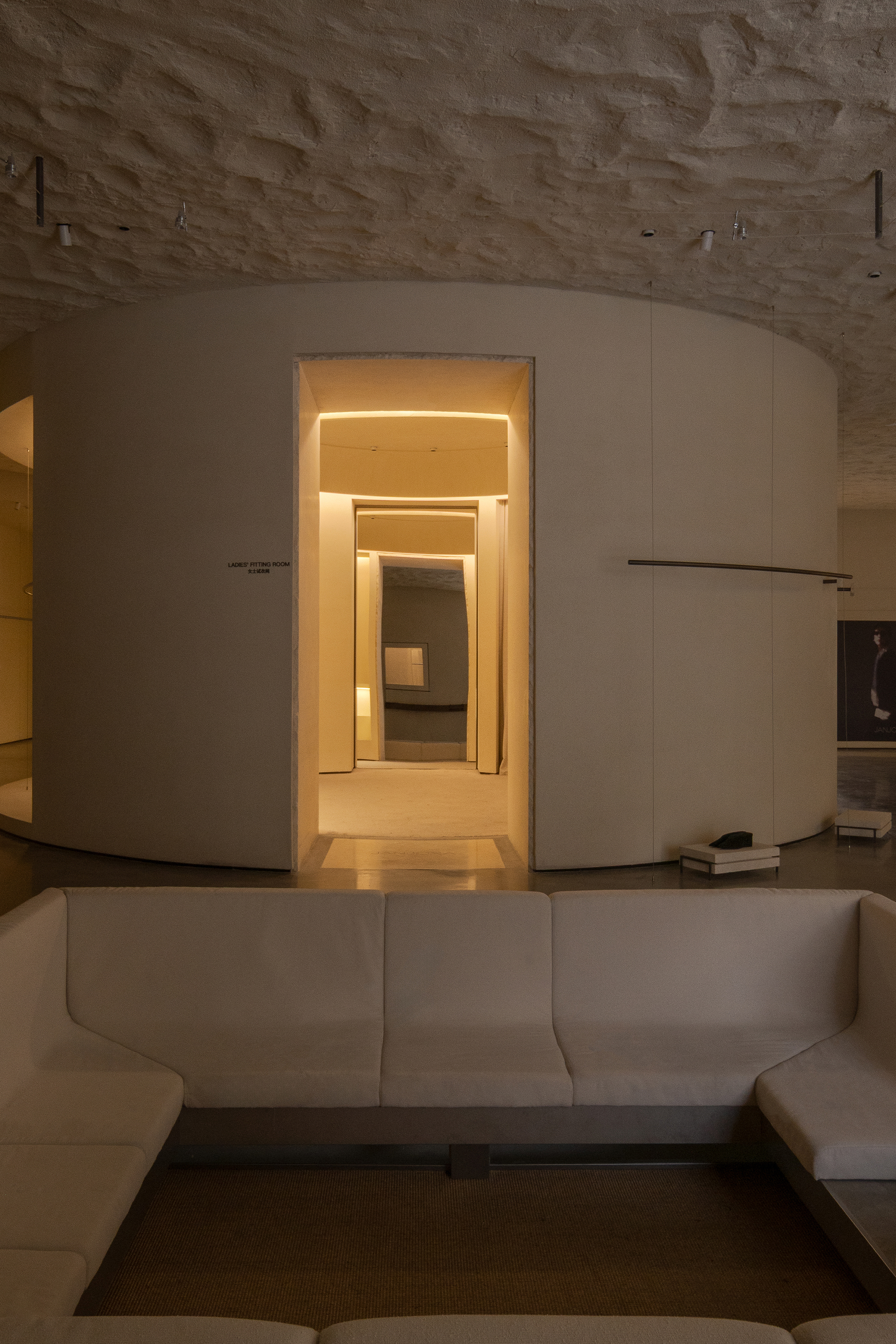 Each step is an angular volume of light and shadow, chiseled by time and light, where brightness and darkness interweave in harmony. As one ascends the stairs, footsteps tap gently against the texture of the space. In the rhythm of rising and advancing, a spiritual dialogue with the spatial scale unfolds. This staircase is not only the core circulation route linking the first and second floors, but also an ingenious design that subtly conceals the store’s exit. The fluid, spiraling lines effortlessly draw the eye upward to the corridor space on the second floor. Following this graceful flow, visitors climb slowly and wander at ease, as if stepping into a meticulously curated aesthetic journey. The small cantilevered corridor along the way offers a tranquil haven for busy urban women. Here, they can pause to catch their breath, confide their innermost thoughts, and listen to their own hearts—allowing the space to transform into a tender vessel for emotions.