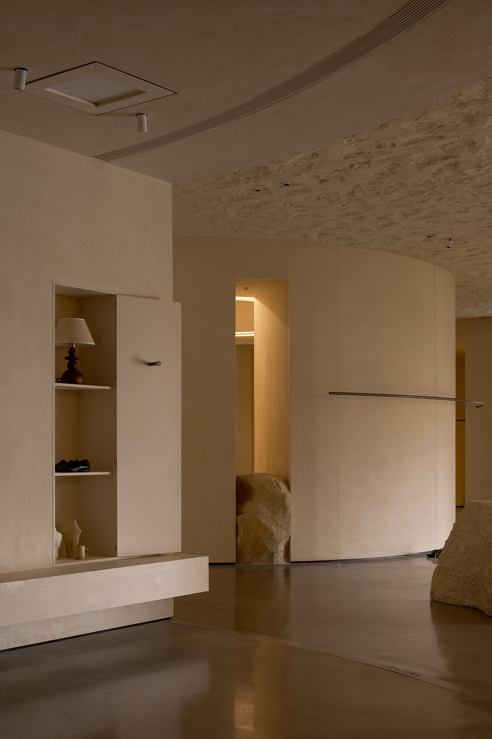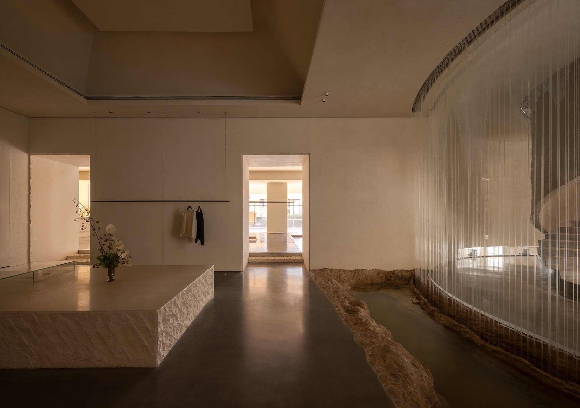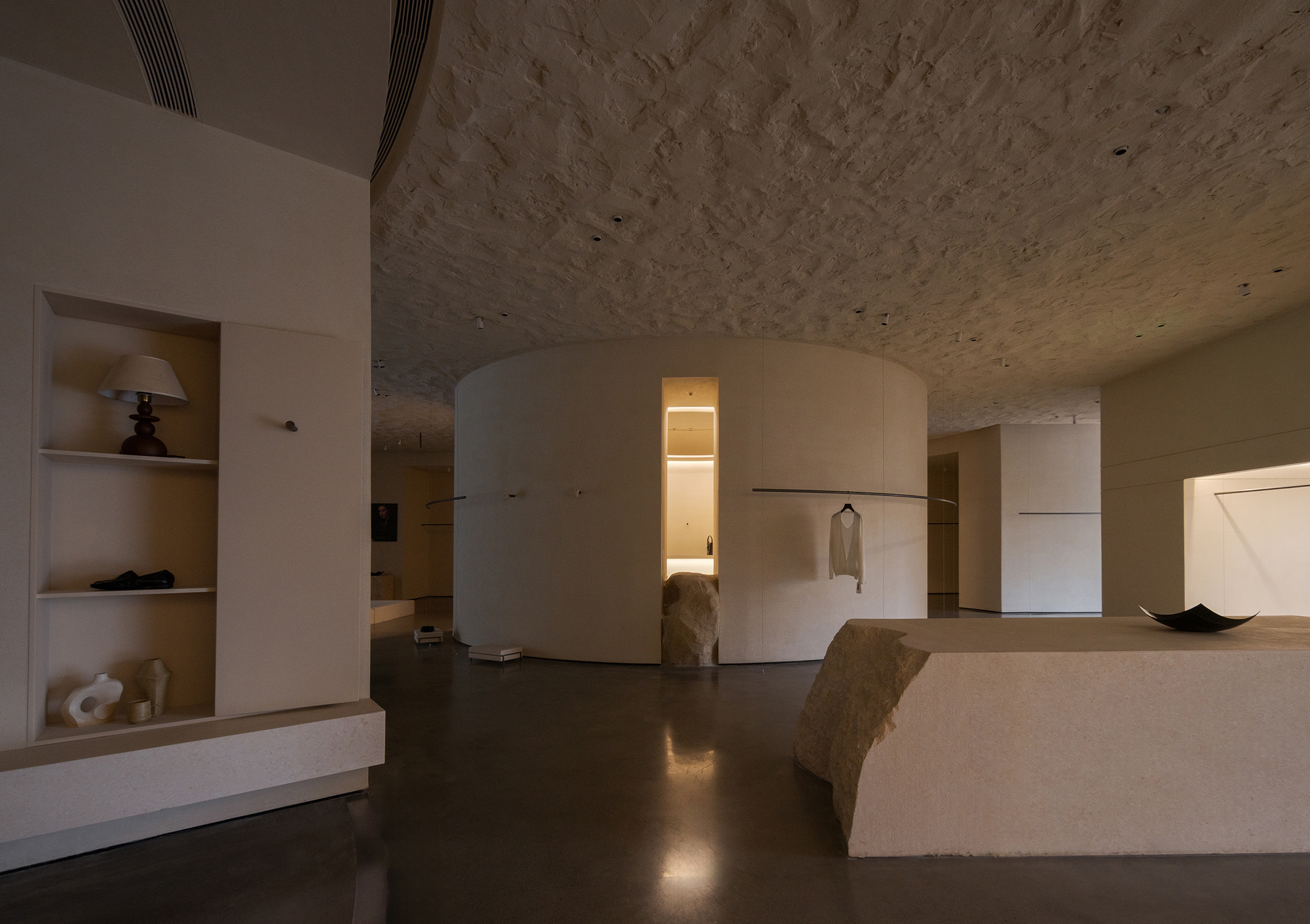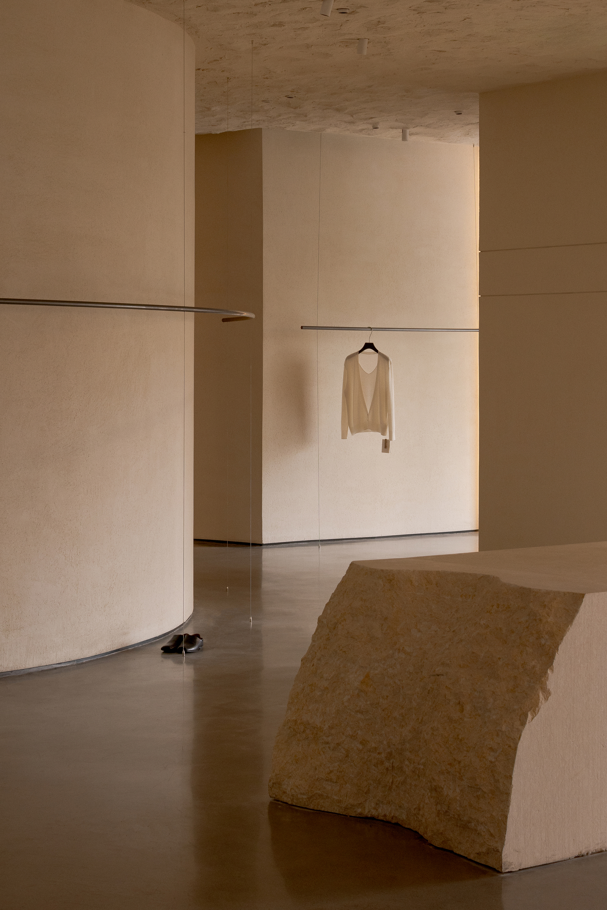 Each step is an angular volume of light and shadow, chiseled by time and light, where brightness and darkness interweave in harmony. As one ascends the stairs, footsteps tap gently against the texture of the space. In the rhythm of rising and advancing, a spiritual dialogue with the spatial scale unfolds. This staircase is not only the core circulation route linking the first and second floors, but also an ingenious design that subtly conceals the store’s exit. The fluid, spiraling lines effortlessly draw the eye upward to the corridor space on the second floor. Following this graceful flow, visitors climb slowly and wander at ease, as if stepping into a meticulously curated aesthetic journey. The small cantilevered corridor along the way offers a tranquil haven for busy urban women. Here, they can pause to catch their breath, confide their innermost thoughts, and listen to their own hearts—allowing the space to transform into a tender vessel for emotions.