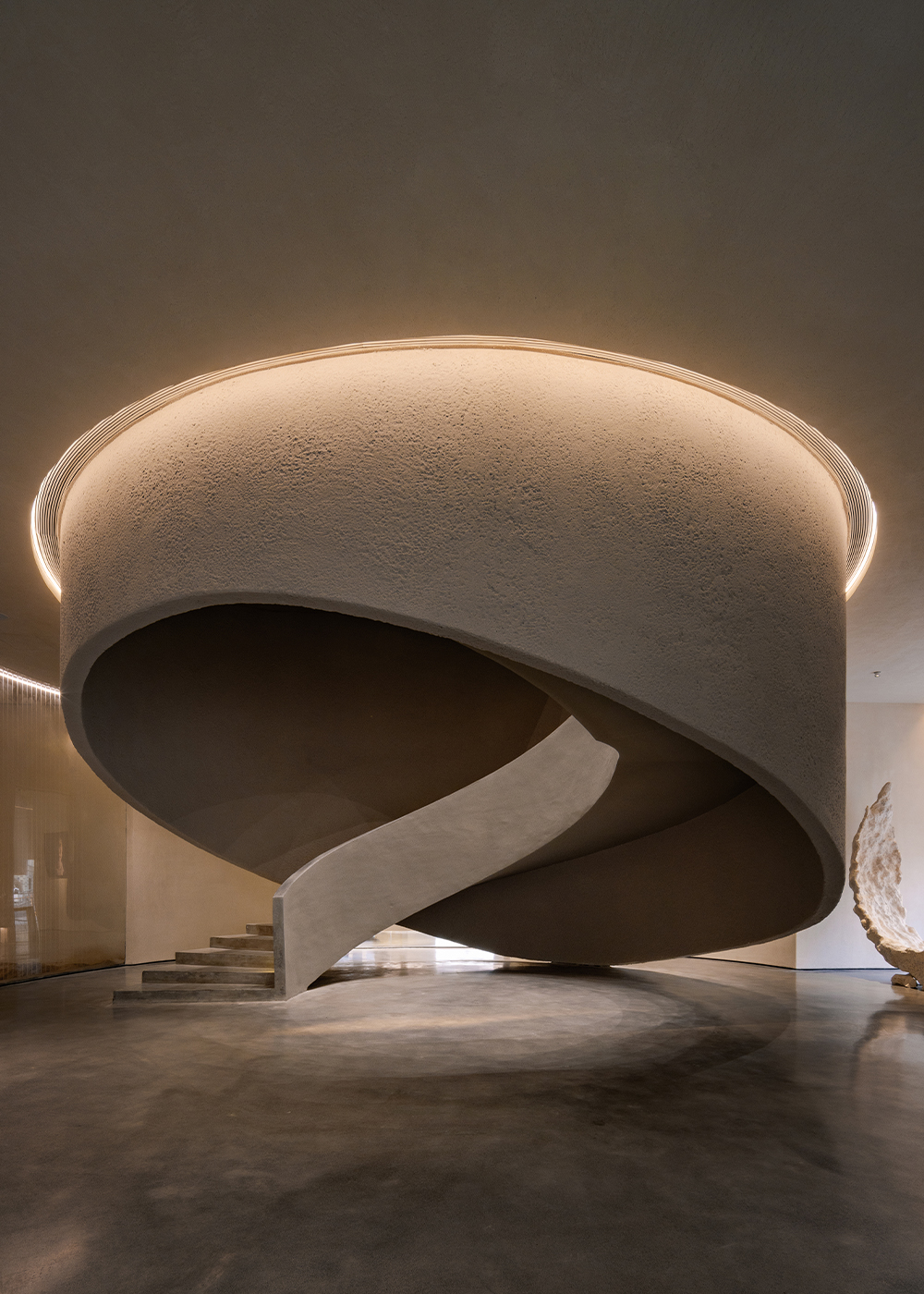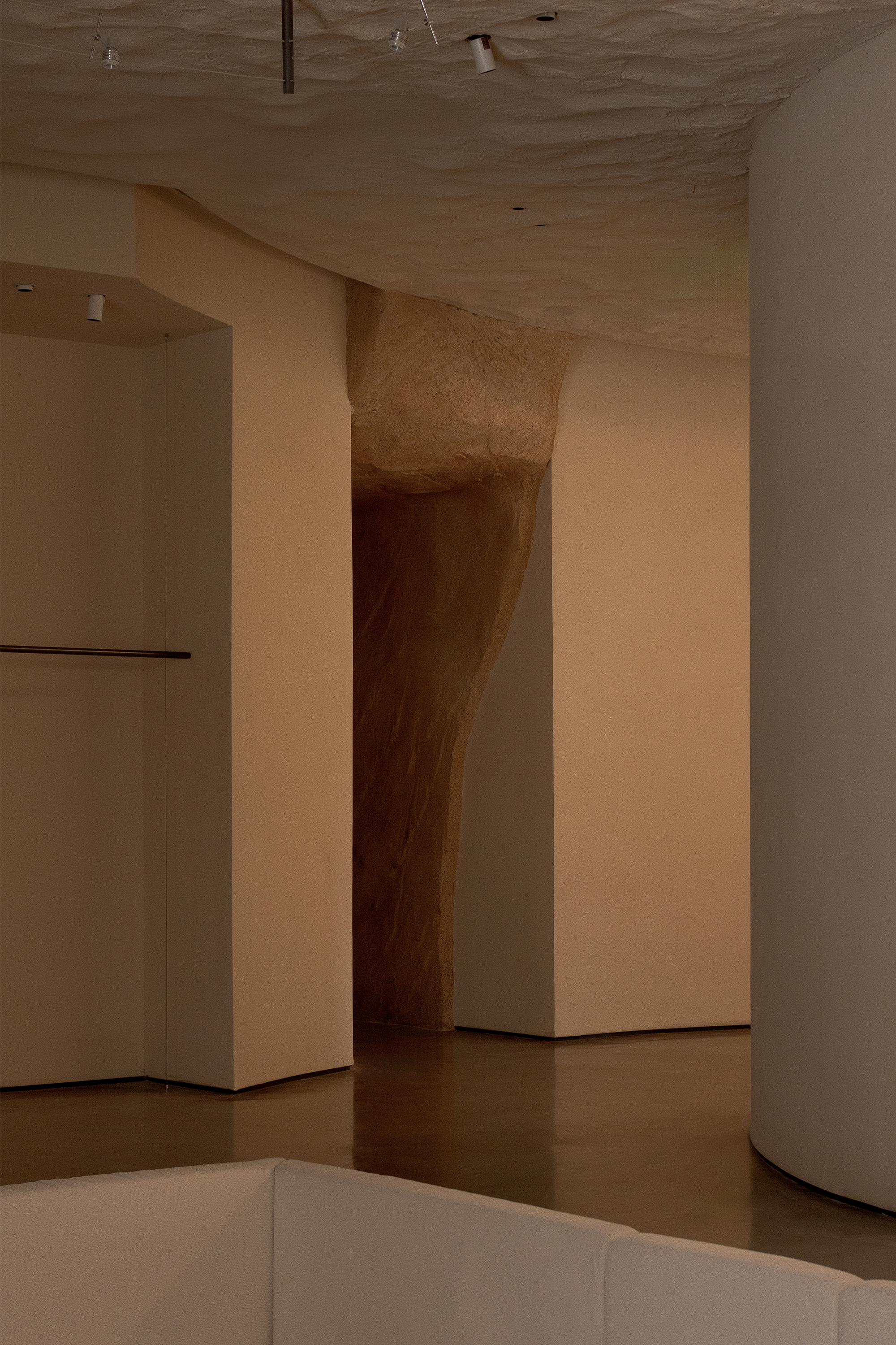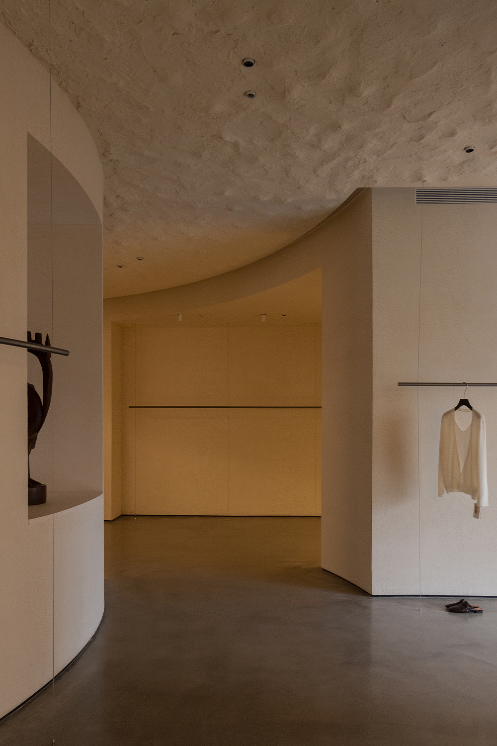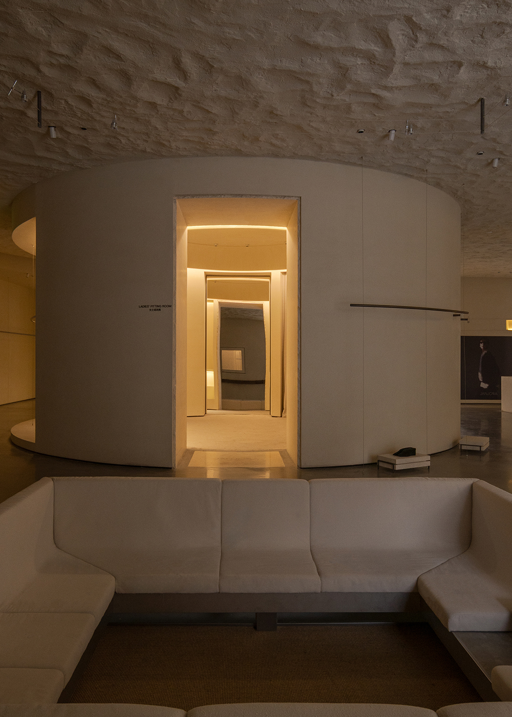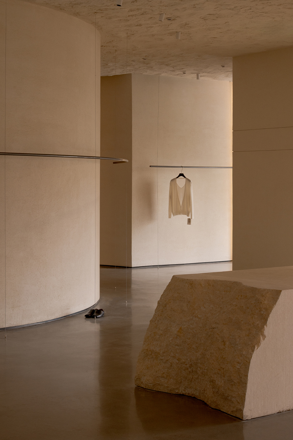 Each step is an angular volume of light and shadow, chiseled by time and light, where brightness and darkness interweave in harmony. As one ascends the stairs, footsteps tap gently against the texture of the space. In the rhythm of rising and advancing, a spiritual dialogue with the spatial scale unfolds. This staircase is not only the core circulation route linking the first and second floors, but also an ingenious design that subtly conceals the store’s exit. The fluid, spiraling lines effortlessly draw the eye upward to the corridor space on the second floor. Following this graceful flow, visitors climb slowly and wander at ease, as if stepping into a meticulously curated aesthetic journey. The small cantilevered corridor along the way offers a tranquil haven for busy urban women. Here, they can pause to catch their breath, confide their innermost thoughts, and listen to their own hearts—allowing the space to transform into a tender vessel for emotions.