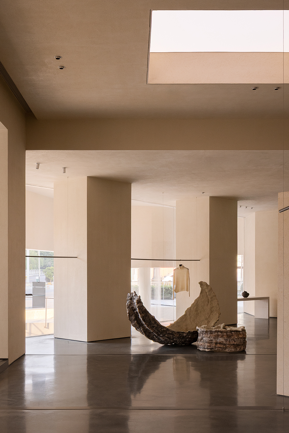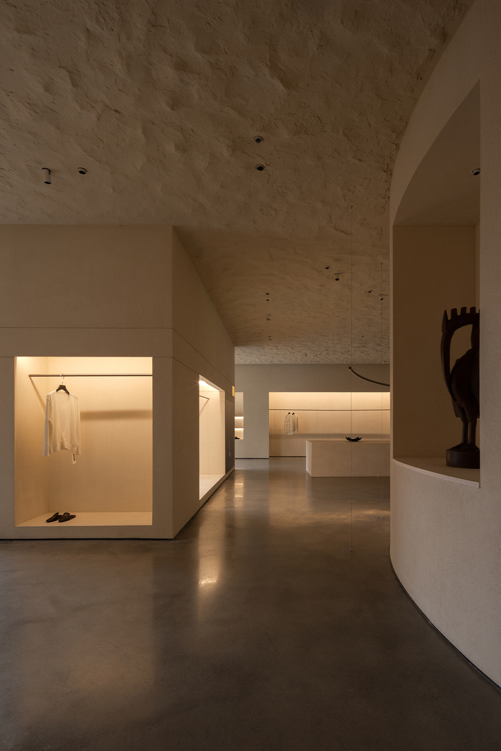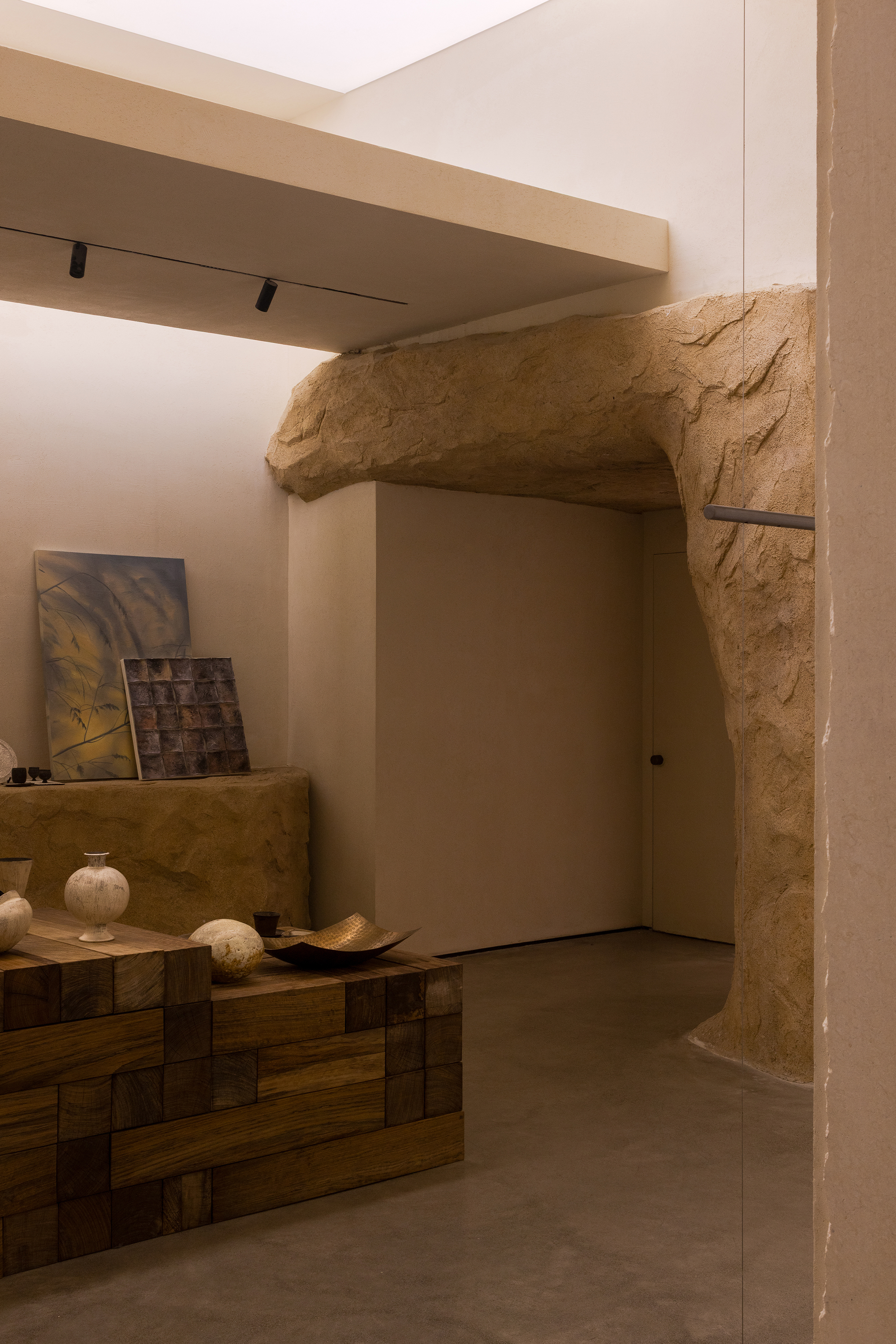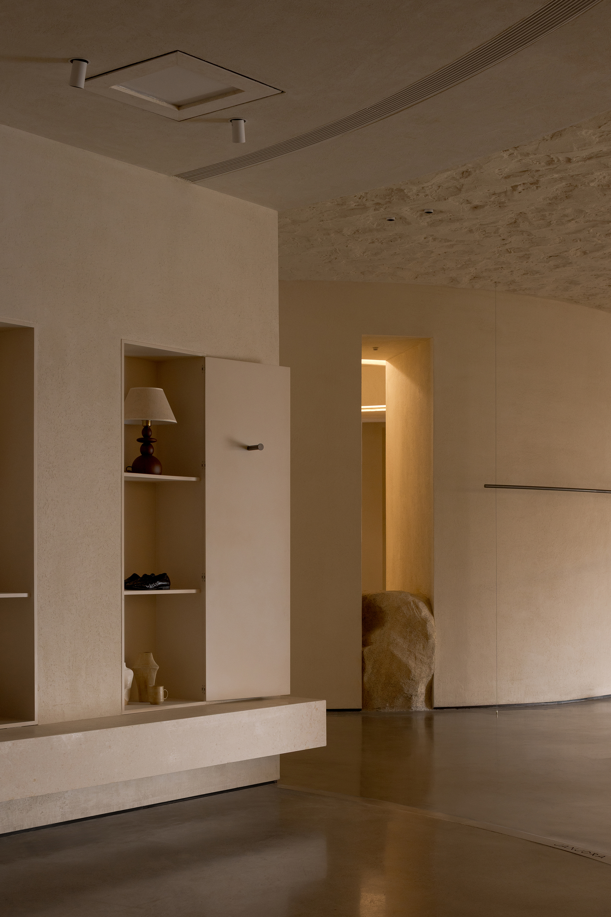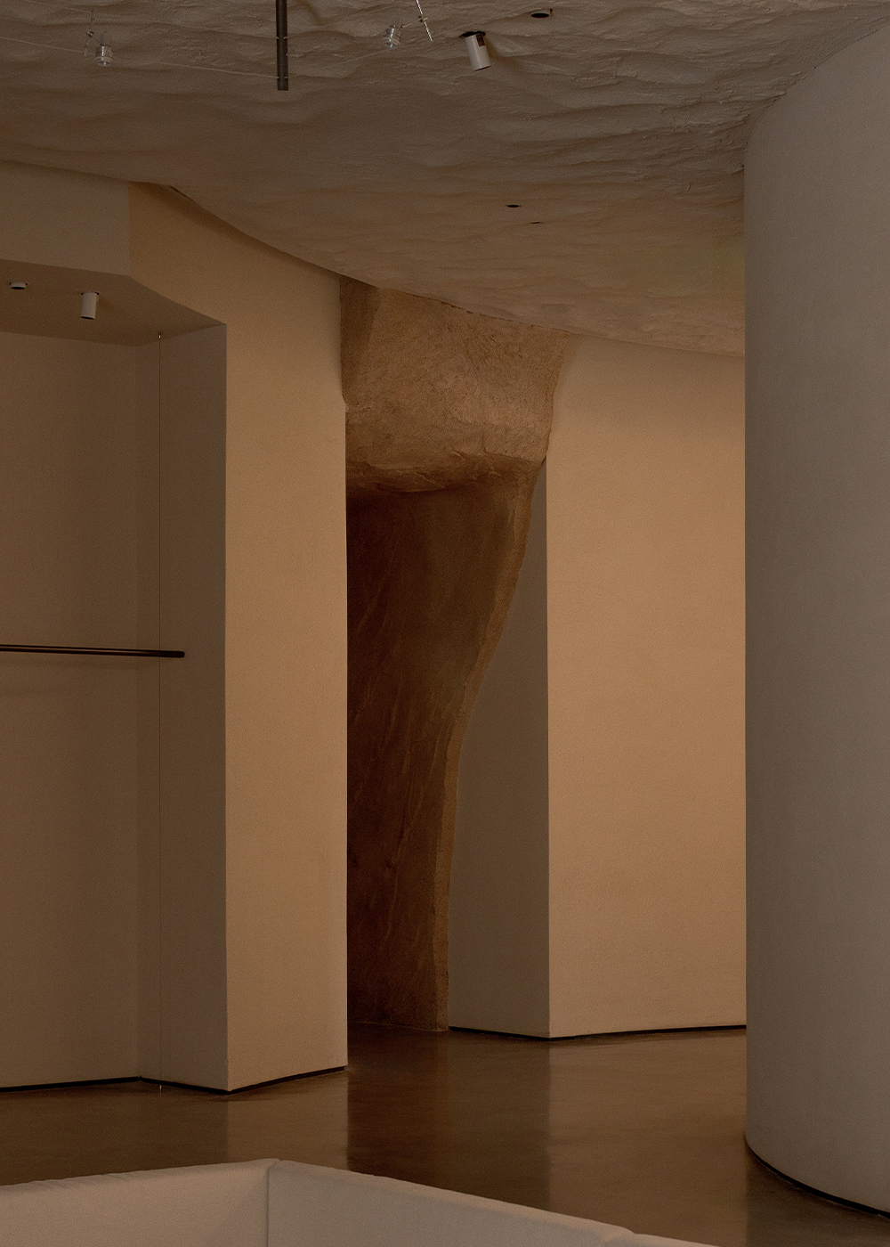 Each step is an angular volume of light and shadow, chiseled by time and light, where brightness and darkness interweave in harmony. As one ascends the stairs, footsteps tap gently against the texture of the space. In the rhythm of rising and advancing, a spiritual dialogue with the spatial scale unfolds. This staircase is not only the core circulation route linking the first and second floors, but also an ingenious design that subtly conceals the store’s exit. The fluid, spiraling lines effortlessly draw the eye upward to the corridor space on the second floor. Following this graceful flow, visitors climb slowly and wander at ease, as if stepping into a meticulously curated aesthetic journey. The small cantilevered corridor along the way offers a tranquil haven for busy urban women. Here, they can pause to catch their breath, confide their innermost thoughts, and listen to their own hearts—allowing the space to transform into a tender vessel for emotions.