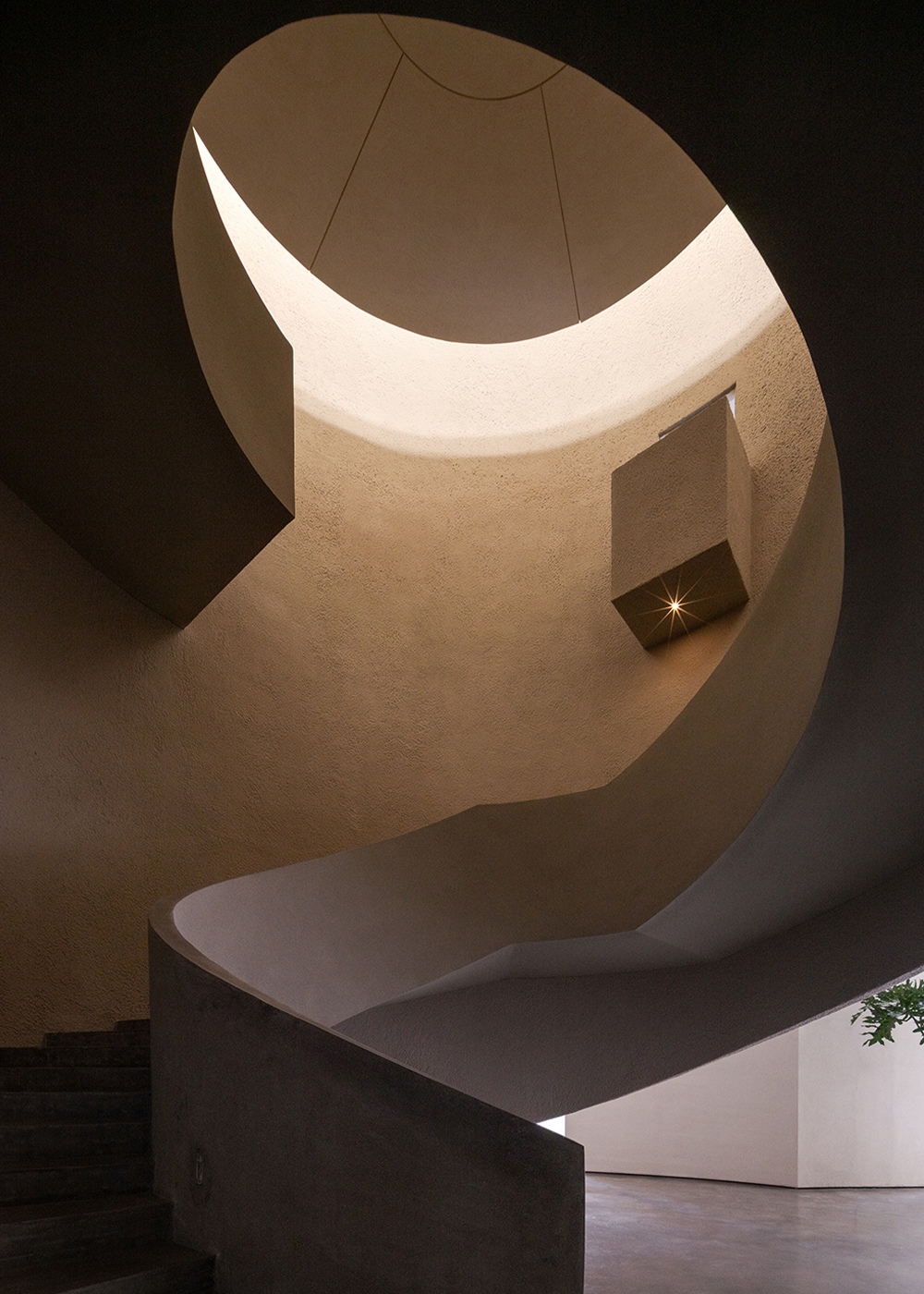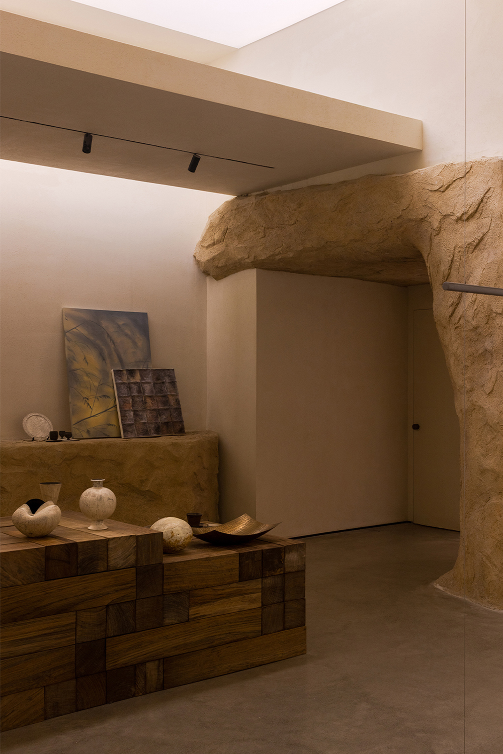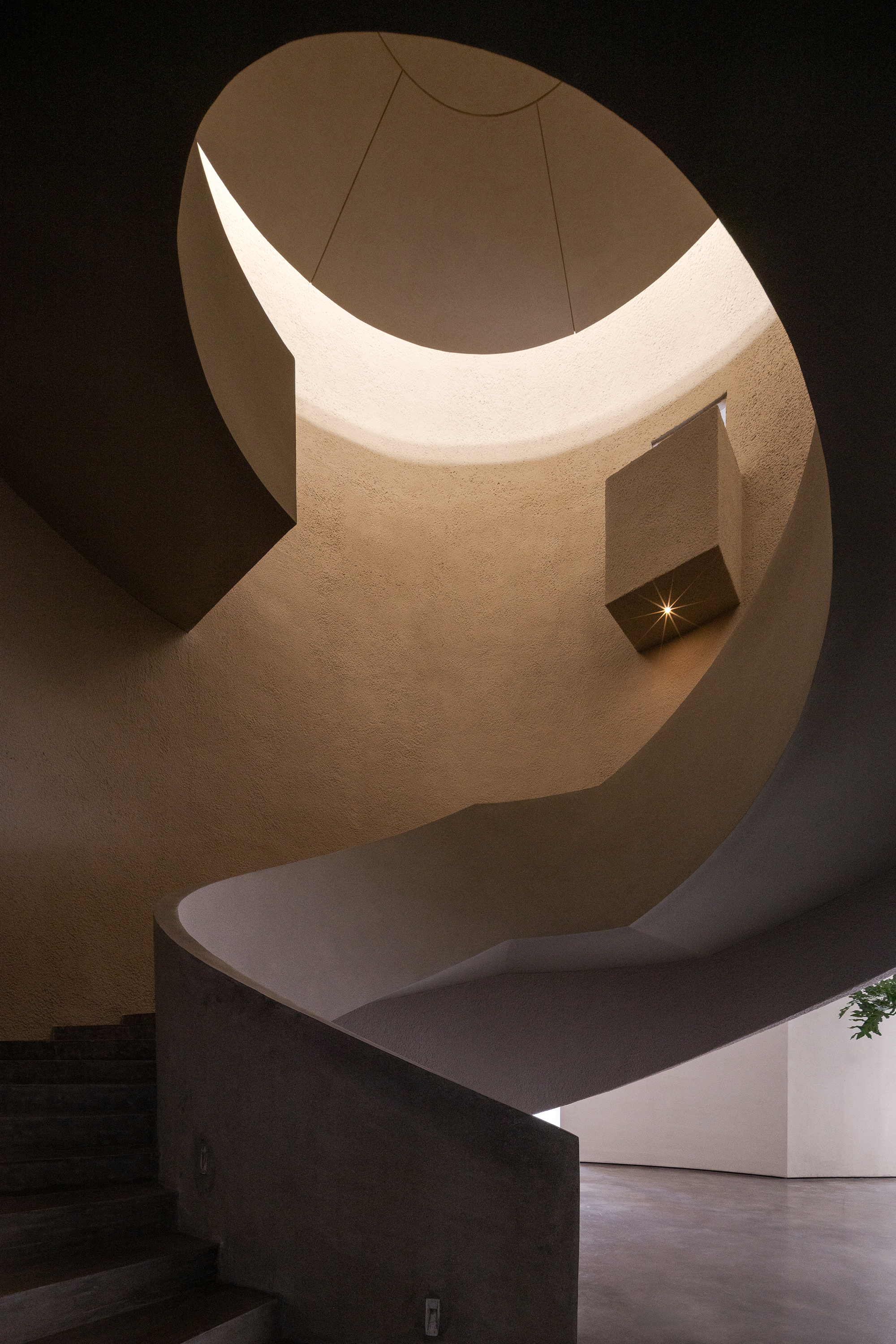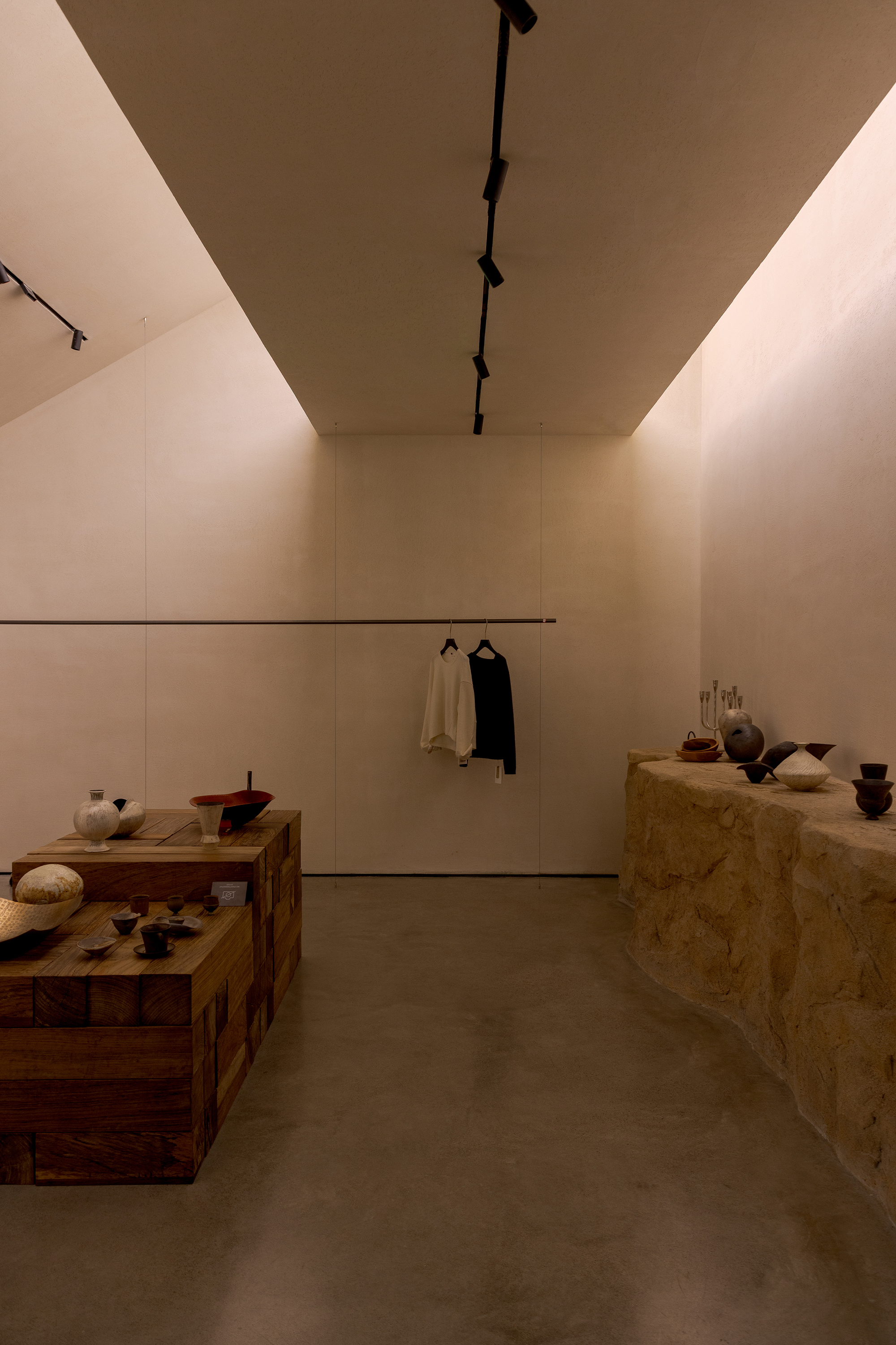 Each step is an angular volume of light and shadow, chiseled by time and light, where brightness and darkness interweave in harmony. As one ascends the stairs, footsteps tap gently against the texture of the space. In the rhythm of rising and advancing, a spiritual dialogue with the spatial scale unfolds. This staircase is not only the core circulation route linking the first and second floors, but also an ingenious design that subtly conceals the store’s exit. The fluid, spiraling lines effortlessly draw the eye upward to the corridor space on the second floor. Following this graceful flow, visitors climb slowly and wander at ease, as if stepping into a meticulously curated aesthetic journey. The small cantilevered corridor along the way offers a tranquil haven for busy urban women. Here, they can pause to catch their breath, confide their innermost thoughts, and listen to their own hearts—allowing the space to transform into a tender vessel for emotions.