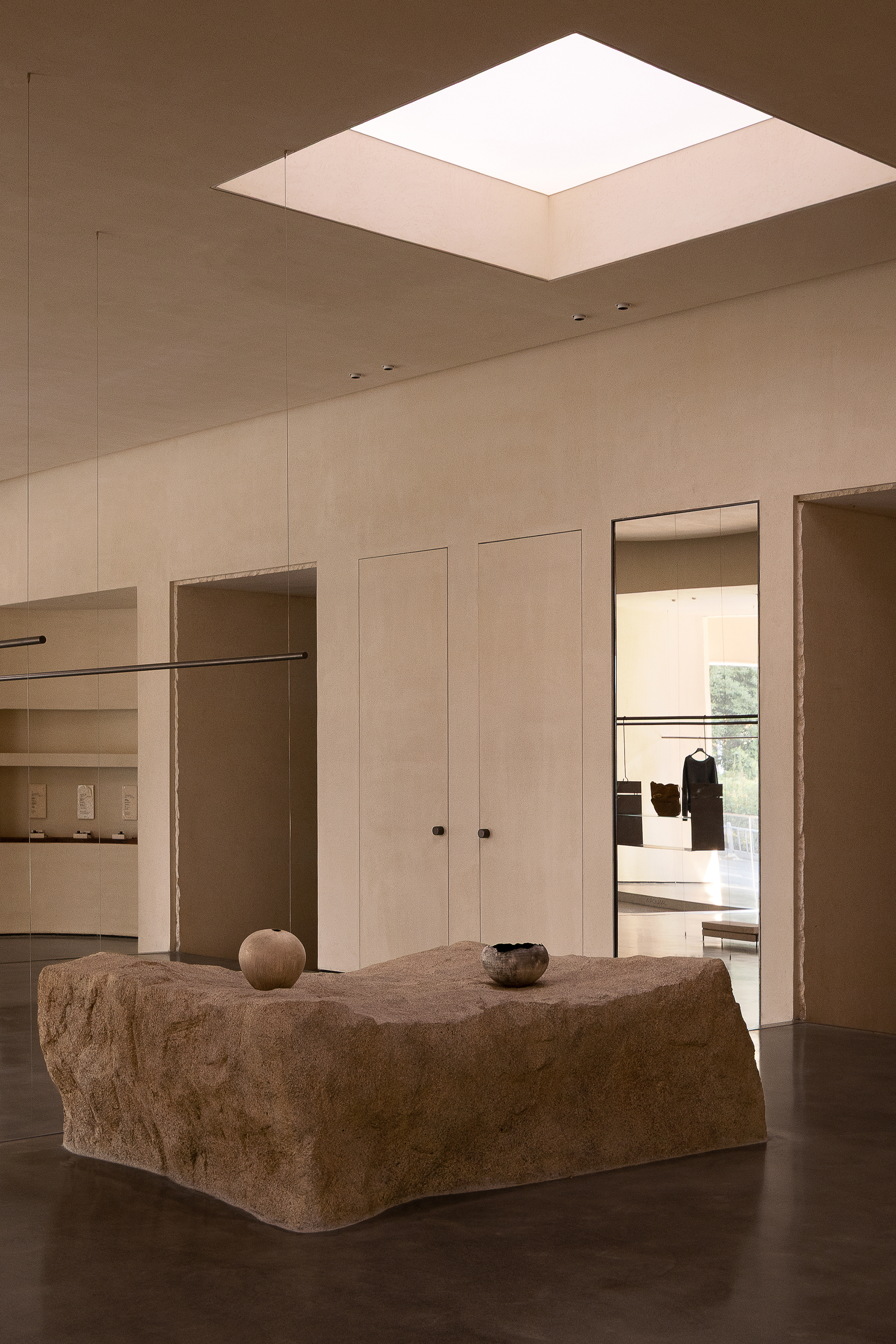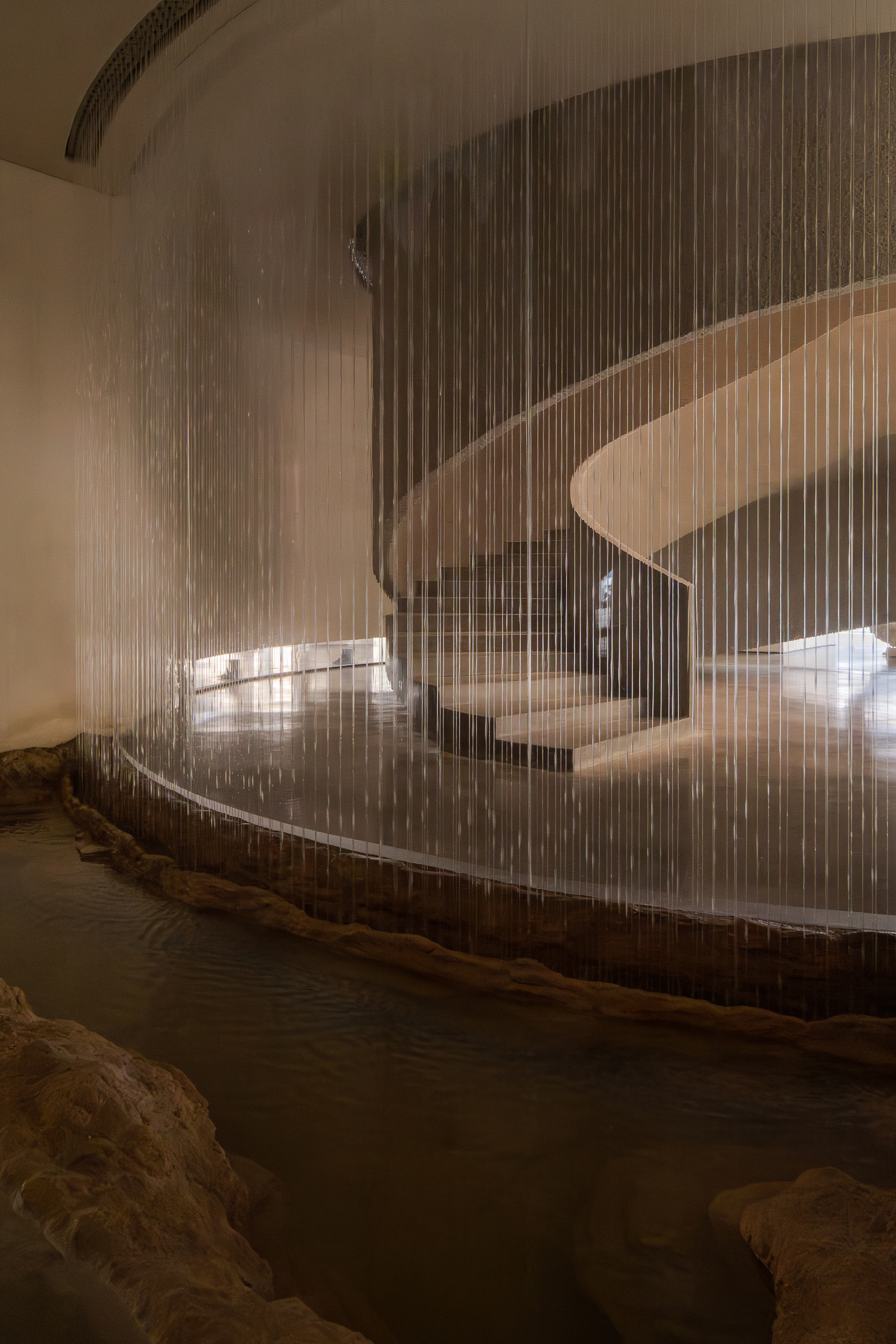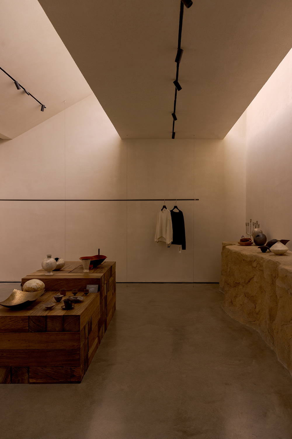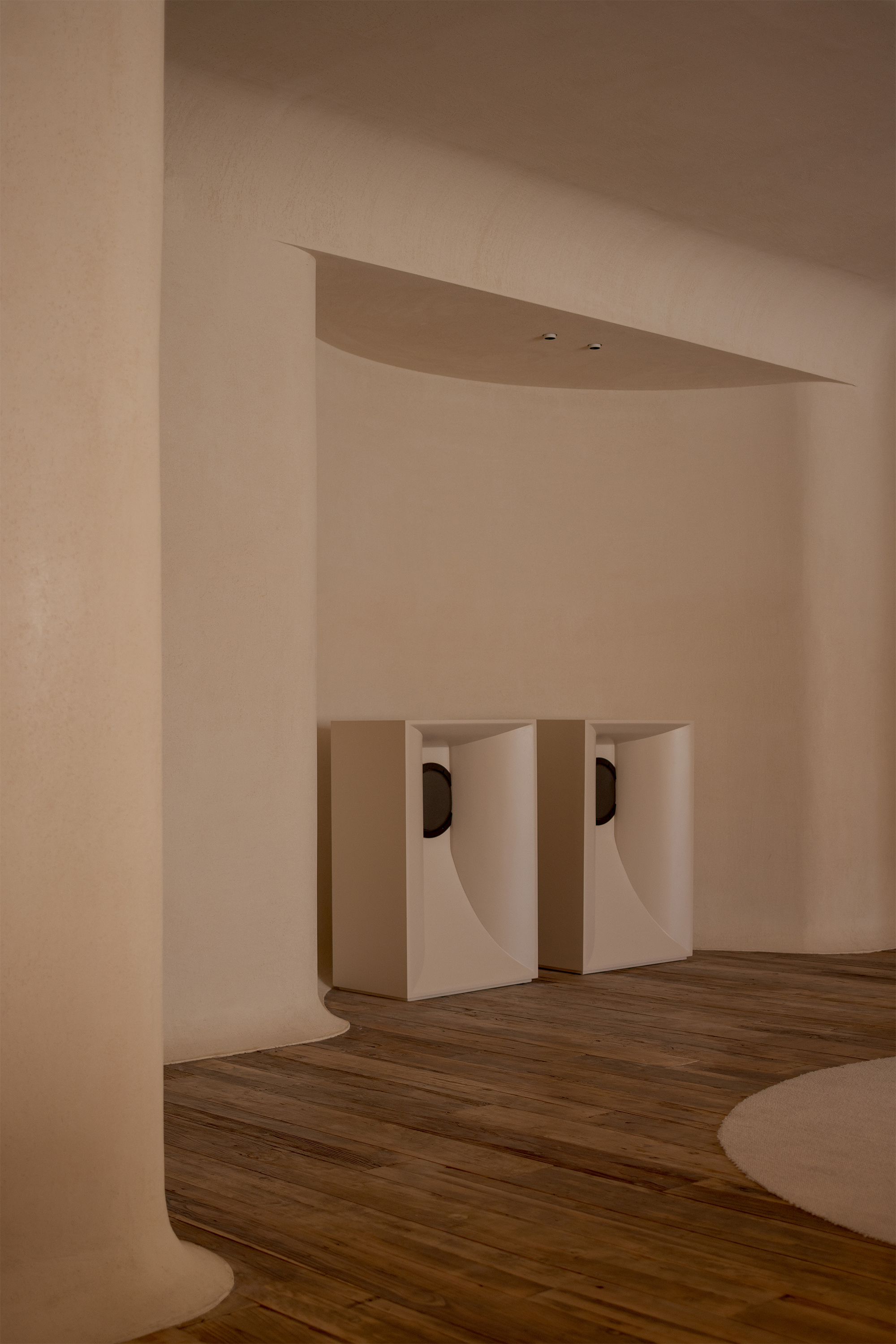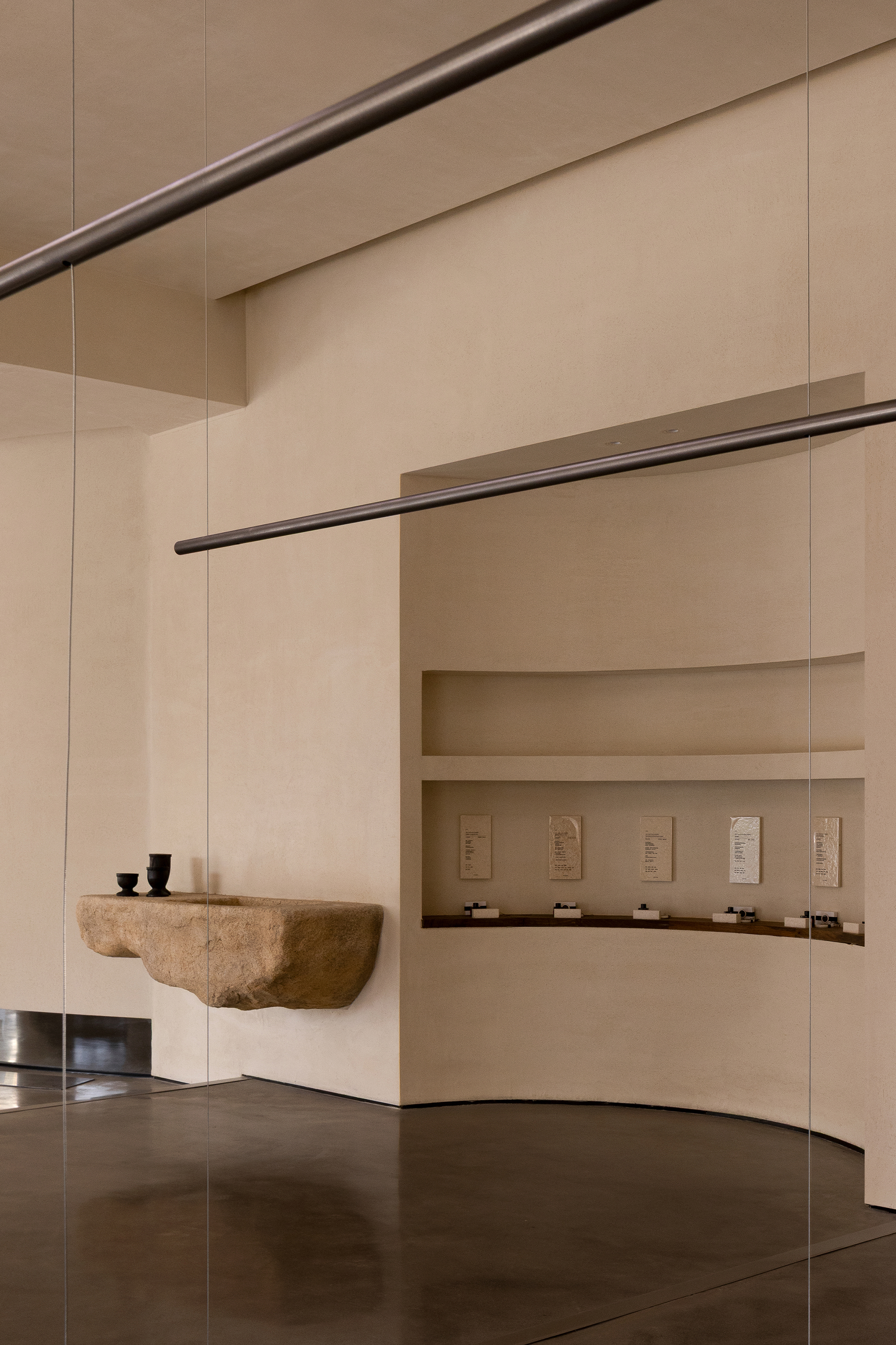 Each step is an angular volume of light and shadow, chiseled by time and light, where brightness and darkness interweave in harmony. As one ascends the stairs, footsteps tap gently against the texture of the space. In the rhythm of rising and advancing, a spiritual dialogue with the spatial scale unfolds. This staircase is not only the core circulation route linking the first and second floors, but also an ingenious design that subtly conceals the store’s exit. The fluid, spiraling lines effortlessly draw the eye upward to the corridor space on the second floor. Following this graceful flow, visitors climb slowly and wander at ease, as if stepping into a meticulously curated aesthetic journey. The small cantilevered corridor along the way offers a tranquil haven for busy urban women. Here, they can pause to catch their breath, confide their innermost thoughts, and listen to their own hearts—allowing the space to transform into a tender vessel for emotions.