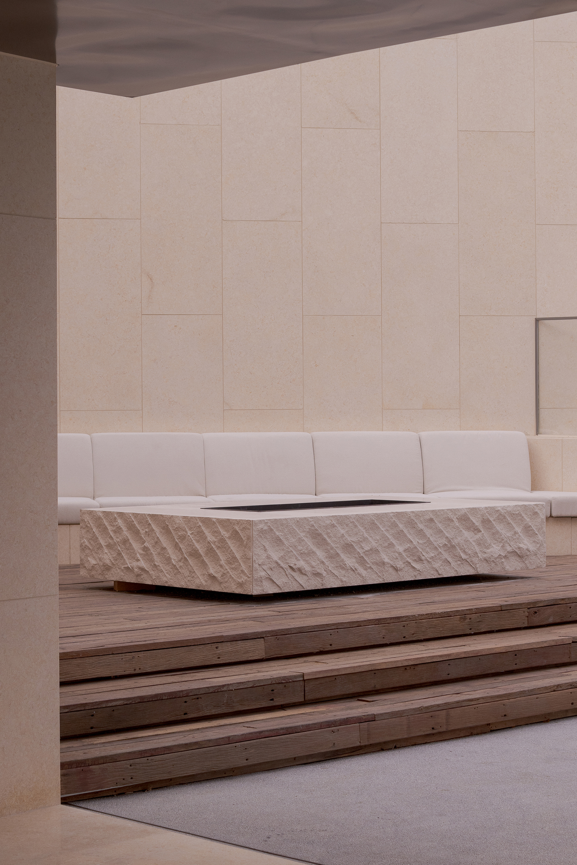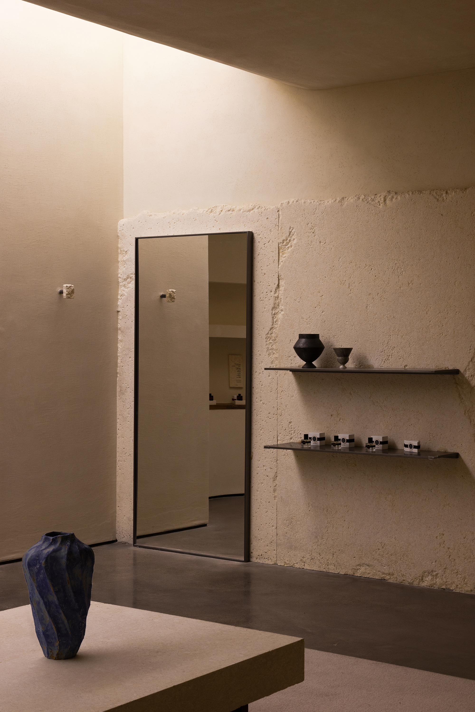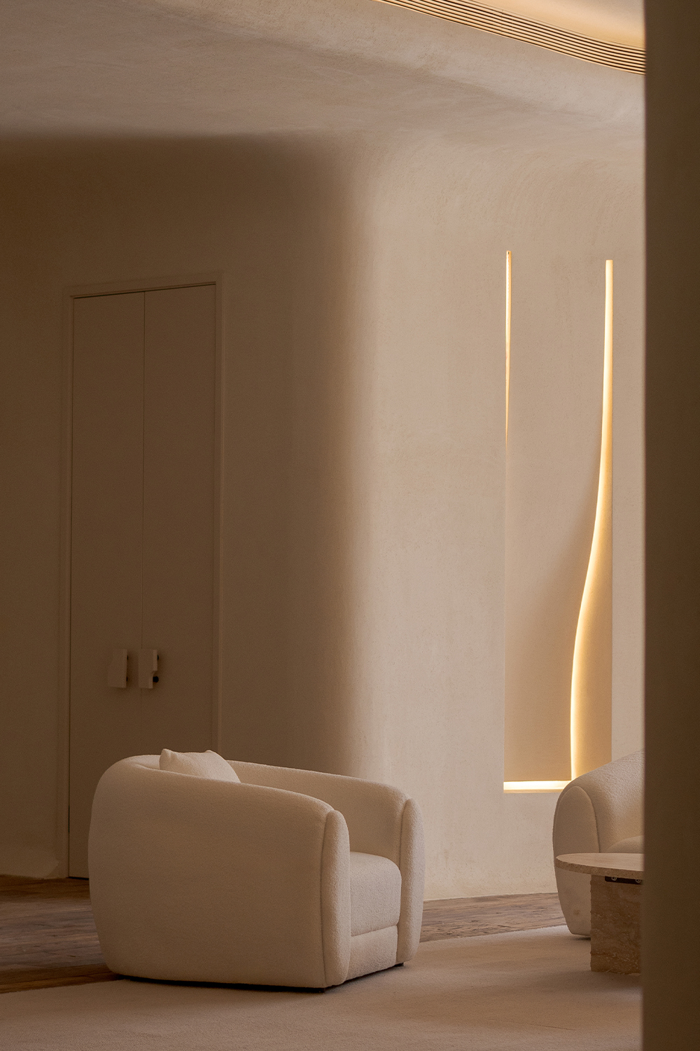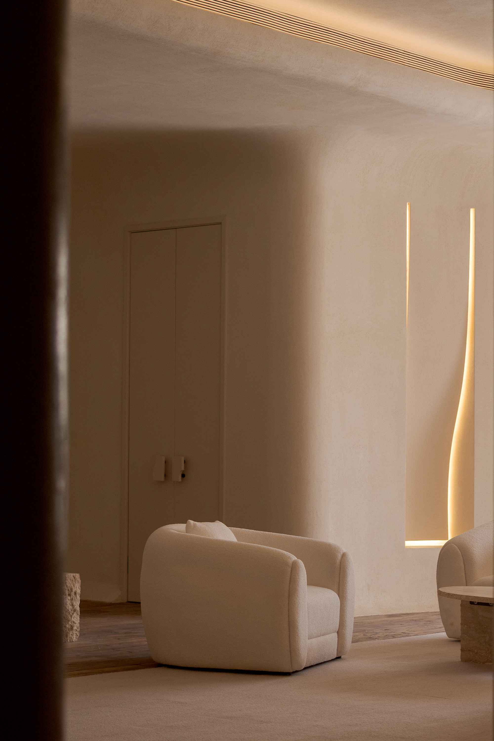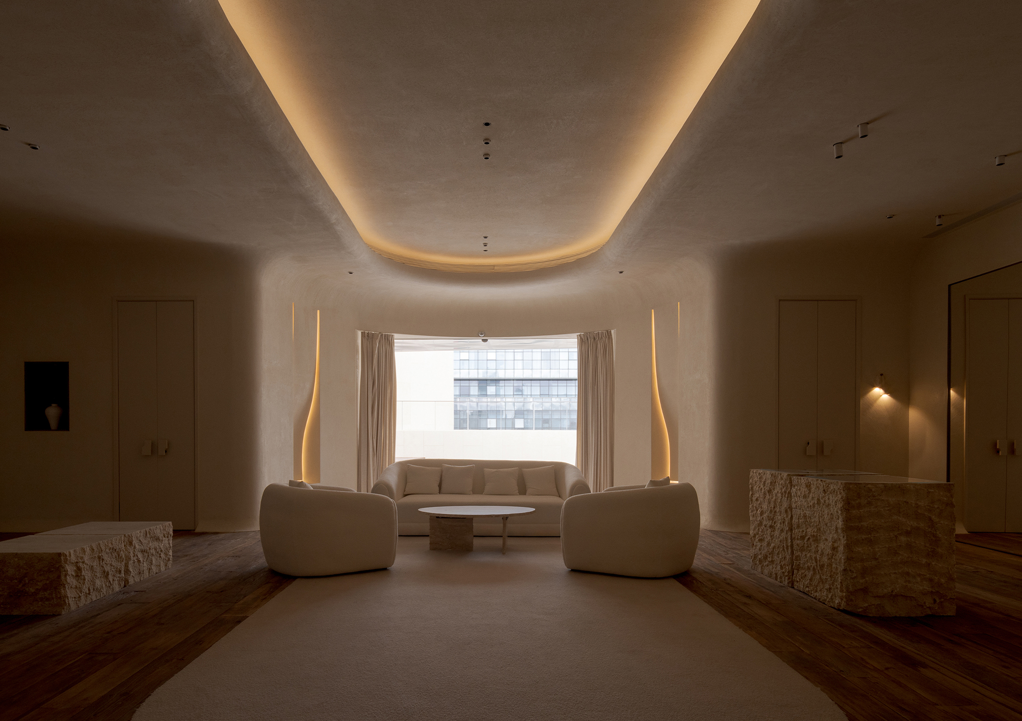 When light and shadow drift across the walls, the interlaced tracks of light and shade are just like the ripples of surging sea waves, spreading gently in the space. At the same time, a faint sea salt fragrance lingers quietly, extending visual perception to the olfactory dimension and realizing multi-dimensional sensory linkage, making the entire space resemble a reef cluster perched on the sea surface, tranquil yet powerful.