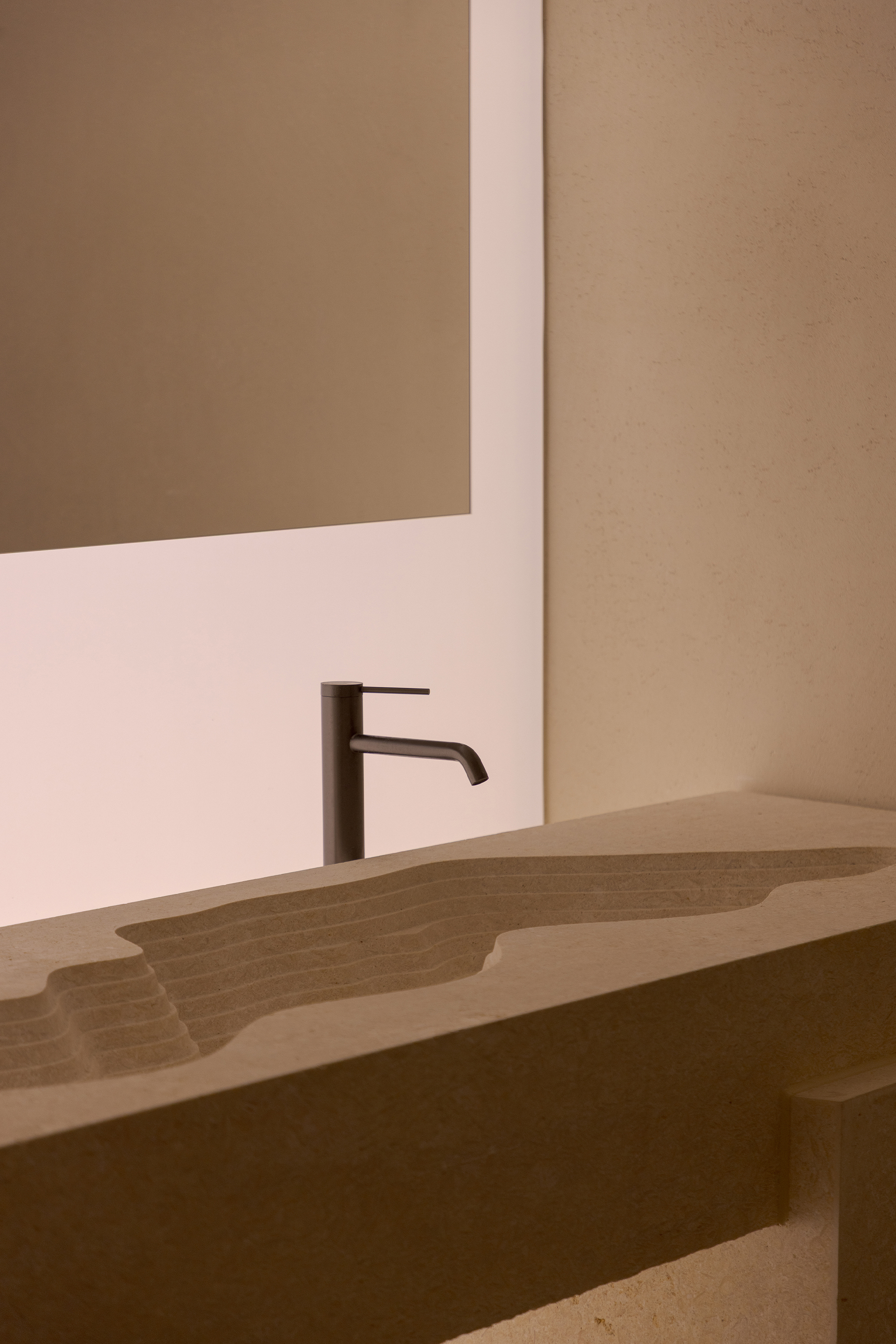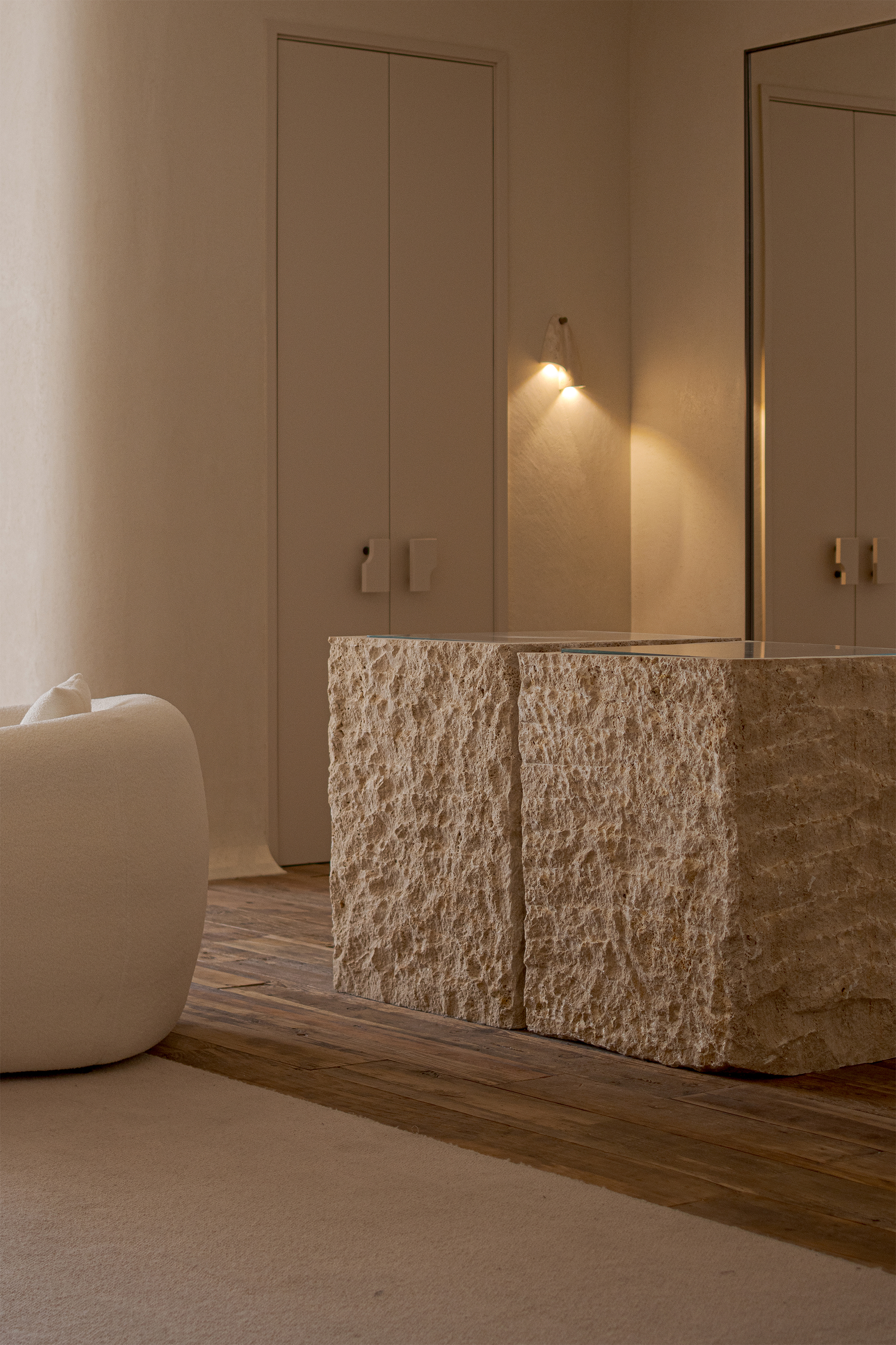 The main feature wall takes large-area rough-textured reefs as the core imagery, directly integrating the original textural quality of the ocean into the spatial narrative. Its rough texture forms a striking visual dialogue with the delicate blank walls around it. Between the hardness and softness, it outlines the layering and sense of rhythm of the space.