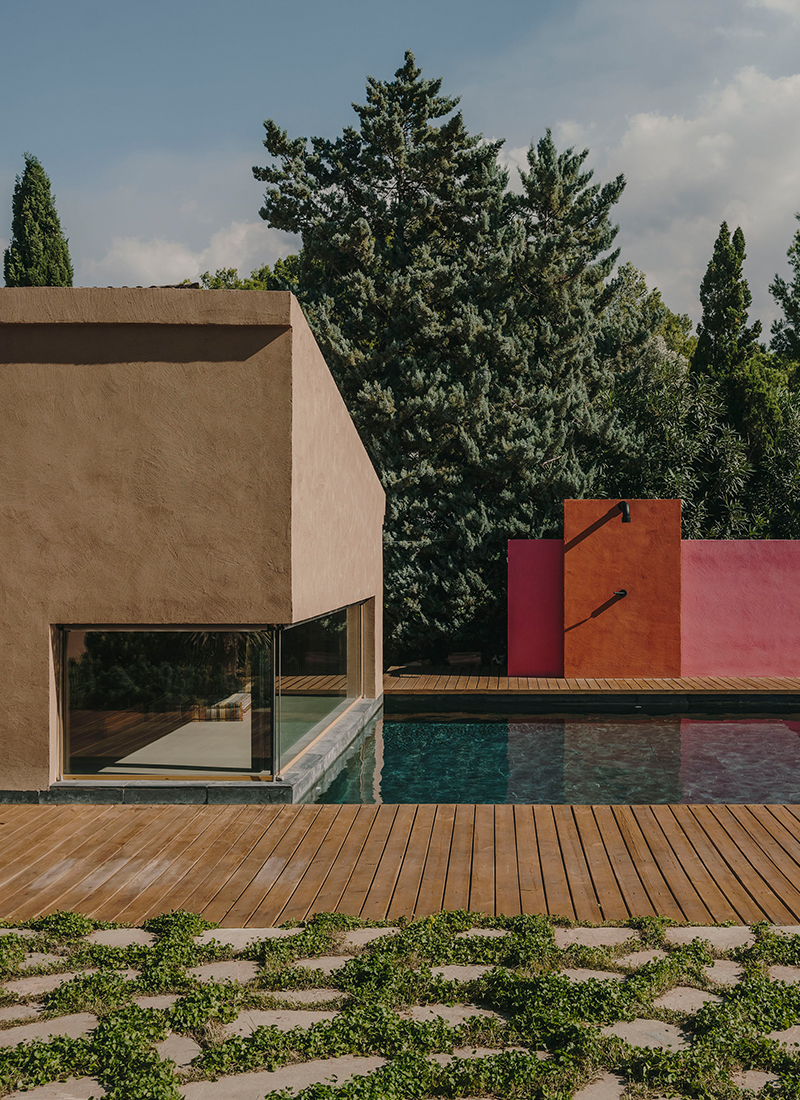 The design uses pure and orderly geometric forms as its language, outlining the boundaries of space within rationality and order, while forming a sharp contrast with the original wild vegetation on the site. -