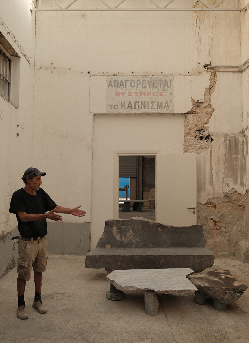 In his practice, Psychoyos works exclusively with “found stones” recovered from factories or old quarries—often discarded production offcuts, marble end pieces, or broken fragments. He makes minimal modifications to these materials, choosing instead to value the traces left by human processing and natural erosion. By combining polished surfaces with raw stone—for example, using machine-cut planes as benches, cylindrical stone blocks as table legs, or joining smooth marble masses with hand-hammered rocks to form chairs—his works embody an aesthetic that is at once primal and resistant to embellishment. These seemingly heavy, immovable objects are deliberately designed to alter the way people move within a space, compelling viewers to adapt themselves anew to their environment. As Psychoyos illustrates with his metaphor, “to sit in the shade of a tree, there’s no need to plant another”—it is through mere presence itself that behavior can be guided.