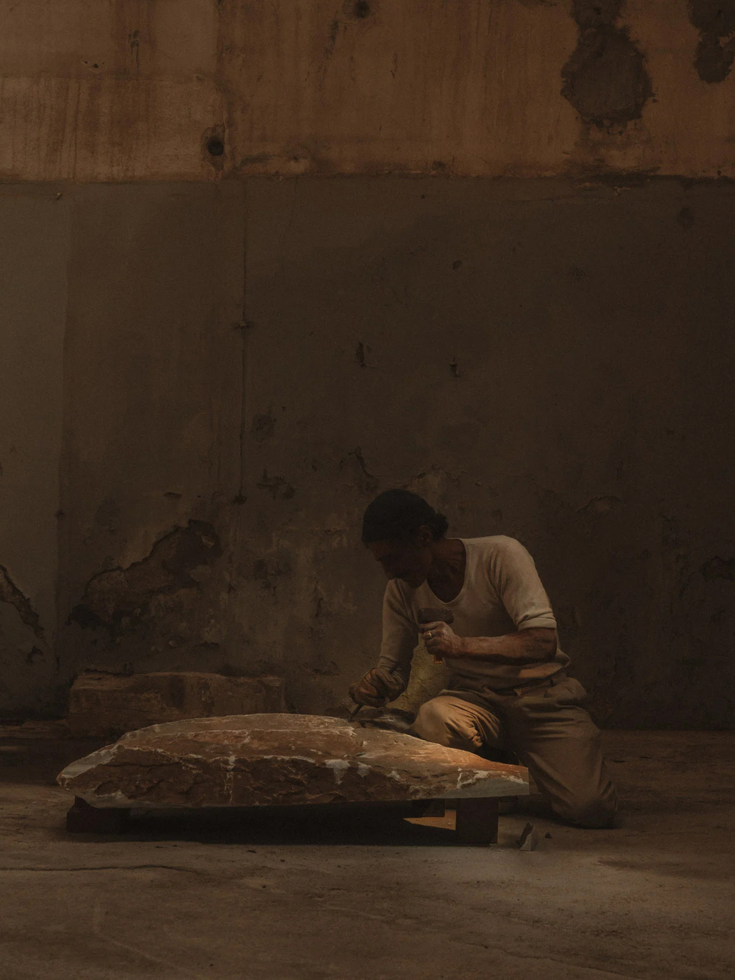 Athenian artist Theodore Psychoyos's practice revolves around the forces of material gravity. His works combine primitive forms with smooth surfaces, exploring the delicate relationship between gravity and balance through their dialogue. Often manifesting in the material form of stools, benches, and tables, his works imbue themselves with a sense of heaviness, challenging our adaptation to our surroundings.
