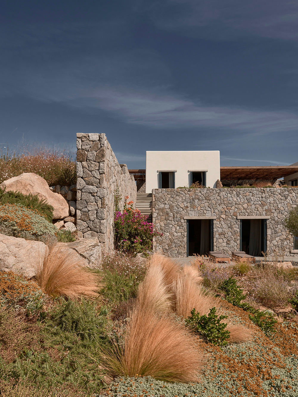 Tucked away on the Aleomandra ridge in Mykonos, the six-bedroom, pristine white volume appears to emerge from the rock formations. The building unfolds as a trio: two geometric cubes painted in traditional limewash and a rough, locally sourced stone base enclose a central courtyard. A lightweight chestnut latticework cantilevers over the courtyard, creating a 700-square-meter "canvas of light and shadow," framing the Mykonos sunset as a dynamic mural. A stone retaining wall acts as a natural barrier, shielding the property from the road behind while also channeling the sea breeze through the residence.