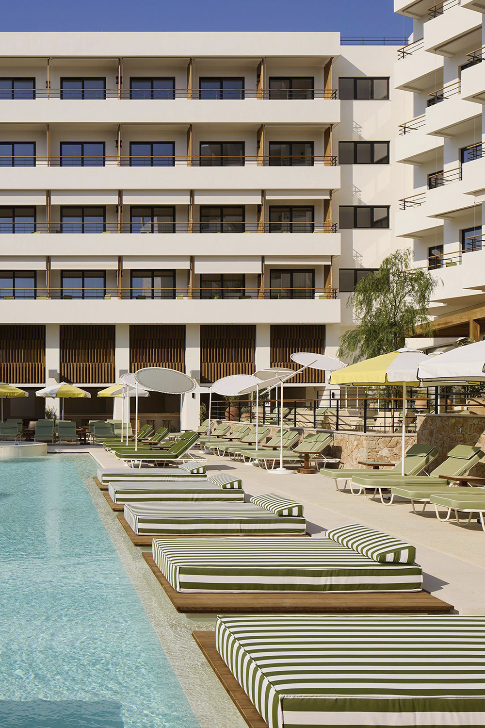 The American lifestyle hotel brand Ace Hotel has chosen Athens’ Glyfada waterfront for its first property in Greece, transforming the 1972 Brutalist Fenix Hotel through the vision of French studio Ciguë. The architects stripped away redundant later additions, returning to the geometric concrete core and redefining its white texture through cantilevered cubic balconies. A four-story poolside mural pays homage to David Hockney, fusing the raw Brutalist frame with the free-spirited essence of coastal hippie culture.
